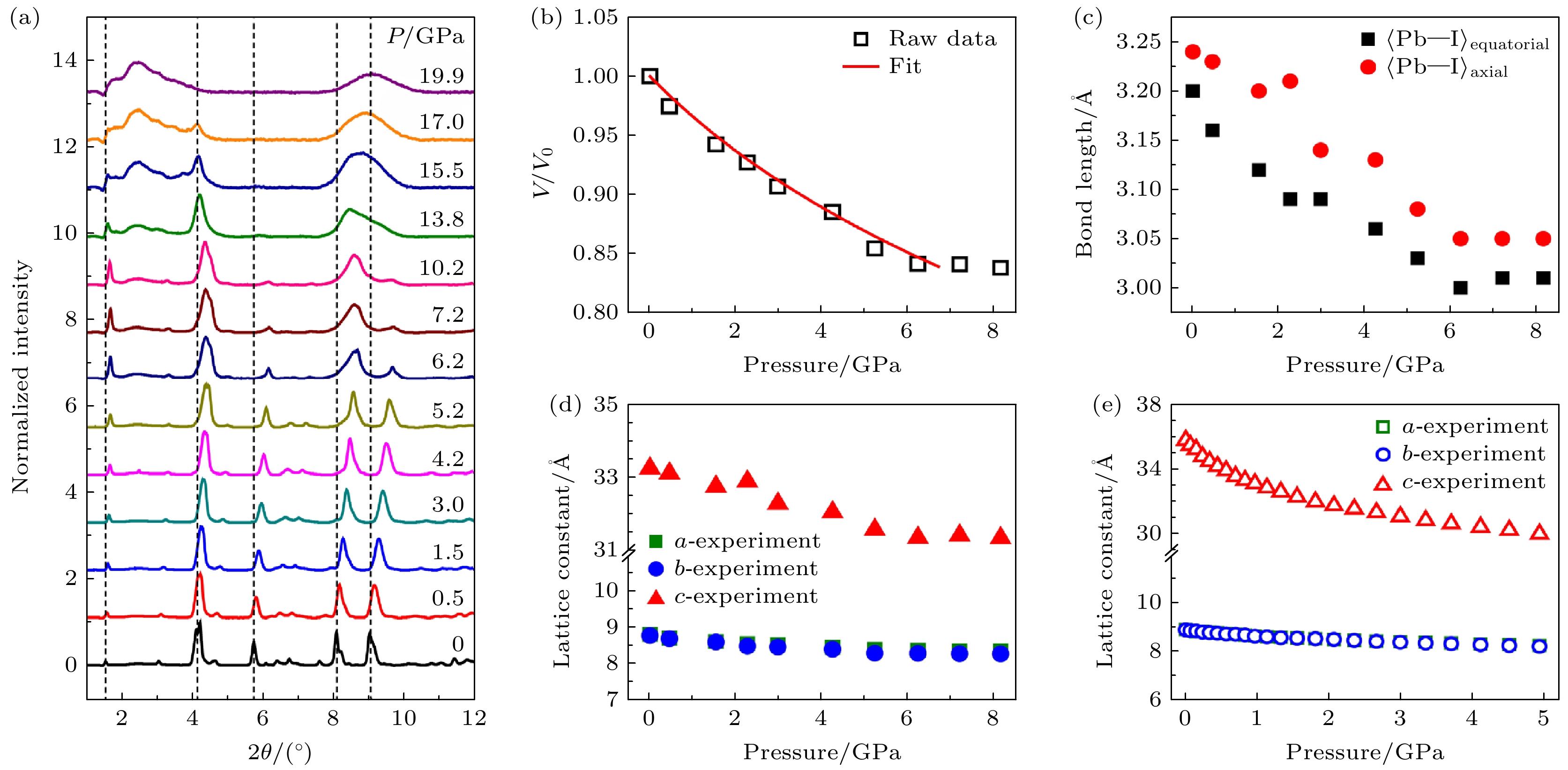 Fig. 5. Structural evolution and strongly anisotropic compression of (PEA)2PbI4 under pressure: (a) Synchrotron radiation XRD spectra of 2D perovskite under pressure; (b) pressure dependence of unit cell volume; (c) pressure dependence of the Pb─I bond length, which is slightly different in in-plane ($ \langle{\text{Pb─I}}\rangle_{{\mathrm{equatorial}}}$) and out-of-plane ($\langle{\text{Pb─I}}\rangle_{{\mathrm{axial}}} $) directions; (d) pressure dependence of unit cell parameters: a, b, and c; (e) identical pressure dependence of a, b, and c is confirmed by first-principles calculation, which enhances the observation of anisotropic compression[45].