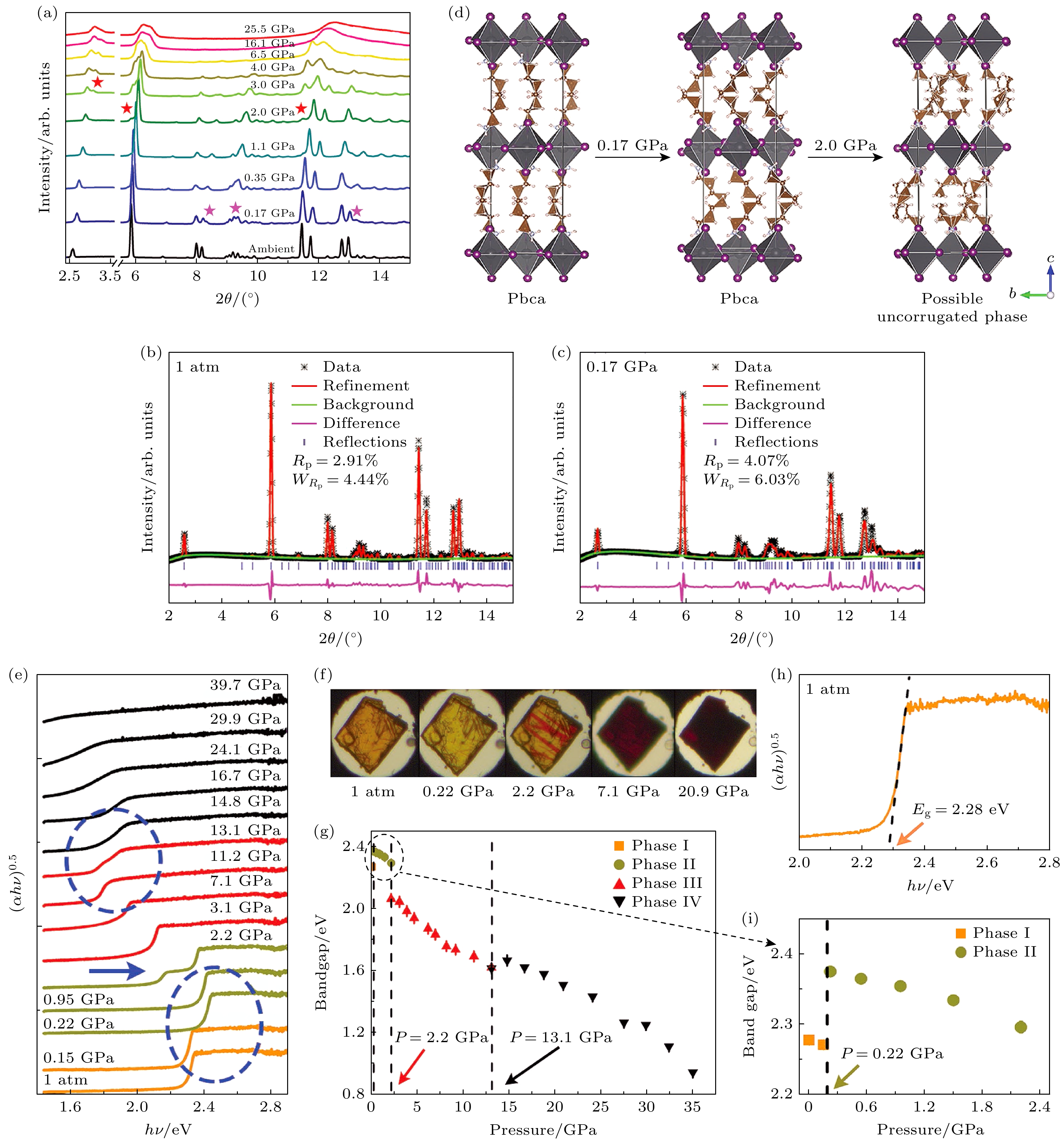 Fig. 6. (a) In situ XRD measurements of (BA)2PbI4 under high pressures; (b), (c) detailed variations of the first and second transition; (d) schematic crystal structures of (BA)2 PbI4 before and after the first phase transition; (e) in situ high-pressure absorption spectra of (BA)2PbI4; (f) optical images of (BA)2PbI4 at selected pressures; (g) variations of the (BA)2PbI4 band gap as a function of pressure; (h) the absorption spectrum of (BA)2PbI4 at ambient conditions; (i) variations of the of (BA)2PbI4 band gap below 2.2 GPa[52].