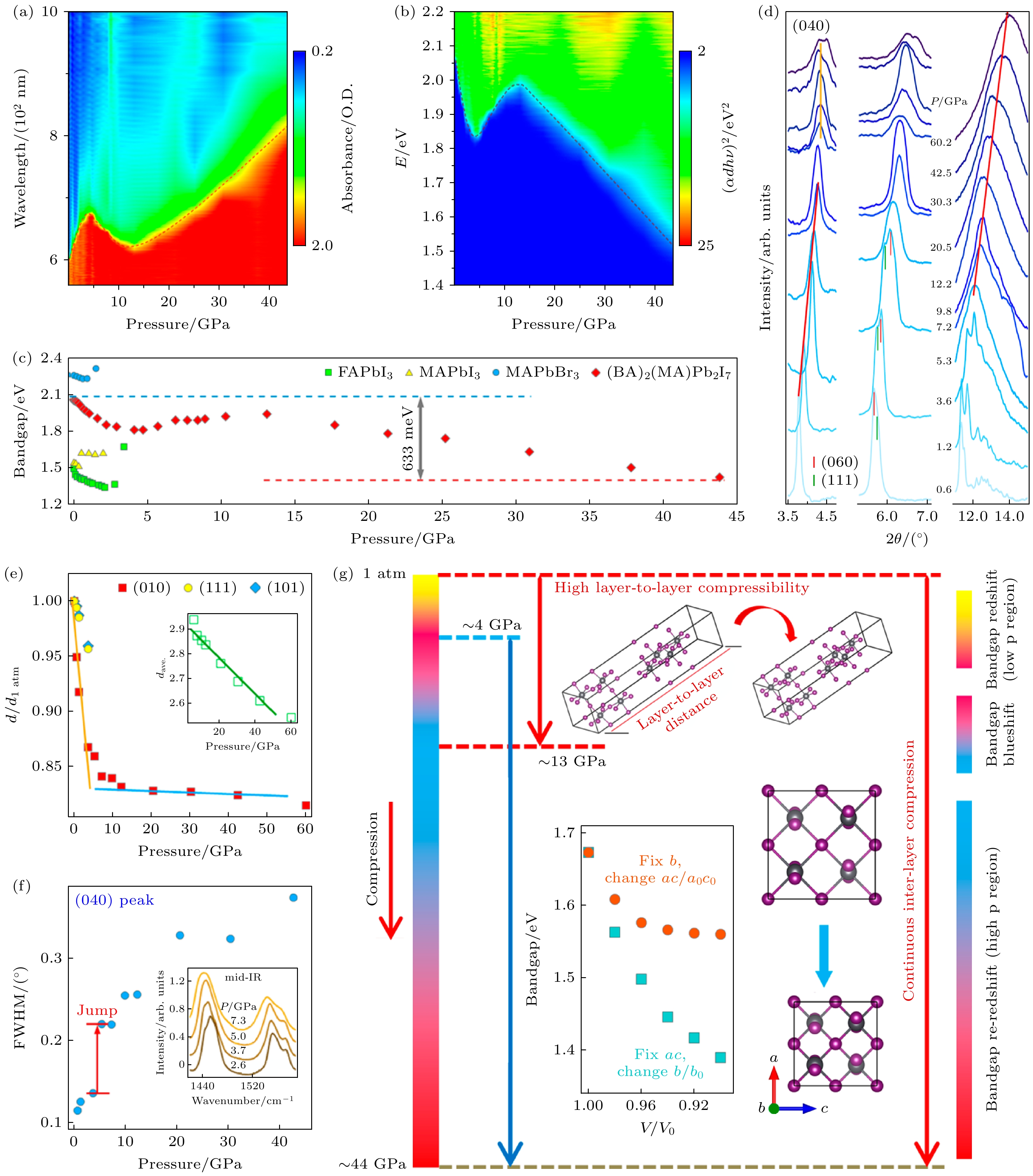 Fig. 7. In situ high-pressure optical absorption measurements of (BA)2(MA)Pb2I7: (a) color plots of pressure-dependent optical absorbance spectra, (b) color plots of pressure-dependent (αdhν)2 versus photon energy; (c) summary of the pressure dependence of the bandgap for various hybrid perovskites (d)–(f) in situ high-pressure structural characterizations on (BA)2(MA)Pb2I7: (d) high-pressure synchrotron XRD patterns at various 2 theta ranges, (e) pressure dependence of the d-spacing, the inset shows the pressure dependence of dave, (f) pressure-induced atomic distortions evidenced by broadened XRD; (g) structural origin of bandgap evolution in compression[54].