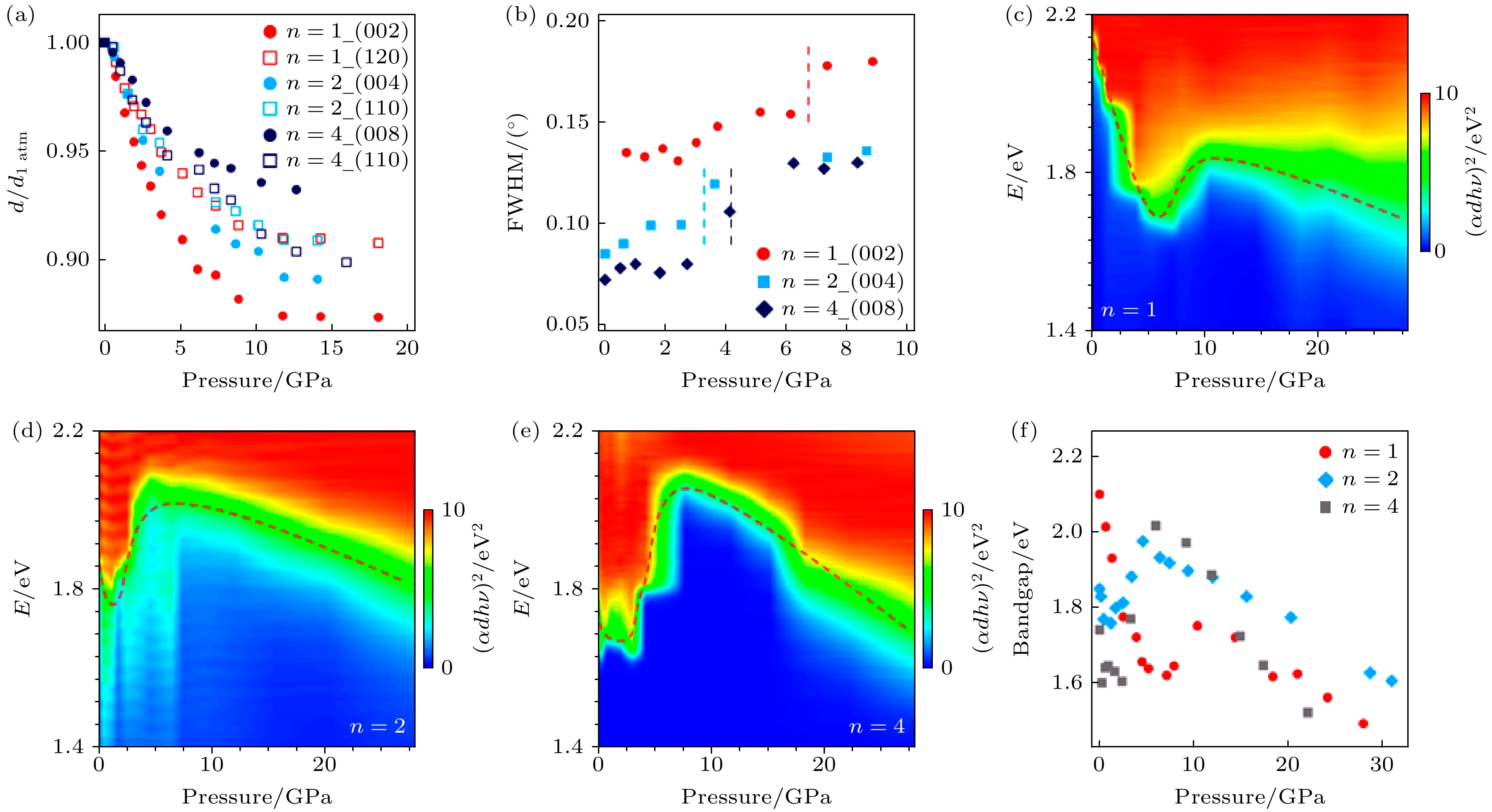 Fig. 8. (a) Evolution of normalized lattice spacing of (3AMP)(MA)n–1PbnI3n+1(n = 1, 2, 4); (b) FWHM as a function of pressure for different lattice planes; contour plots of optical absorbance of n = 1 (c), n = 2 (d) n = 4 (e); (f) summary of bandgap evolutions of (3AMP)(MA)n–1PbnI3n+1(n = 1, 2, 4) [56].