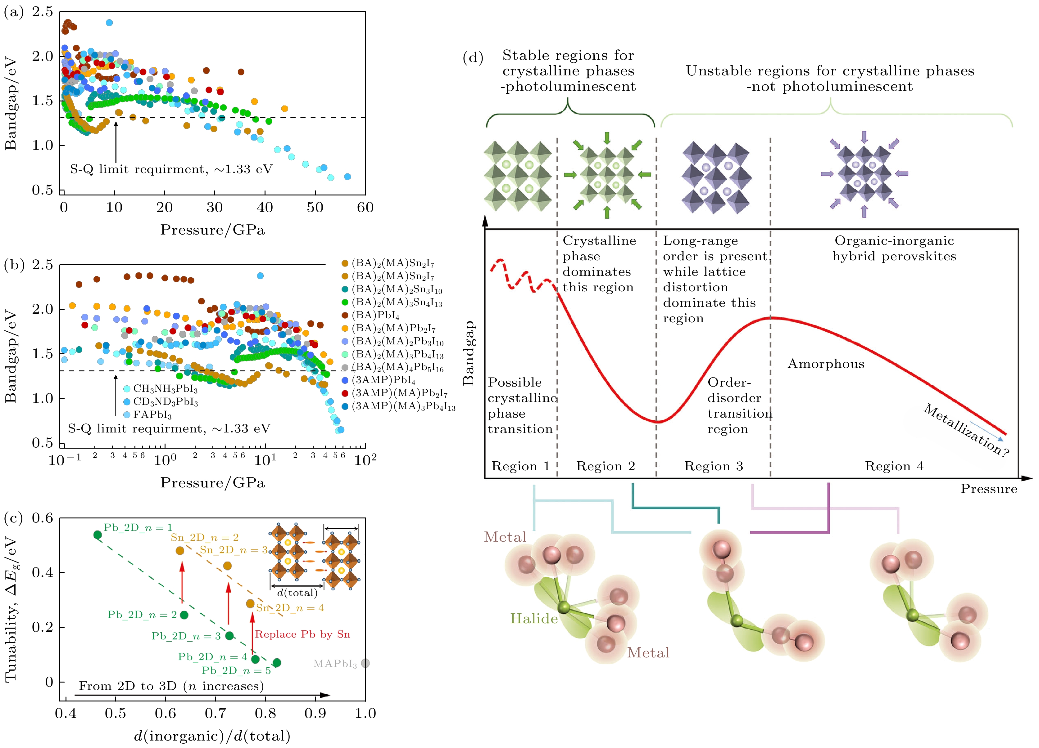 Fig. 9. (a), (b) Comparison of pressure-driven bandgap evolution between various hybrid perovskites, the dashed line represents the Shockley–Queisser optimal magnitude (≈1.33 eV), for pressure axis, (a), (b) use linear and log scale, respectively, where the latter shows more details in low-pressure region; (c) bandgap tunability of 2D and 3D perovskites as a function of inorganic layer thickness/total unit cell length along the longitudinal direction; (d) a schematic diagram and illustration for hybrid perovskites under high pressures[57].