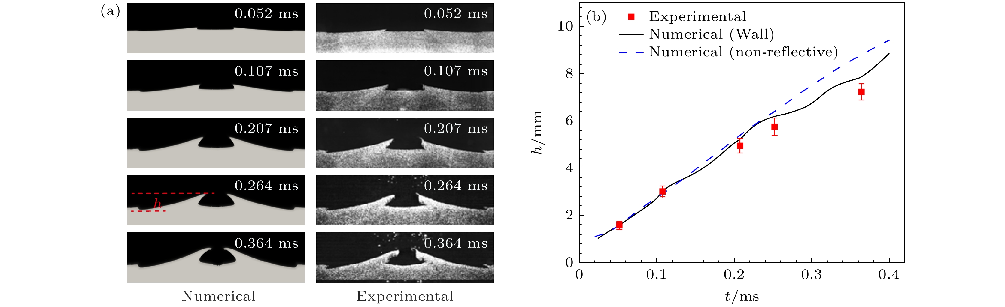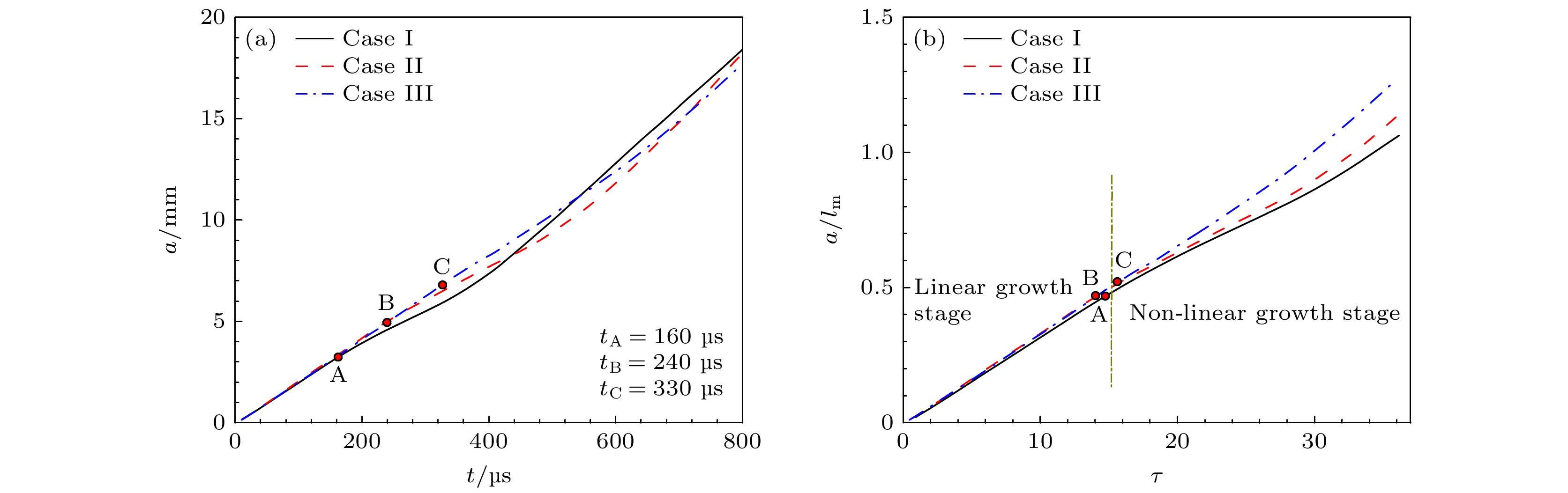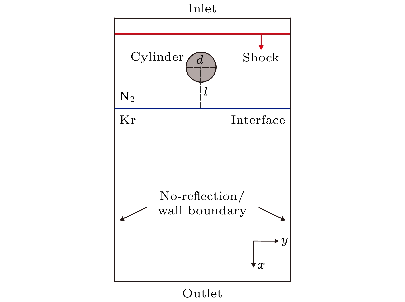 针对实际应用中由非均匀激波驱动的界面失稳问题, 开展了马赫反射波系与平面气体界面相互作用的机理研究, 重点探讨了马赫杆尺度效应对界面失稳演化和扰动增长的影响. 结果表明, 马赫反射波系冲击界面时, 通过复杂波系作用在界面上印刻速度扰动, 诱发界面失稳. 随后, 在波后流场非均匀性的影响下, 界面进一步演化形成凹腔和“射流状气泡”结构, 显著区别于经典Richtmyer-Meshkov不稳定性中的尖钉与气泡结构. 扰动振幅的定量分析表明, 界面失稳演化可分为初期线性增长和后期非线性发展两个阶段. 其中, 滑移线弯曲和卷曲射流驱动的界面变形, 是界面演化向非线性阶段转变的关键物理机制. 马赫杆尺度决定了滑移线卷曲和射流形成的特征时间. 在线性阶段, 扰动增长由马赫反射波系的激波强度和入射角度主导, 与马赫杆尺度无关; 而在非线性阶段, 界面扰动增长率随着马赫杆尺度的增大而增大. 基于数值模拟结果对理论模型进行了考察, 结果表明, 现有理论模型可有效地预测马赫反射波系印刻的界面速度扰动, 但无法考虑马赫杆尺度效应和波后非均匀流场的影响. 本研究揭示了界面失稳演化与马赫反射波系激波强度、入射角度及马赫杆尺度之间的内在关系, 对界面扰动增长理论模型的建立具有重要意义.