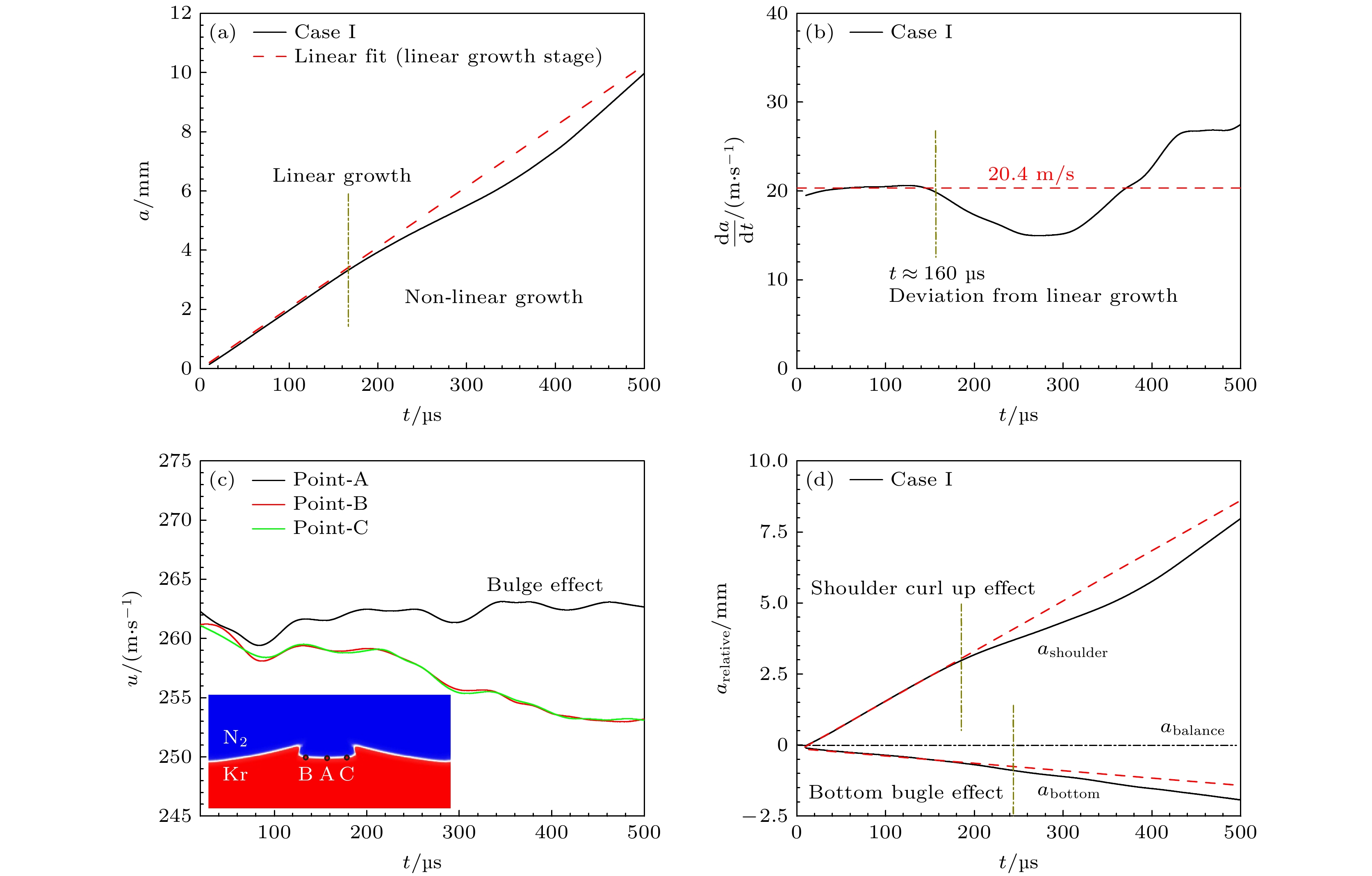 Fig. 9. Quantitative analysis of interface evolution for case Ⅰ: (a) Interface perturbation amplitude; (b) interface perturbation growth rate; (c) the velocity of the bubble head; (d) the height of the cavity shoulder and cavity bottom.