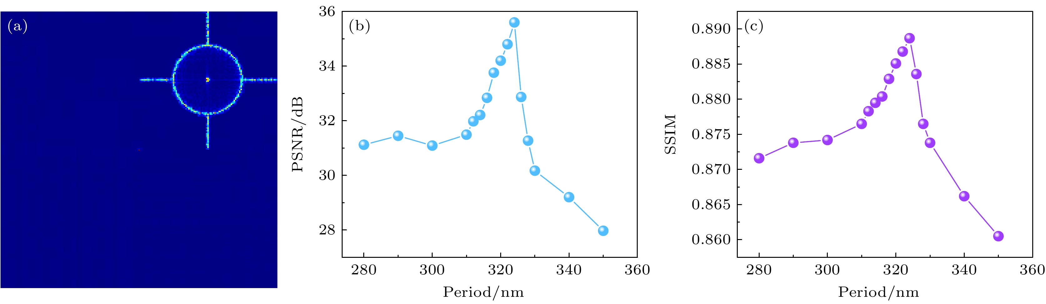 基于平面光学器件的超表面全息图因其在实现光学器件和系统微型化方面的潜力而受到广泛关注. 然而, 传统同轴全息术中固有的零级衍射和双像效应会显著降低成像质量, 限制其在实际应用中的推广. 相比之下, 离轴超表面全息成像具有显著优势. 在离轴超表面全息的设计过程中, 不同周期的单元结构会导致全息图在成像过程中产生图像位置偏移的现象. 为此, 本文研究了单元结构周期对离轴全息成像位置的影响. 采用高透过率的二氧化硅作为基底材料, 以二氧化钛作为相位调控单元, 设计工作波长为635 nm. 数值模拟结果表明, 随着单元结构周期的增加, 全息像的中心位置逐渐靠近成像面的中心区域. 在该设计方案中, 当周期设定为 324 nm时, 全息像能够成像于预设位置. 此外, 分别对不同离轴角度和单元结构高度构建的超表面全息图进行数值模拟分析发现, 成像位置均位于设计位置处, 说明成像位置主要受周期影响. 因此, 可以通过精确调控周期参数, 实现全息图像在预定位置的重建, 从而为高精度全息成像系统设计提供理论依据.Metasurface holography based on planar optical devices has attracted considerable attention due to its potential for miniaturizing optical components and systems. However, traditional on-axis holography has inherent zeroth-order diffraction and twin-image effects, which significantly degrade image quality and limit its practical applications. Off-axis metasurface holography, in contrast, provides a promising solution to overcoming these limitations. In this work, we design a metasurface hologram composed of titanium dioxide (TiO2) nanopillars on a silicon dioxide (SiO2) substrate,by using the high refractive index and low optical loss of TiO2 in the visible light range to achieve efficient phase control. The unit cell height is set to 600 nm to ensure sufficient phase accumulation, and the working wavelength is 635 nm. The hologram is constructed by mapping the continuous 0–2π phase distribution obtained from computational holography onto the unit cell array, and changing the nanopillar diameter to achieve full phase coverage. We systematically investigate the effect of the unit cell period on the imaging position in off-axis holography. Numerical simulations show that as the period increases from 280 nm to 350 nm, the center of the holographic image gradually shifts toward the center of the image plane. The optimal period is found to be 324 nm, at which the image is reconstructed precisely at the designed position. Further simulations using different off-axis angles (0°–45°) and nanopillar heights (600–2000 nm) confirm that the imaging position remains fixed at the target location, indicating that it is mainly determined by the unit cell period rather than other structural parameters. These results demonstrate that by carefully selecting the unit cell period, the holographic image can be accurately reconstructed at a predetermined positions with high image quality, providing theoretical guidance for designing high-precision off-axis metasurface holographic imaging systems.