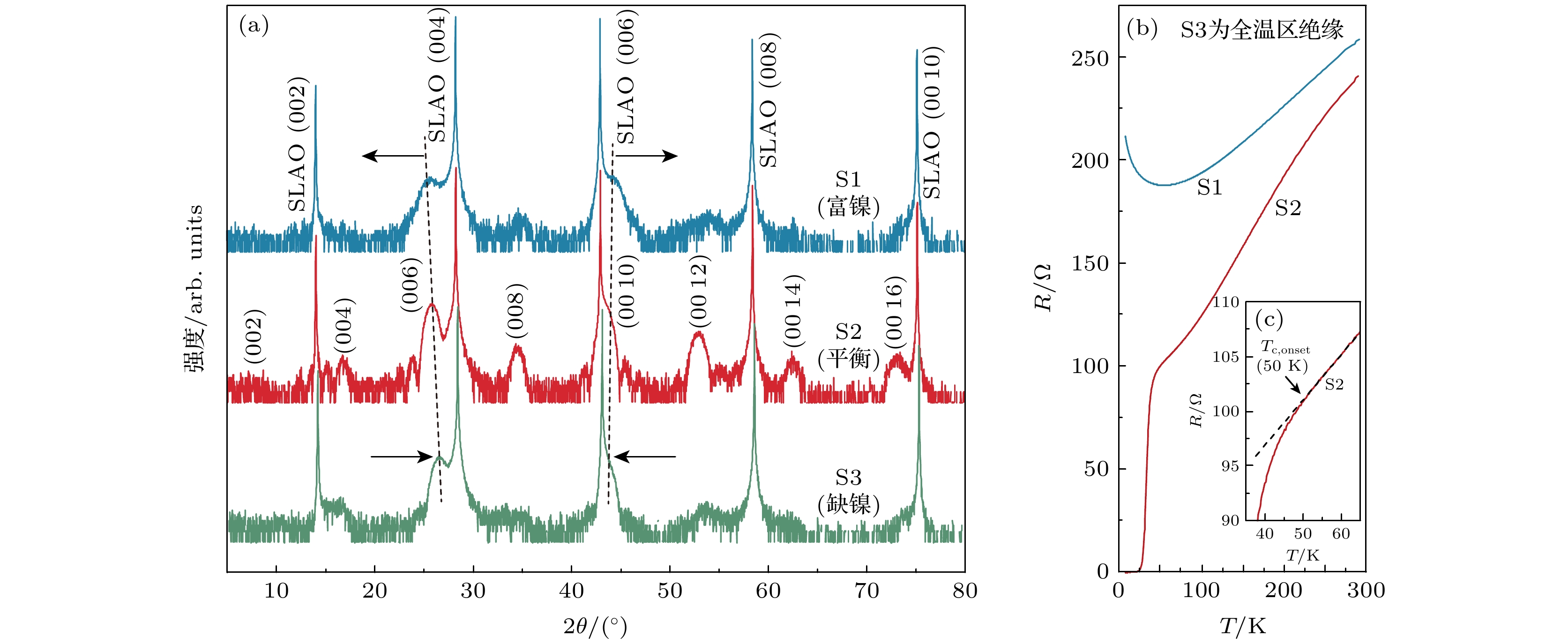 图 2 (a) SLAO衬底上富镍7%(S1)、阳离子化学计量平衡(S2)和缺镍11%(S3)(La, Pr, Sm)3Ni2O7样品XRD θ-2θ扫描结果; (b) R-T曲线和(c) 起始转变区域放大图. 阳离子化学计量通过改变LnOx与NiOx靶材的轰击脉冲数比例实现调控