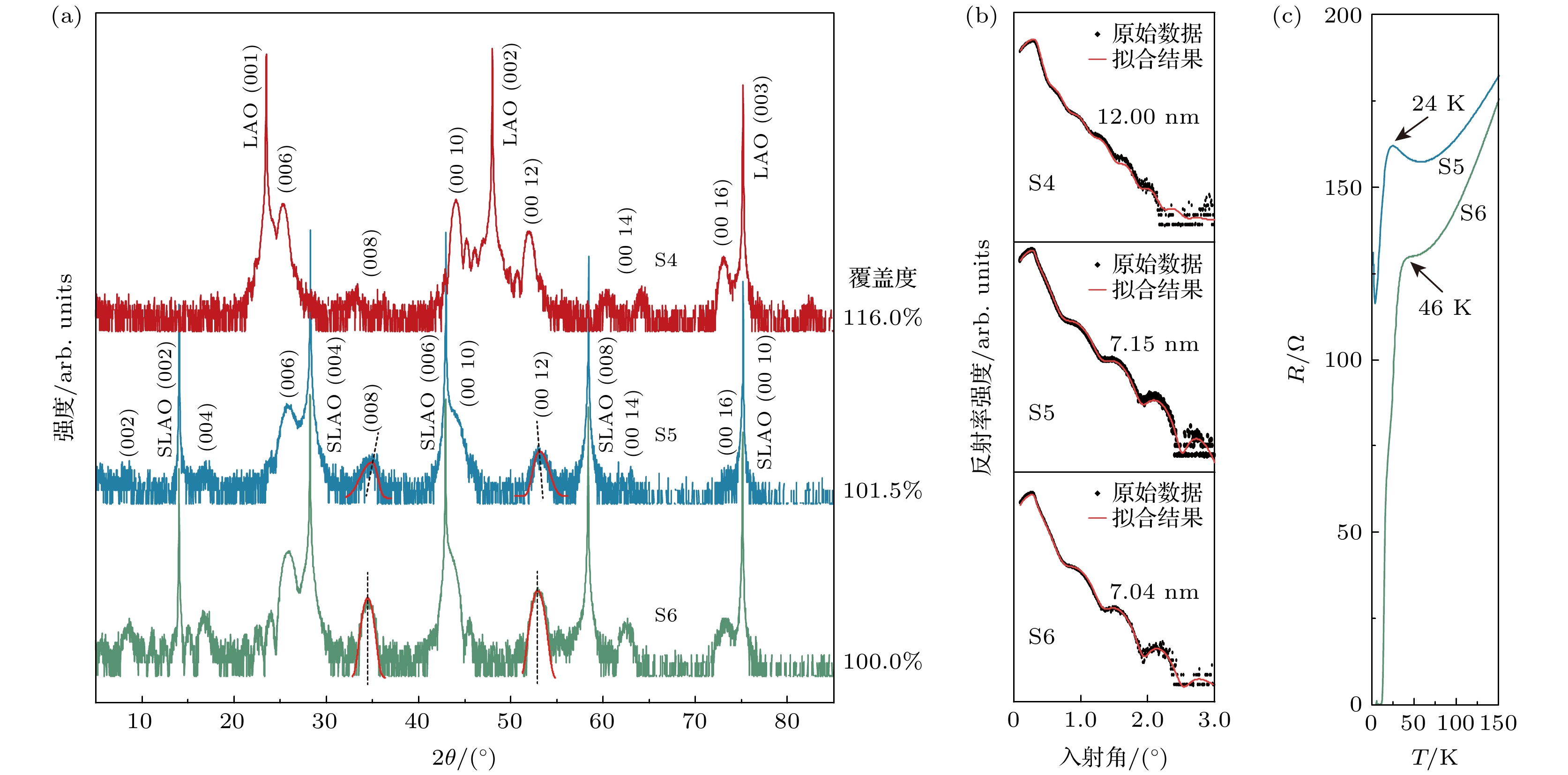 图 4 逐层原子覆盖度分别为116.0%, 101.5%和100.0%样品 (a) XRD θ-2θ扫描结果; (b) X射线反射率及其相应(c) R-T曲线. 样品的逐层原子覆盖度通过同比缩放LnOx与NiOx轰击脉冲数实现调控