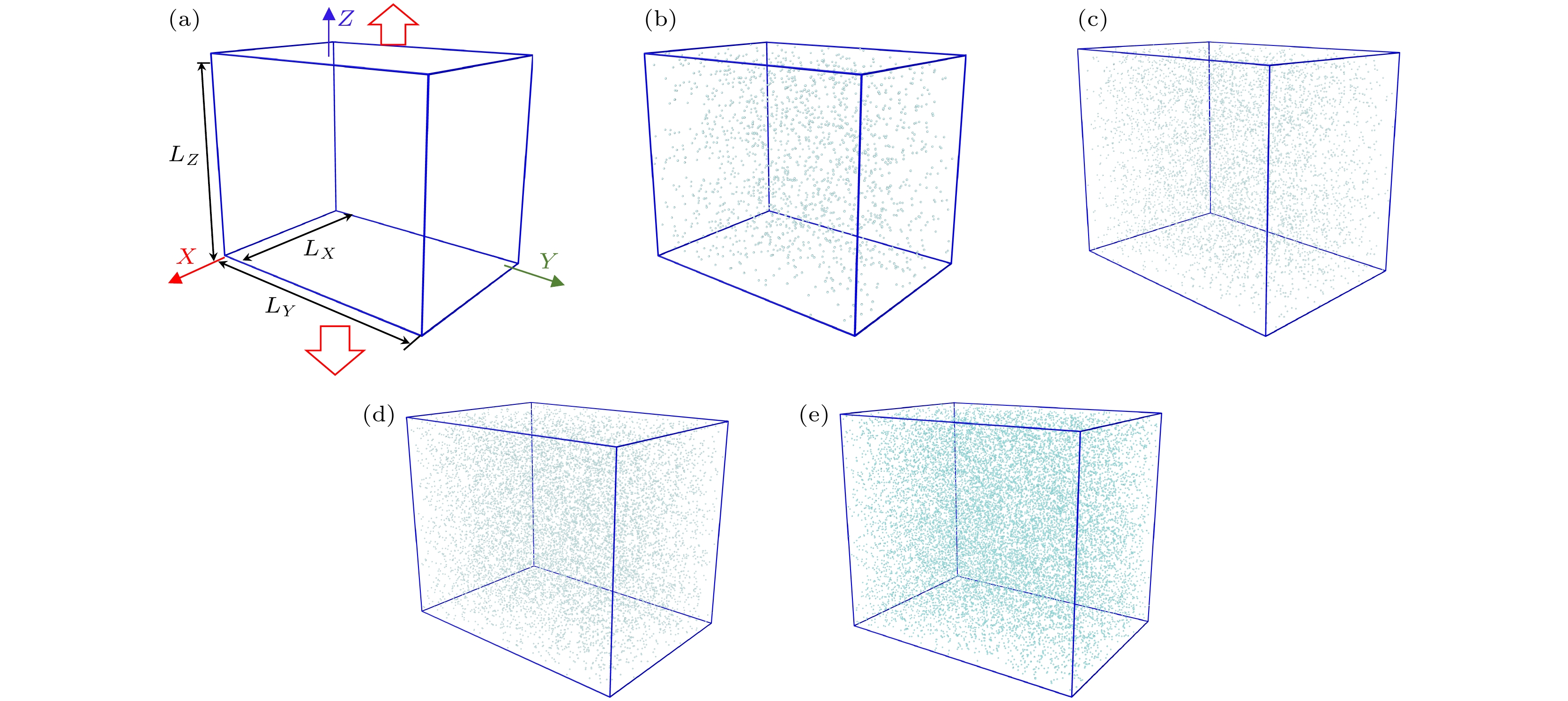 图 1 含有不同氦浓度的单晶铁拉伸的分子动力学模型示意图及对应氦浓度模型 (a) 模型示意图; (b) NHe = 0.5%; (c) NHe = 1.5%; (d) NHe = 3.0%; (e) NHe = 4.5%. Fe原子被隐藏以更好地观察氦原子分布和形貌