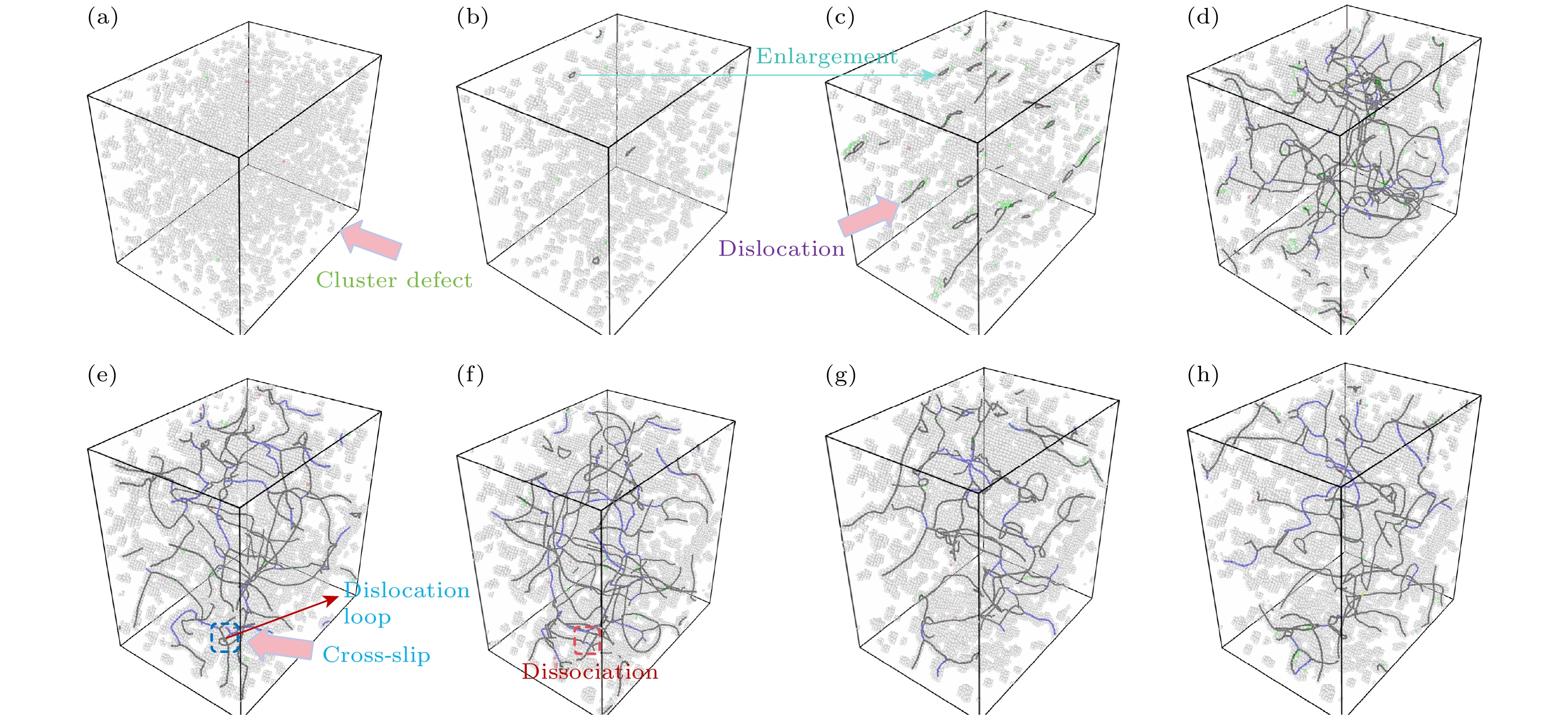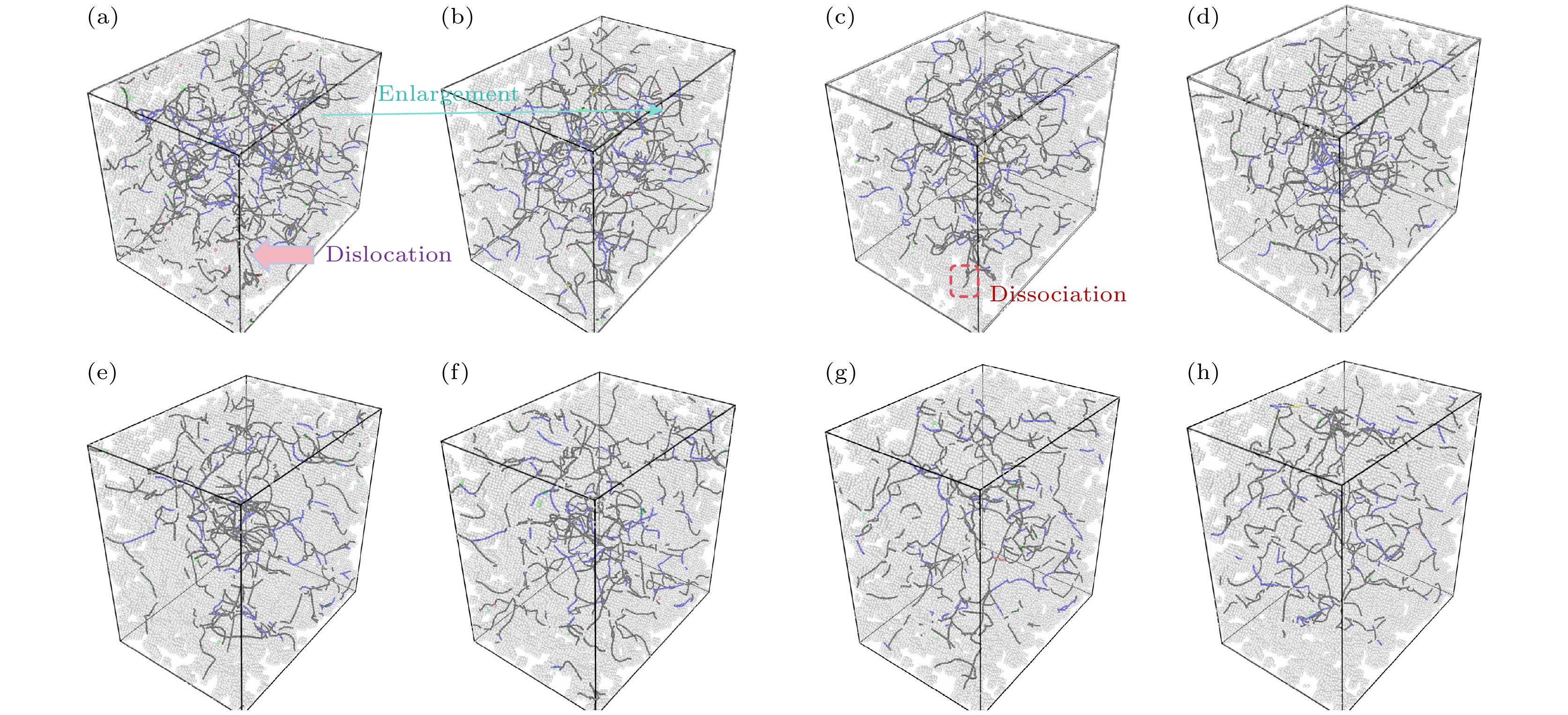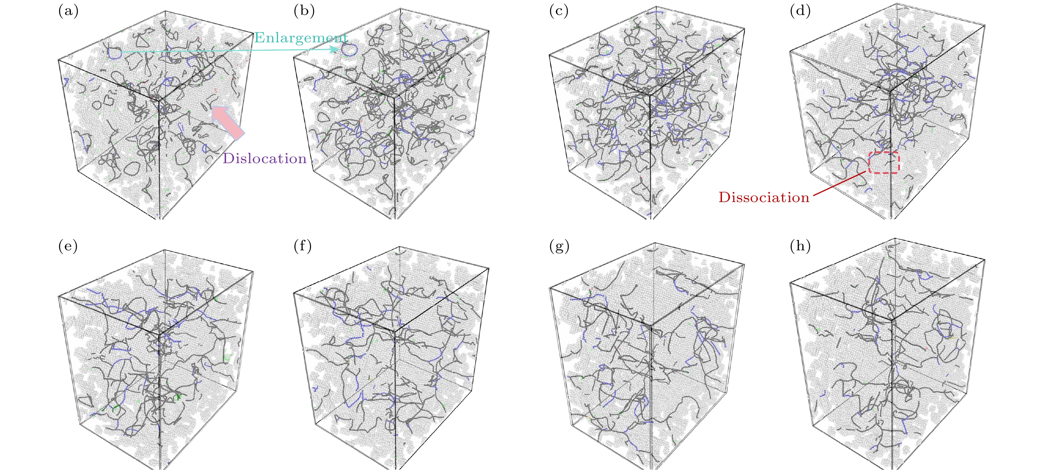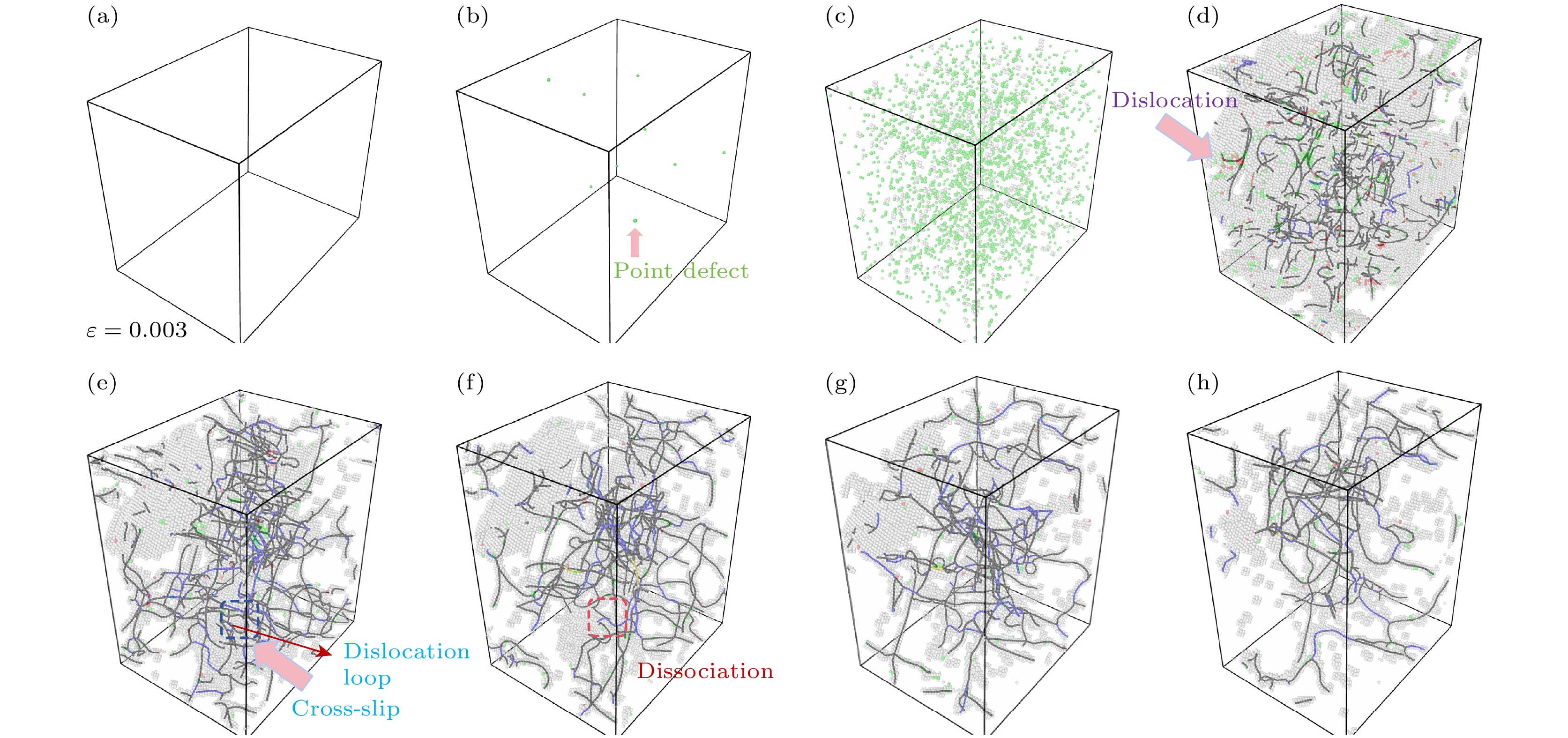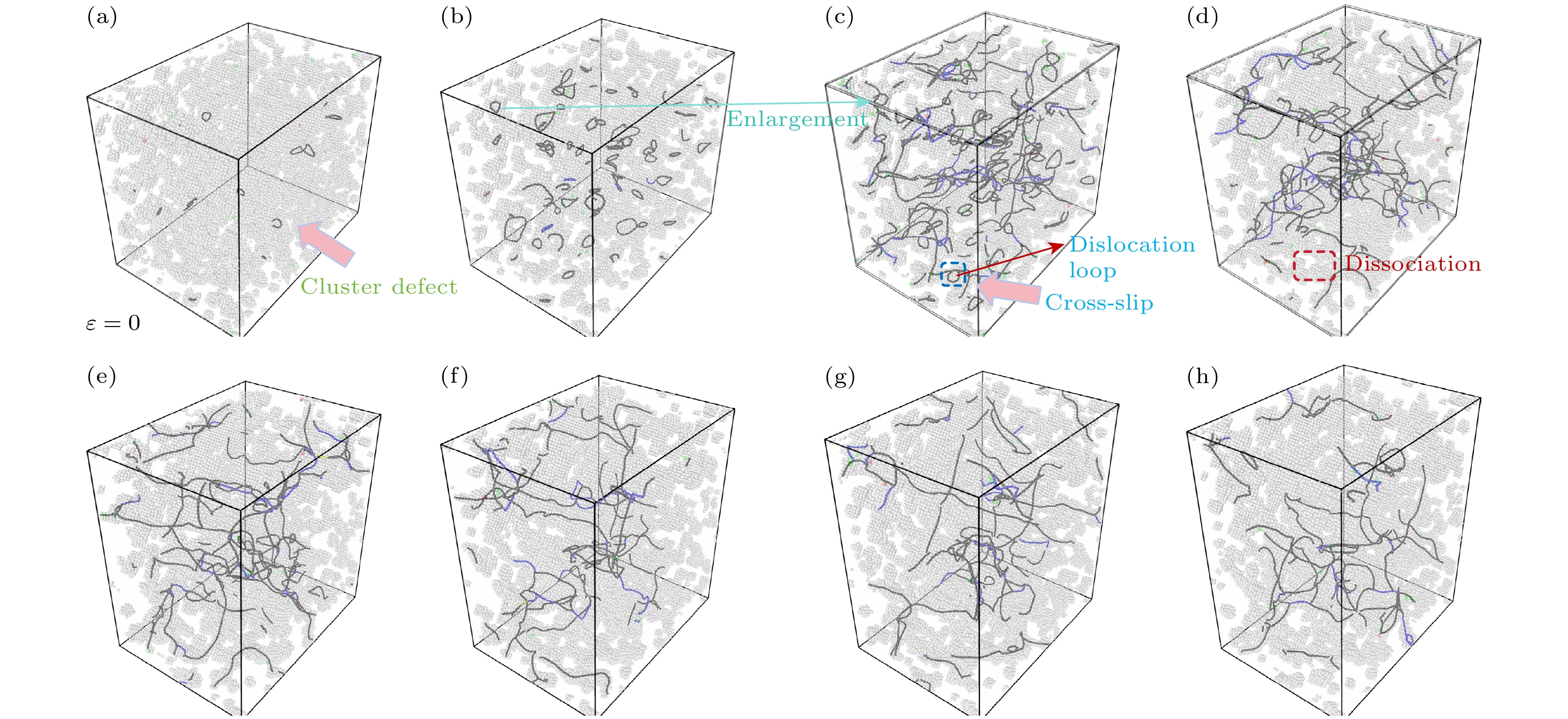 Fig. 9. Atomic configuration evolution of single-crystal iron without helium concentration effect during tensile deformation: (a) ε = 0.003; (b) ε = 0.054; (c) ε = 0.108; (d) ε = 0.12; (e) ε = 0.135; (f) ε = 0.165; (g) ε = 0.189; (h) ε = 0.21; gray-white atoms denote “other”, green denotes “fcc”; lines are dislocation lines, black denotes “1/2$ \left\langle {111} \right\rangle $”, blue denotes “$ \left\langle {100} \right\rangle $”, and yellow denotes “$ \left\langle {110} \right\rangle $”.