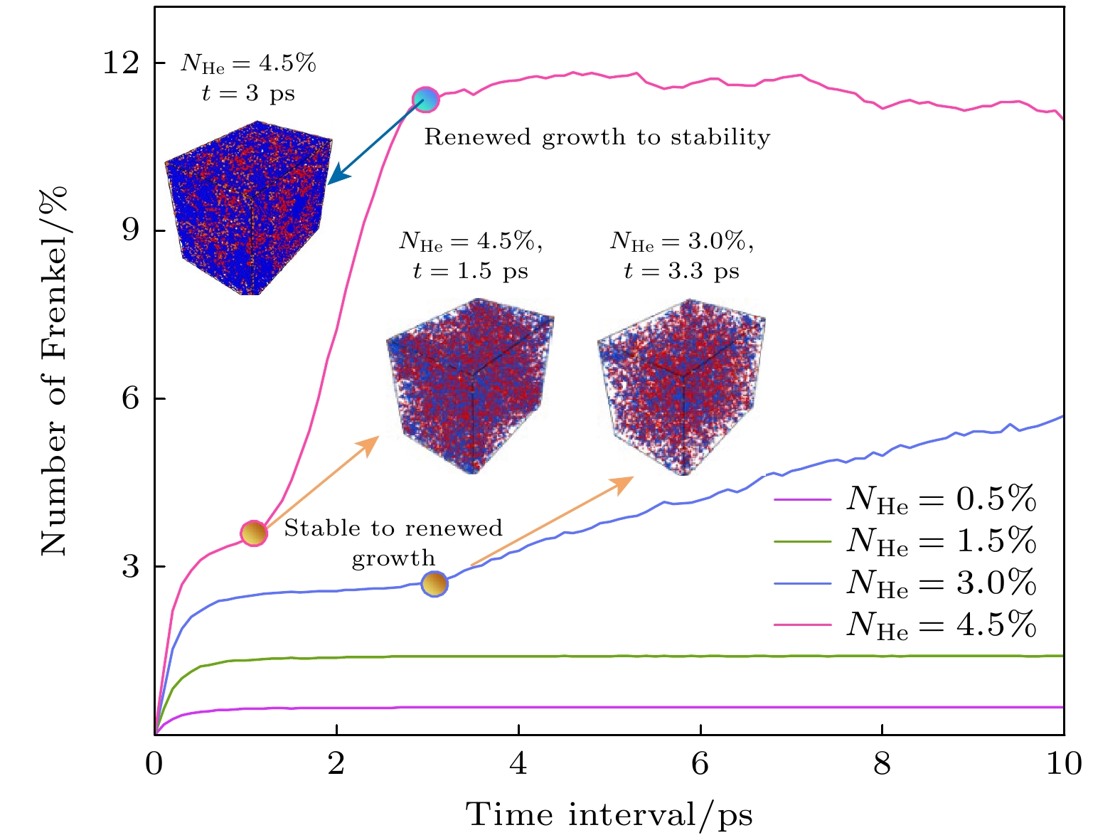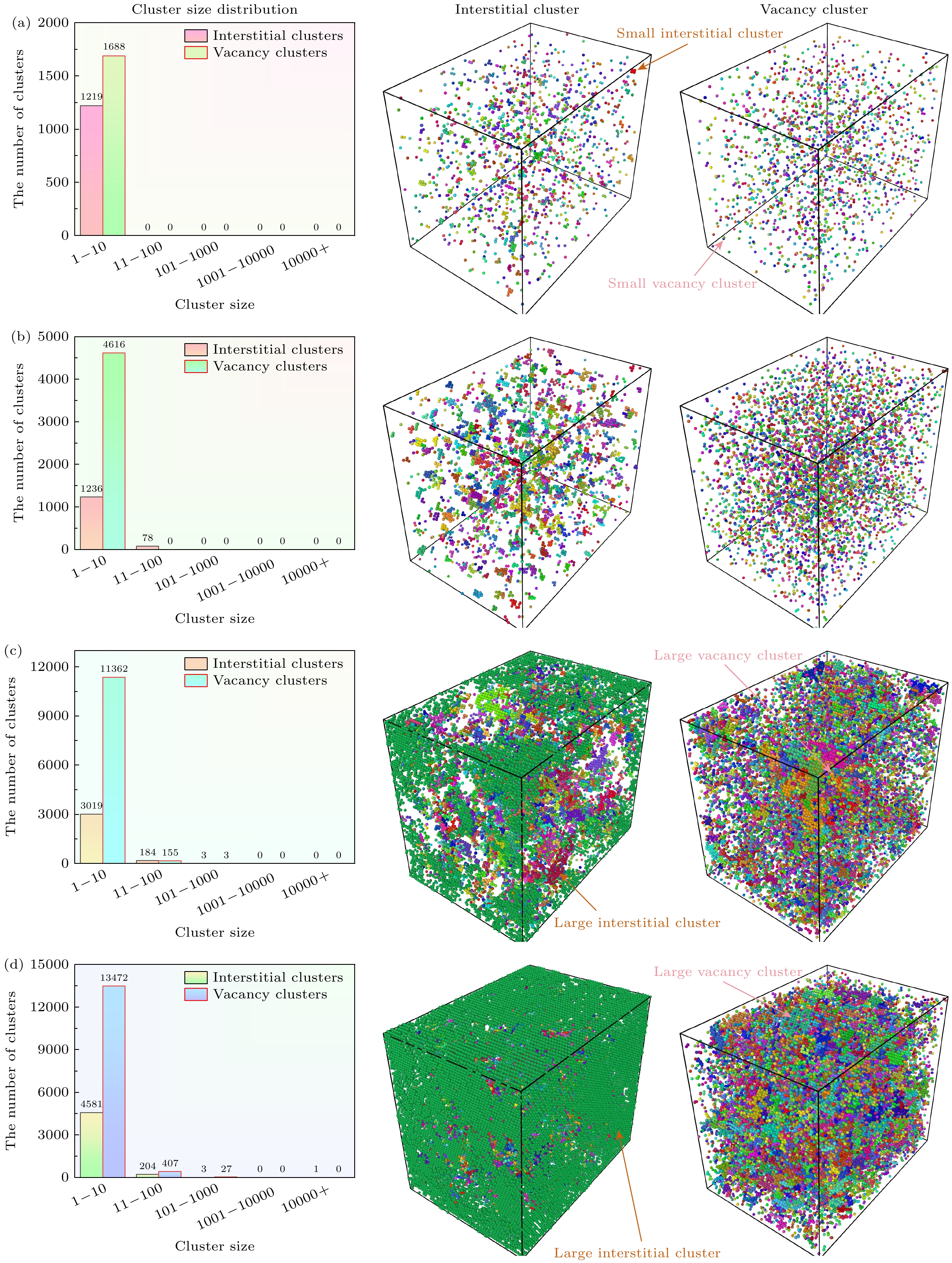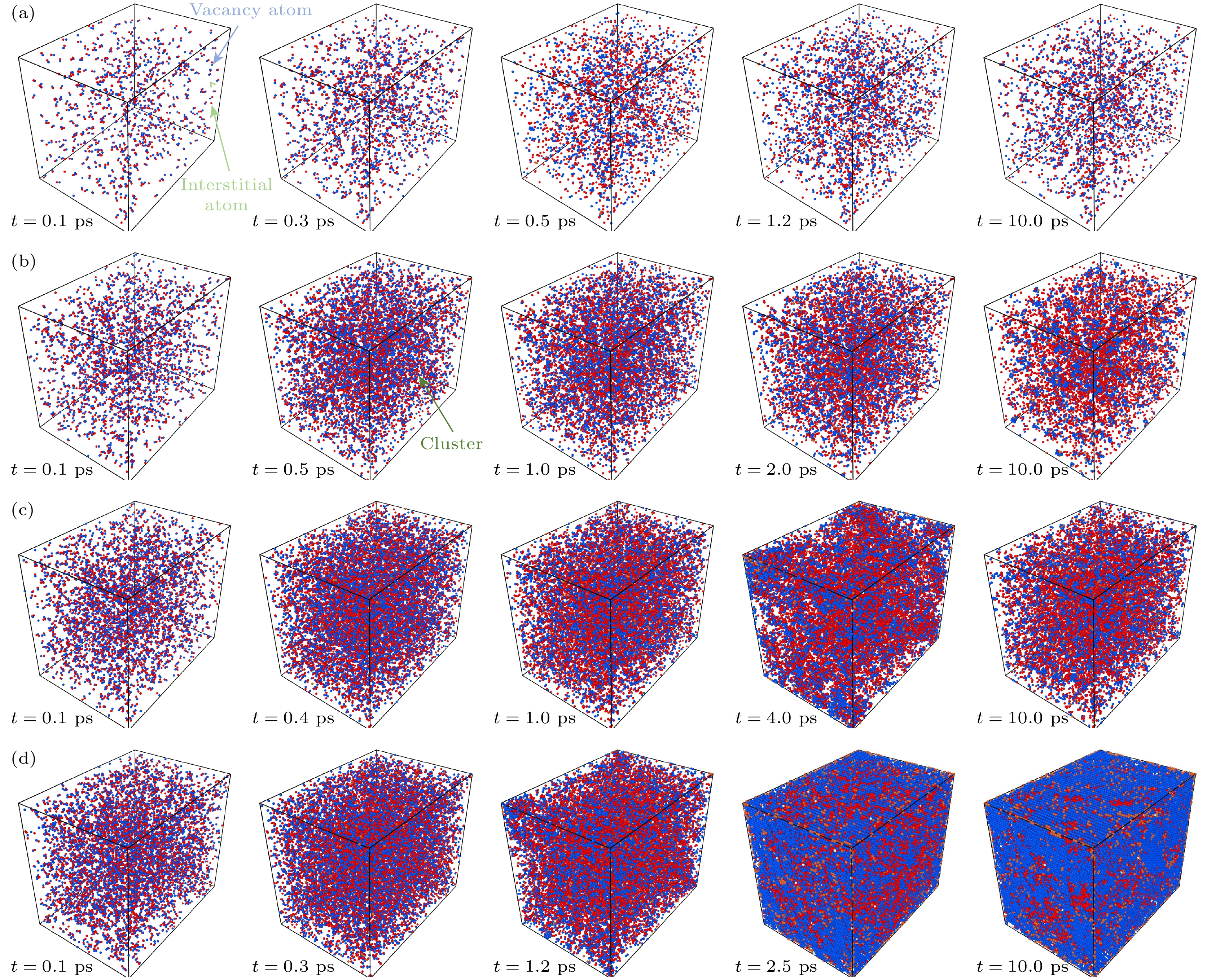 Fig. 2. Defect evolution processes in single-crystal iron with different helium concentrations: (a) NHe = 0.5%; (b) NHe = 1.5%; (c) NHe = 3.0%; (d) NHe = 4.5%. Red spheres represent vacancies, and blue spheres represent interstitial atoms.