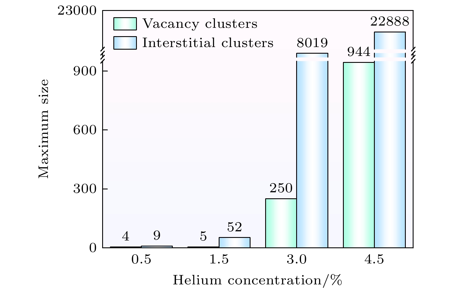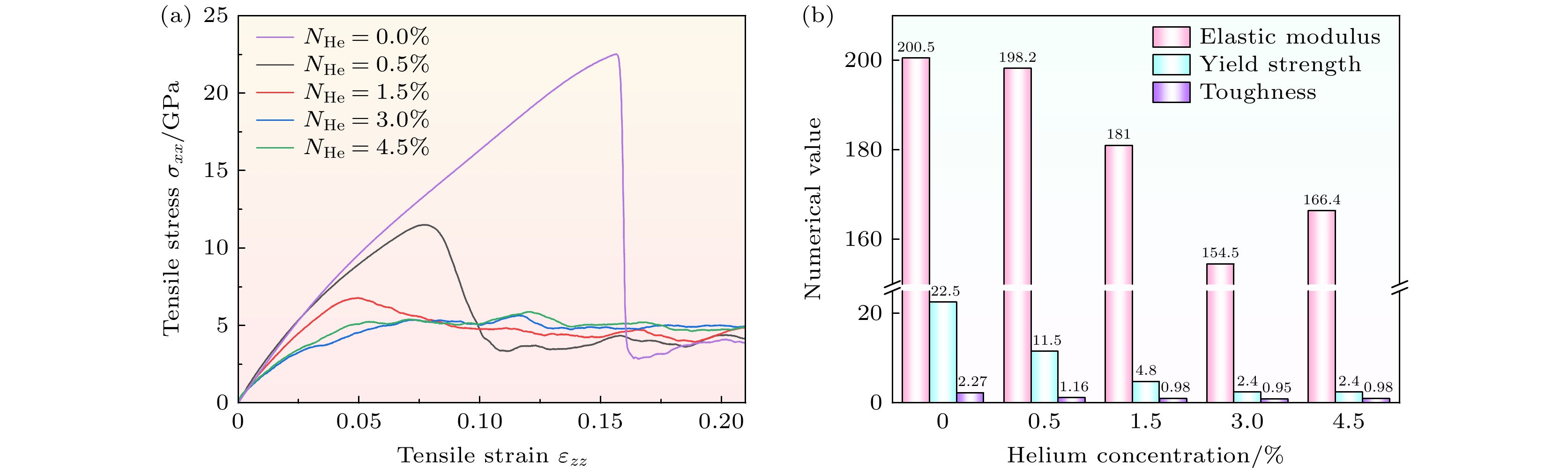 理解原子尺度下氦浓度对低活化钢缺陷演化和力学性能的内在关联是设计兼具优异抗肿胀和抗脆化性能聚变材料的关键. 本文通过分子动力学模拟研究氦浓度对单晶铁的影响. 结果表明NHe < 3.0%时, 弗仑克尔缺陷对(Frenkel pairs, FPs)数量都表现为线性增长至峰值后稳定; 而当NHe ≥ 3.0%时, 间隙大团簇的形成会吸收间隙原子长大并降低湮灭速率, 导致FPs数量二次增长, 被空位环绕后, 不再阻碍复位, 数量二次稳定. 当NHe增至3.0%时, 单晶铁的弹性模量, 屈服强度和韧性分别下降了21%, 88%和57%, 此后氦浓度增大, 力学性能不再降低. 这是由于NHe < 3.0%时, 随着氦浓度上升, 氦致缺陷增多, 导致韧性降低, 促进位错形核, 使弹性模量和屈服强度下降; 而当NHe ≥ 3.0%时, 初始缺陷存在位错, 且团簇数量变化甚微, 韧性不再降低, 不影响位错形核, 弹性模量和屈服强度随之稳定. NHe = 3.0%时出现的大团簇阻碍滑移系滑移, 改变滑移平面方向, 削弱主滑移系作用, 导致小滑移带增多, 塑性变形机制由交滑移转变为滑移带相遇后分解为离散位错和点缺陷. 研究揭示了氦浓度对单晶铁缺陷演化及力学性能的影响规律和关键机制, 为聚变铁基材料设计提供理论依据.Understanding the intrinsic correlation between helium concentration and the evolution of defects as well as mechanical properties in low-activation steel on an atomic scale is crucial for designing fusion materials with excellent resistance to swelling and embrittlement. This study investigates the effect of helium concentration on single-crystal iron through molecular dynamics simulations, thereby clarifying the mechanisms by which helium concentration affects helium defect evolution, mechanical properties, and plastic deformation behavior of low-activation steel on an atomic scale. Models of body-centered cubic (BCC) iron with different helium concentrations (0.5%—4.5%) are established. Wigner-Seitz cell analysis and cluster clustering methods are employed to track the evolution of Frenkel Pairs (FPs) and cluster defects, revealing the mechanism of helium concentration-induced FPs and cluster formation at 500 ℃. Furthermore, combined with tensile mechanical simulations, the effects of helium behavior on the mechanical properties of single-crystal iron, such as elastic modulus, yield strength, and toughness, are analyzed, and the correlation mechanisms between helium concentration-induced defect evolution, mechanical properties, and plastic deformation behavior are revealed. The results show that when NHe < 3.0%, the number of FPs linearly reaches to a peak and then stabilizes. This is because helium behavior causes a rapid increase in the number of FPs and a large number of interstitial atoms are generated, some of which recombine. The annihilation rate of FPs increases with their number increasing and eventually equals the generation rate, resulting in a stable number of FPs. When NHe ≥ 3.0%, the initial increase and stabilization are the same as those for NHe < 3.0%. However, after the formation of large interstitial clusters, they absorb interstitial atoms and grow, hindering recombination and reducing the annihilation rate of FPs, thus leading to a secondary increase. The large clusters are surrounded by vacancies and no longer hinder FP recombination, and a new balance is achieved, resulting in a secondary stabilization of the FP number. When NHe increases to 3.0%, the elastic modulus, yield strength, and toughness of single-crystal iron decrease by 21%, 88%, and 57%, respectively; beyond this concentration, the mechanical properties no longer decrease. This is because when NHe < 3.0%, as helium concentration increases, helium-induced defects increase, leading to a decrease in toughness and promoting dislocation nucleation, thus reducing the elastic modulus and yield strength. When NHe ≥ 3.0%, dislocations exist in the initial defects, and the number of clusters changes slightly; toughness no longer decreases, and dislocation nucleation is not affected, leading to the stabilization of elastic modulus and yield strength. At NHe = 3.0%, the formation of large clusters hinders the movement of slip systems, changes the orientation of slip planes, weakens the effectiveness of the main slip system, which leads to an increase in small slip bands and causes the plastic deformation mechanism to transform from cross-slip to decomposition into discrete dislocations and point defects once the slip bands intersect with each other. This study reveals the influence patterns and key mechanisms of helium concentration on defect evolution and mechanical properties of single-crystal iron, providing a theoretical basis for designing fusion iron-based materials.