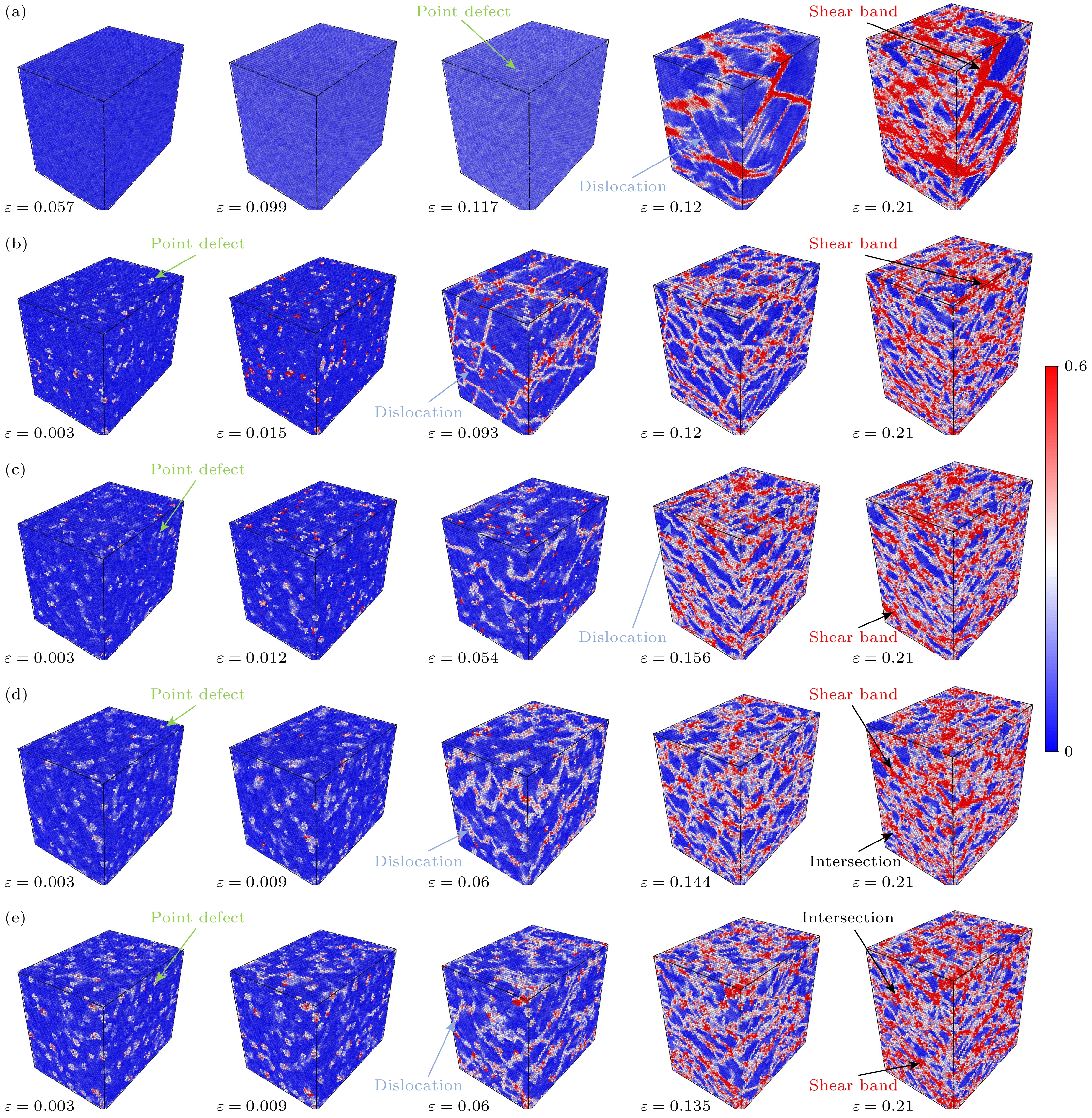 Fig. 10. Atomic configuration evolution of single-crystal iron with 0.5% helium concentration during tensile deformation: (a) ε = 0; (b) ε = 0.048; (c) ε = 0.075; (d) ε = 0.096; (e) ε = 0.126; (f) ε = 0.162; (g) ε = 0.186; (h) ε = 0.21.