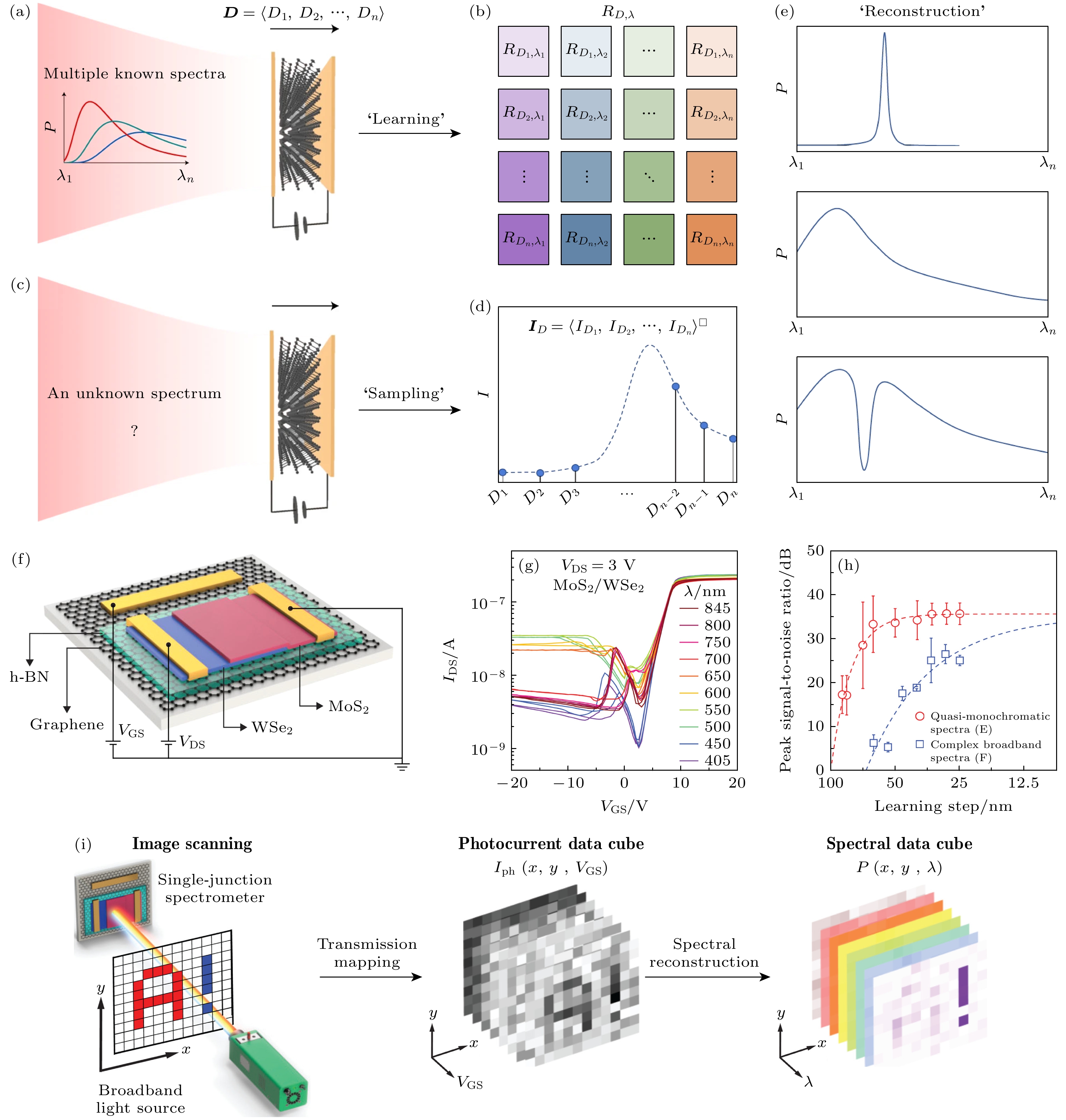 Fig. 3. (a) Schematic of the learning process. The photoresponse of BP can be tuned by the electric displacement (D) between two parallel metallic plates[51]; (b) the responsivity matrix RD,λ of the BP spectrometer, which depends on the biasing displacement field (D) and the incident light wavelength (λ), is ‘learned’ from the photoresponses to a group of known spectra (illustrated by the red, green and blue curves in a under different biasing displacement fields)[51]; (c) schematic of the sampling process. For the incident light with an unknown spectrum, the photocurrent in the BP detector is sampled as a function of the electric displacement D[51]; (d) the sampling process generates the photocurrent vector ID[51]; (e) schematics of three reconstructed spectra. From top to bottom, the spectra represent a narrowband emission, a broadband emission and an absorption feature of certain gas molecules. Reconstruction of the unknown spectra leverages the RD,λ and ID as discussed in panel (a)–(d). Reproduced with permission from Ref. [51]; (f) schematic diagram of the spectrometer[52]; (g) transfer curves of MoS2/WSe2 under different wavelengths of light illumination, with a fixed power of 20 mW[52]; (h) relationship between the peak signal-to-noise ratio of the reconstructed spectrum and the reference spectrum as a function of the learning step[52]; (i) spectral imaging with a single-junction spectrometer configuration using spatial scanning method. Broadband light filtered through a color image is incident on the spectrometer for spectral imaging. Reproduced with permission from Ref. [52].