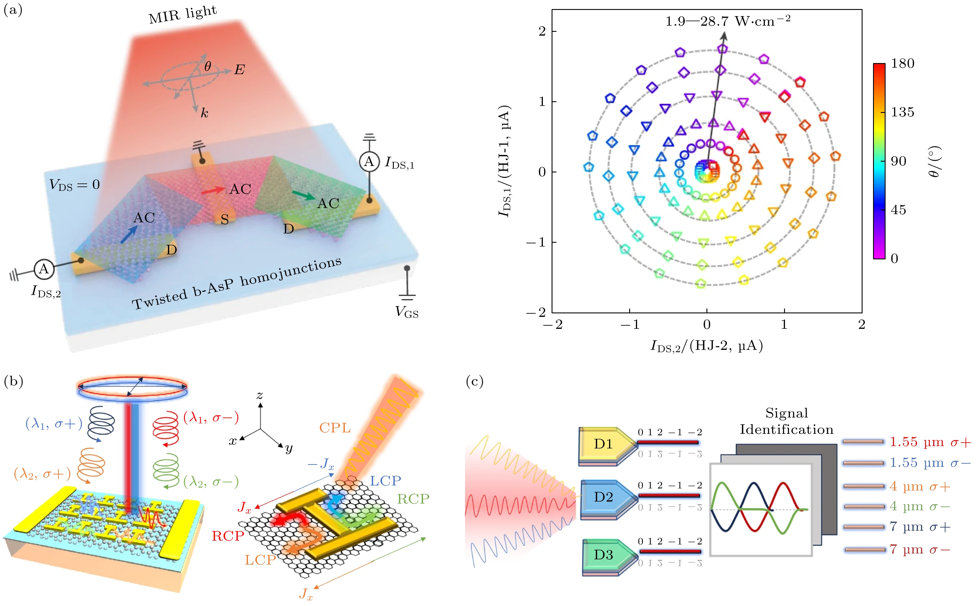 Fig. 4. (a) Twisted b-AsP homojunctions demonstrated simultaneous detection of full linear polarization states and intensity information. Reproduced with permission from Ref. [59]; (b) the dual-arm metasurface structure on graphene can localize light of different wavelengths and handedness on either side of the dual arms, generating vectorial photocurrents with varying magnitudes and directions. CPL, LCP, and RCP respectively represent circularly polarized light, left-handed circularly polarized light, and right-handed circularly polarized light[61]; (c) schematic representation of the extraction of three-wavelength circularly polarized signals. In the case of mixed light incidence, the processing of photovoltage signal encoding allows for the extraction of the wavelength and circular polarization information of the incident light. Reproduced with permission from Ref. [61].
