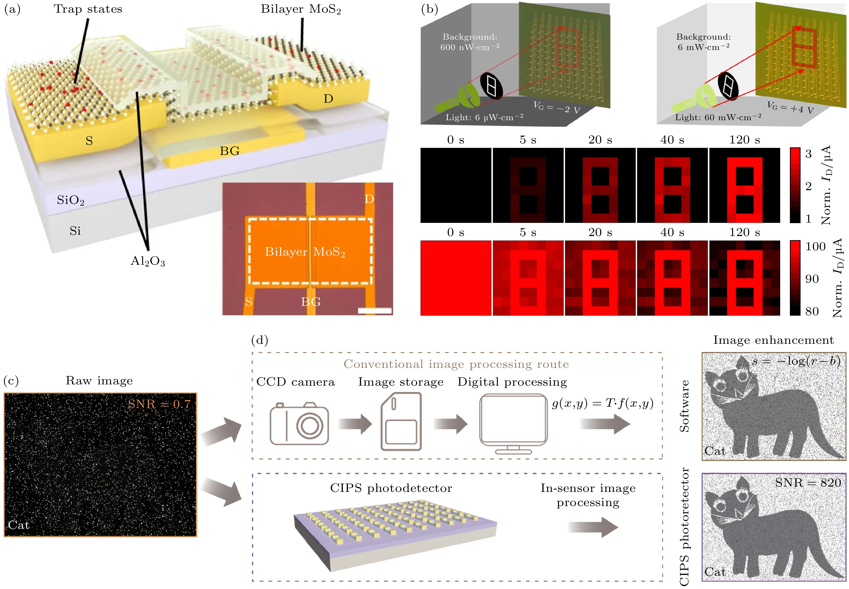 Fig. 5. (a) Schematic diagram of the MoS2 phototransistor. Inset: optical microscope image of a single MoS2 phototransistor[65]; (b) schematic diagram of an 8×8 pixel array under bright and dark backgrounds, and the temporal variation process of “8”. Reproduced with permission from Ref. [65]; (c) example of a highly noisy image in which the signal target is completely obscured by noise, with a SNR of approximately 0.7; (d) comparison between the traditional CCD camera+storage+software logarithmic transformation processing route and the direct output from the CIPS array. Reproduced with permission from Ref. [66].