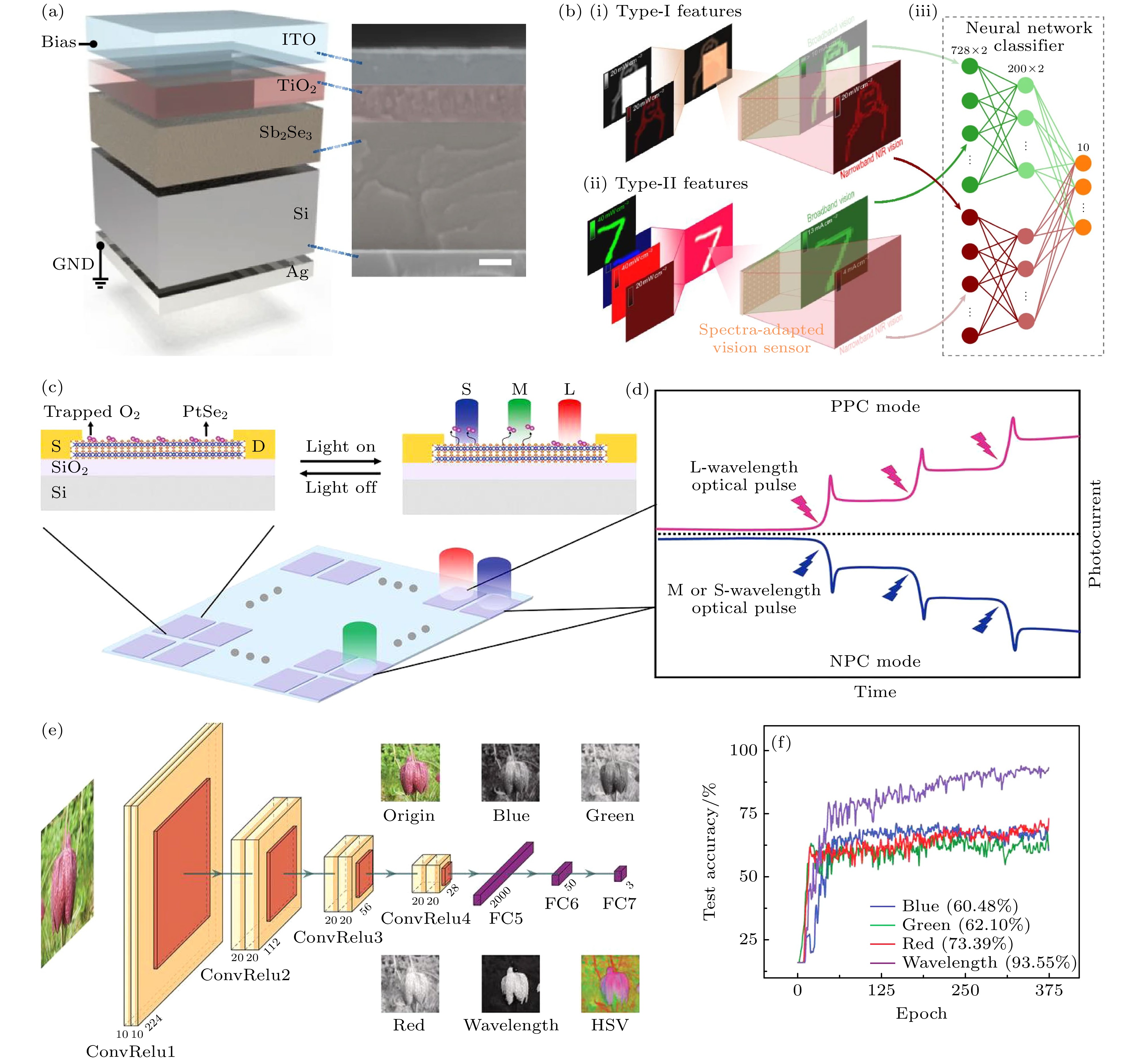 Fig. 6. (a) Cross-sectional schematic and SEM image of the device structure. Scale bar, 200 nm[67]; (b) operational scheme of the spectra-adapted vision system. Panels (i) and (ii) show examples of the imaging of typical type-I and type-II features by the spectra-adapted vision sensor, and panel (iii) sketches the architecture of the two-channel artificial neural network. Reproduced with permission from Ref. [67]; (c) ioinspired bilayer PtSe2 device for spontaneous chromatic adaptation. The O2-mediated bilayer PtSe2 device can simultaneously apply sensing, memory, and processing functions to color images[68]; (d) schematic of wavelength-dependent positive and negative nonvolatile photoconductivity, which mimics the antagonistic receptive field of a colored image and the memory of synaptic cells[68]; (e) CNN structure and different datasets. Origin and HSV are multichannel composite images. The red, blue, and green images are the three channels extracted on the basis of their pseudocolor image (origin). Hue is the wavelength channel of the HSV image[68]; (f) classification results of four datasets under the same network structure. The wavelength-dependent results show an average accuracy of 93.55%. The performance of the pseudocolor channels is 60.48% (blue), 62.10% (green), 73.39% (red). Reproduced with permission from Ref. [68].