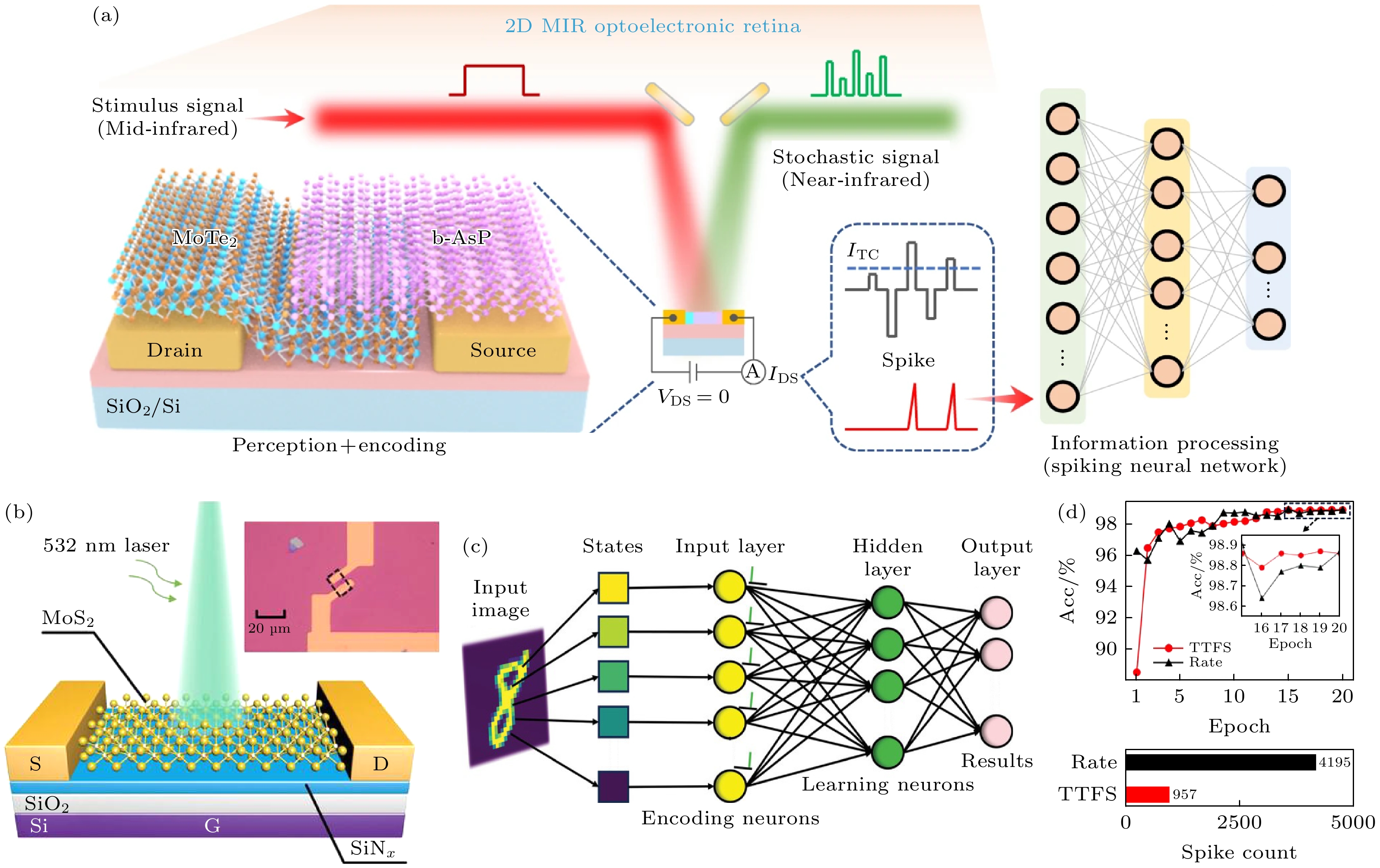 Fig. 9. (a) The 2D b-AsP/MoTe2 vdWs heterostructure simulates the retina, enabling integrated perception and encoding of MIR objects with the help of random NIR light terminals. The encoded spike signals can be used as inputs for the spiking neural network by passing through the source-drain current (IDS) below the threshold current (ITC) for information processing. Reproduced with permission from Ref. [100]; (b) schematic diagram of the device structure, from bottom to top is: p++-Si, SiO2, SiNx and MoS2[100]; (c) basic structure of the SNN used for encoding and training[101]; (d) comparison of recognition accuracy evolution with training epochs and total spike counts for the inference of the same image based on the TTFS coding rule and rate coding rule. Reproduced with permission from Ref. [101].