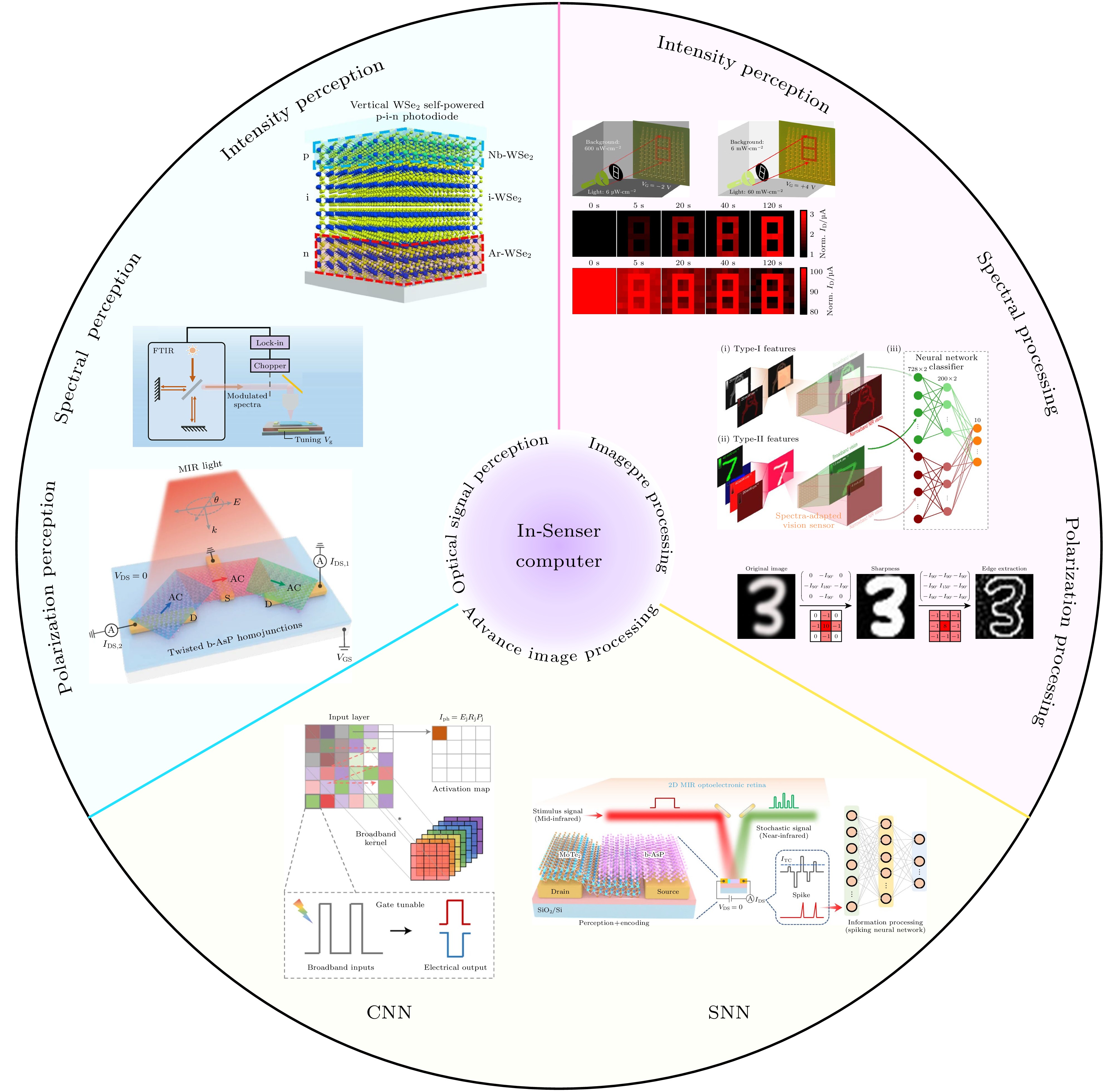 随着大数据和人工智能技术的飞速发展, 图像传感器向着多光学维度高质量成像和智能化信息处理方向发展. 传统的图像传感器架构由于感存算分离在处理指数级增长的视觉信息时面临存储墙和功耗墙瓶颈. 近年来, 基于二维材料的光电探测器在性能提升方面取得了显著的进展, 并与传感器内计算技术相结合, 为图像在传感器内智能处理开辟了新路径. 本文系统地综述了高性能二维材料光电探测器及图像智能处理技术的最新进展. 首先, 介绍了二维材料光电探测器的感知特性及其关键性能指标; 随后, 探讨了探测器内图像预处理方法; 接着, 总结了基于二维材料器件的传感器内计算技术及其在各类神经网络中的创新应用; 最后, 分析了利用二维材料开发新一代图像处理器件所面临的挑战与机遇.This paper provides a comprehensive review of recent advances in high-performance photodetectors based on two-dimensional materials and in-sensor computing for intelligent image processing, aiming to address the challenges of the “memory wall” and “power wall” caused by the separation of sensing, storage, and computing in traditional image sensors. Traditional image processing relies on the von Neumann architecture, where a large volume of raw data generated at the sensing end must be transmitted to independent computing units or cloud platforms for processing, leading to high energy consumption, significant latency, bandwidth burden, and security risks. Owing to their atomic thickness, high carrier mobility, weak short-channel effects, and tunable optoelectronic properties, two-dimensional (2D) materials provide an ideal physical foundation for achieving function integration of perception and computation. This paper discusses the topic from three perspectives: optical signal perception, image preprocessing, and advanced image processing. In terms of optical signal perception, 2D materials and their heterostructures exhibit ultrahigh responsivity, broadband operation, and fast response in light-intensity detection, enable miniaturized spectrometers through bandgap modulation and computational spectroscopy, and achieve compact, full-polarization analysis via twisted layers and metasurface structures. In image preprocessing, 2D material devices can perform convolution and feature extraction at the sensing end through linear photoresponse, suppress noise and extend dynamic range via superlinear and sublinear responses, and mimic biological visual adaptation in spectral and polarization domains to enhance image quality and robustness. In advanced image processing, the tunable photoresponse and memristive characteristics of 2D materials enable sensor-level integration of sensing, storage, and computation, This allows for the realization of matrix-vector multiplication and convolution operations within convolutional neural networks, significantly reducing power consumption and improving efficiency. Meanwhile, by implementing spike-rate and temporal encoding of optical signals in spiking neural networks, 2D material devices can achieve event-driven image recognition and classification under low-power and low-latency conditions. Furthermore, this paper highlights the challenges faced by 2D material image sensors, including scalable fabrication, heterogeneous integration with silicon technology, array- and circuit-level optimization, environmental stability and encapsulation, and system-level implementation, while envisioning their broad application prospects in intelligent imaging, wearable electronics, autonomous driving, and biomedical diagnostics. It is concluded that with the joint progress in materials science, device engineering, and artificial intelligence, 2D materials are expected to drive the development of next-generation low-power, high-performance, intelligent image processing platforms, and to become an essential foundation for future information perception and processing technologies.