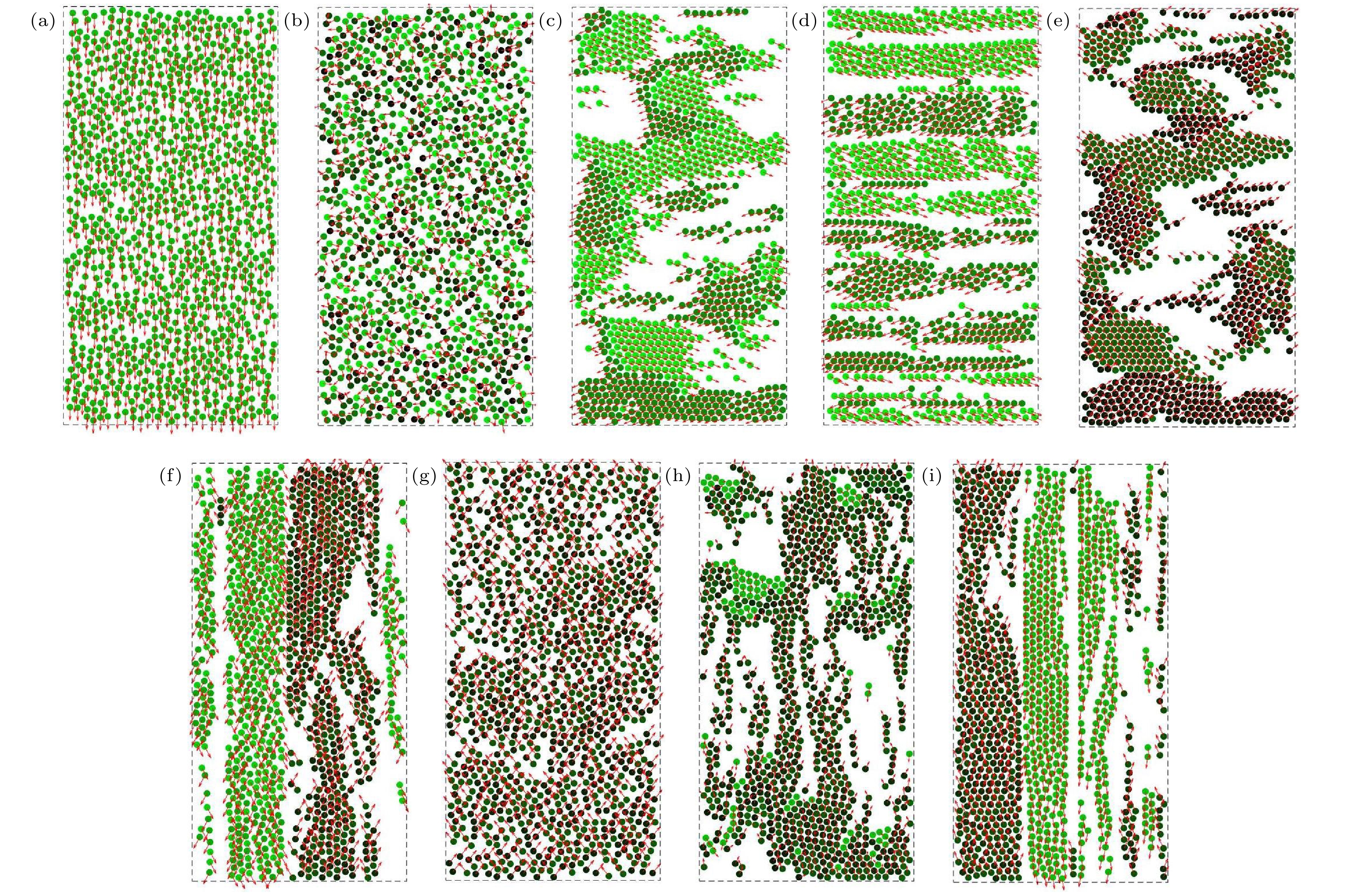 图 1 周期交流场驱动惯性活性粒子在周期边界中运动粒子快照图 (a) $ \omega =0.01 $; (b) $ \omega =10 $; (c) $ \omega =13 $; (d) $ \omega =14 $; (e) $ \omega = $$ 15 $; (f) $ \omega =16 $; (g) $ \omega =33 $; (h) $ \omega =46 $; (i) $ \omega =50 $; 其他参数设置为: $ I=3000,\; \varepsilon =1.0,\; {D}_{\mathrm{r}}=0.01\text{和}{{v}}_{0}=1 $. 其中, 用粒子填充颜色区分粒子在竖直方向的运动方向, 黑色表示$ {v}_{y} > 0 $, 绿色表示$ {v}_{y} < 0 $, 红色箭头表示粒子运动方向