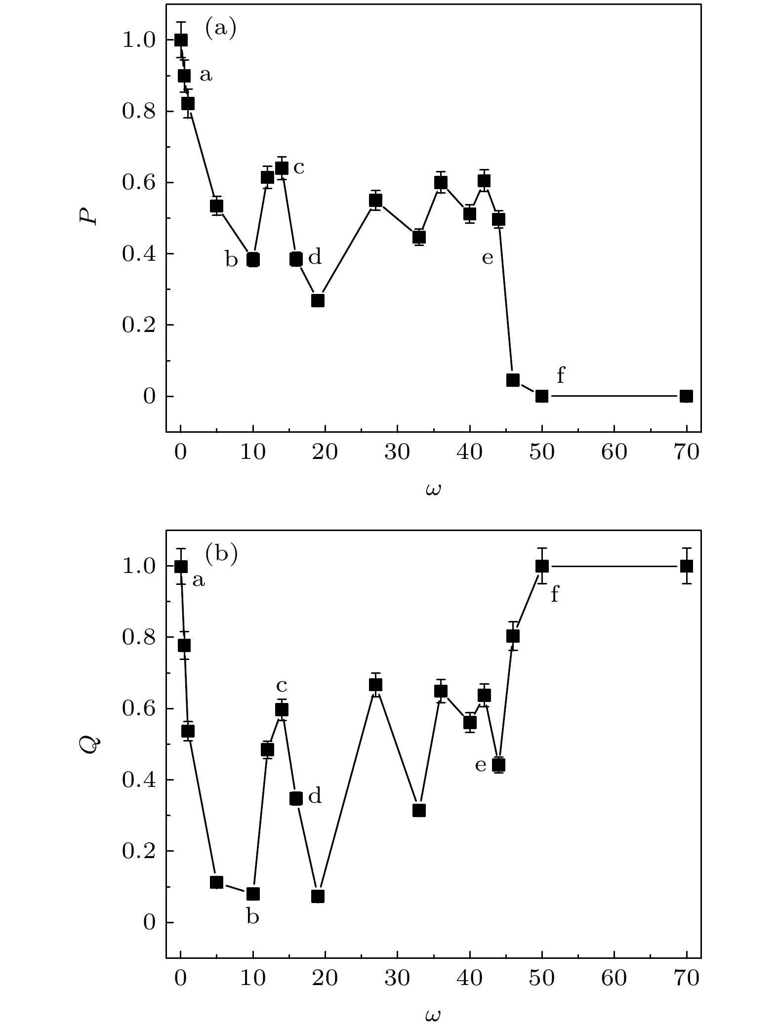 Fig. 3. (a) Variation of the system polarity order parameter P with AC field frequency $ \omega $; (b) variation of the vectorial order parameter $ Q $ with the AC field frequency $ \omega $. Other parameters are set to $ {I}= 3000,\; { \varepsilon }= 1.0,\; {{D}}_{\text{r}}= $$ 0.01,\; \text{and}\;{{v}}_{0}=1.0. $The states at points a, b, c, d, e and f in the figure correspond to Fig. 1(a), Fig. 1(b), Fig. 1(d), Fig. 1(f), Fig. 1(h) and Fig. 1(j), respectively.
