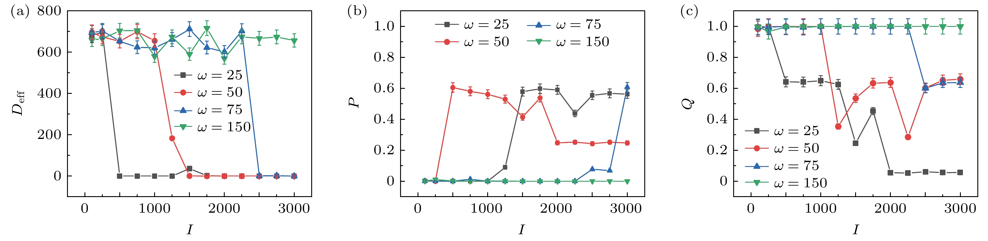 图 4 (a) 不同$ \omega $值下, 有效扩散系数$ {D}_{\mathrm{e}\mathrm{f}\mathrm{f}} $随周期交流场强度$ {I} $的变化; (b) 不同$ \omega $值下, 极性序参量$ P $随随交流场强度$ I $的变化; (c) 不同$ \omega $值下, 向列序参量$ Q $随交流场强度I的变化. 其他参数设置为: $ { \varepsilon }= 1.0, \;{{D}}_{\text{r}}= 0.01\text{和}{{v}}_{0}= 1 $