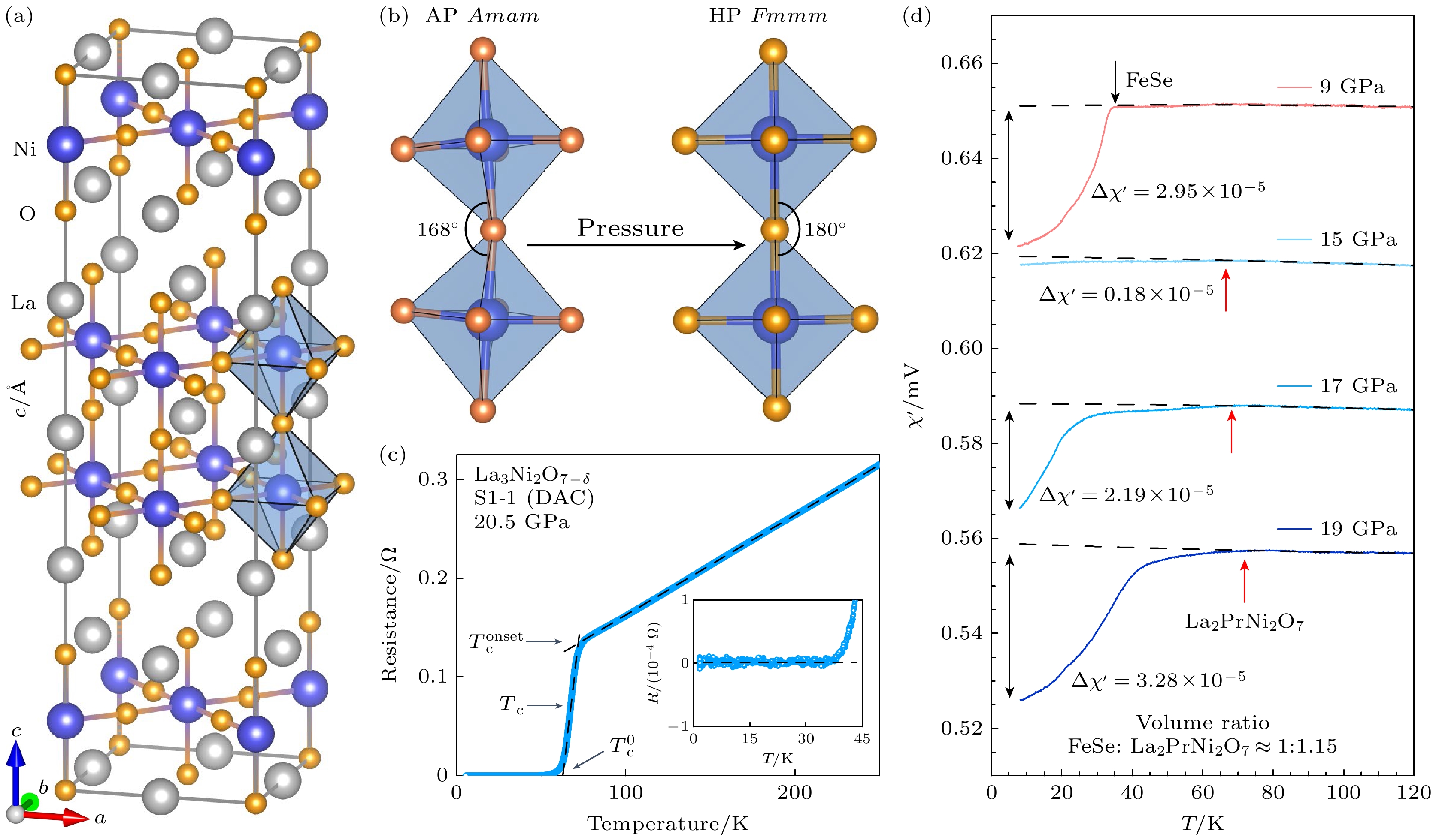 Fig. 1. Crystal structure and superconductivity of pressurized La3Ni2O7. (a) Side view of the crystal structure[1]. (b) Pressure-induced structural phase transition, the interlayer Ni—O—Ni bond angle changes from 168° to 180°[1]. (c) Temperature dependence of resistivity for La3Ni2O7 under 20.5 GPa. The inset shows a magnified view of the zero-resistance region at low temperature[2]. (d) Temperature-dependent magnetic susceptibility of La2PrNi2O7 under different pressures, using FeSe as a reference. A clear diamagnetic signal emerges when the applied pressure exceeds 17 GPa[3].