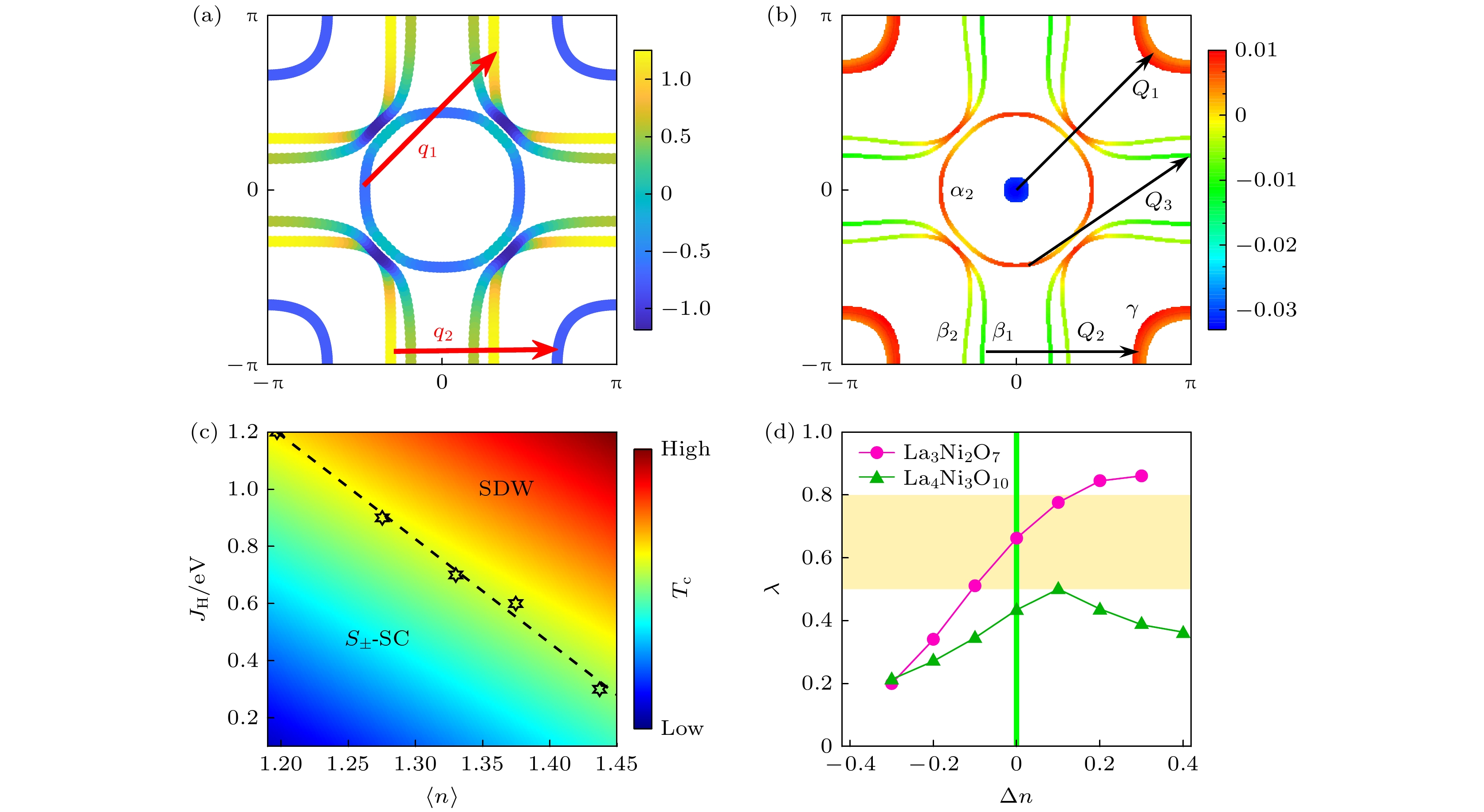 Fig. 14. Research on the TB model of La4Ni3O10 without α1 pocket: (a), (b) The Fermi surfaces nesting and the distribution of pairing gap function on the Fermi surface calculated by FRG[56] and RPA[57], respectively; (c) phase diagram of La4Ni3O10 with respect to the filling level and JH, calculated by FRG[56]; (d) the pairing eigenvalue λ calculated by FLUX[54] for La4Ni3O10 (green line) and La3Ni2O7 (pink line) are plotted as the function of filling Δn.