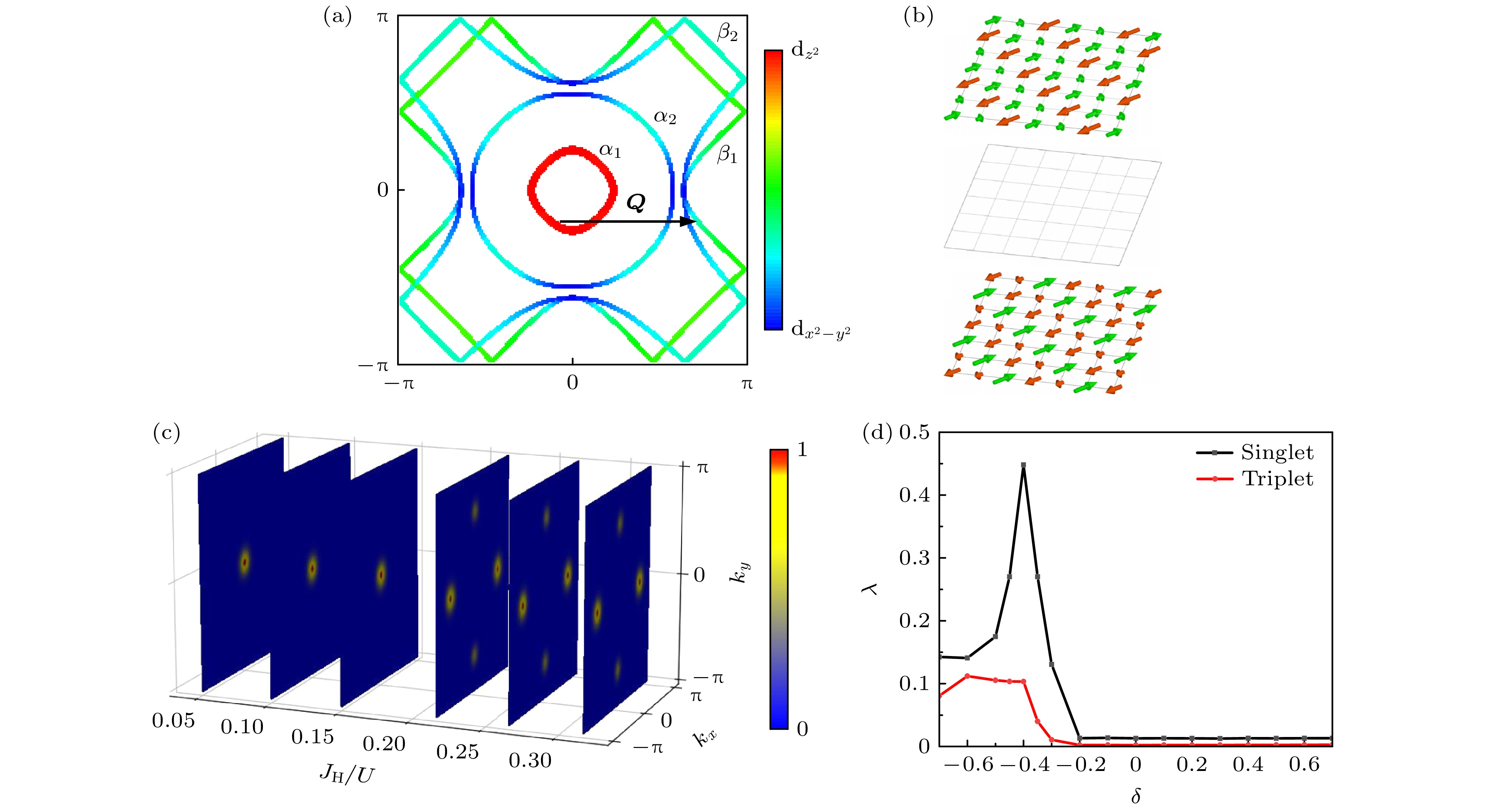 图 19 常压下La4Ni3O10的RPA计算结果[78] (a)常压下La4Ni3O10在第一布里渊区的费米面, $ {\boldsymbol{Q}} $矢量表示费米面嵌套; (b)实空间中的SDW模式; (c)当$ V=0 $时, $ \chi^{\mathrm{s}}(\boldsymbol{k}) $随$ J_{\mathrm{H}} $的变化情况, 其中亮点代表自旋密度波波矢所在位置; (d) λ的最大值对掺杂浓度δ的依赖, 其中$ J_{\mathrm{H}}=U/6 $