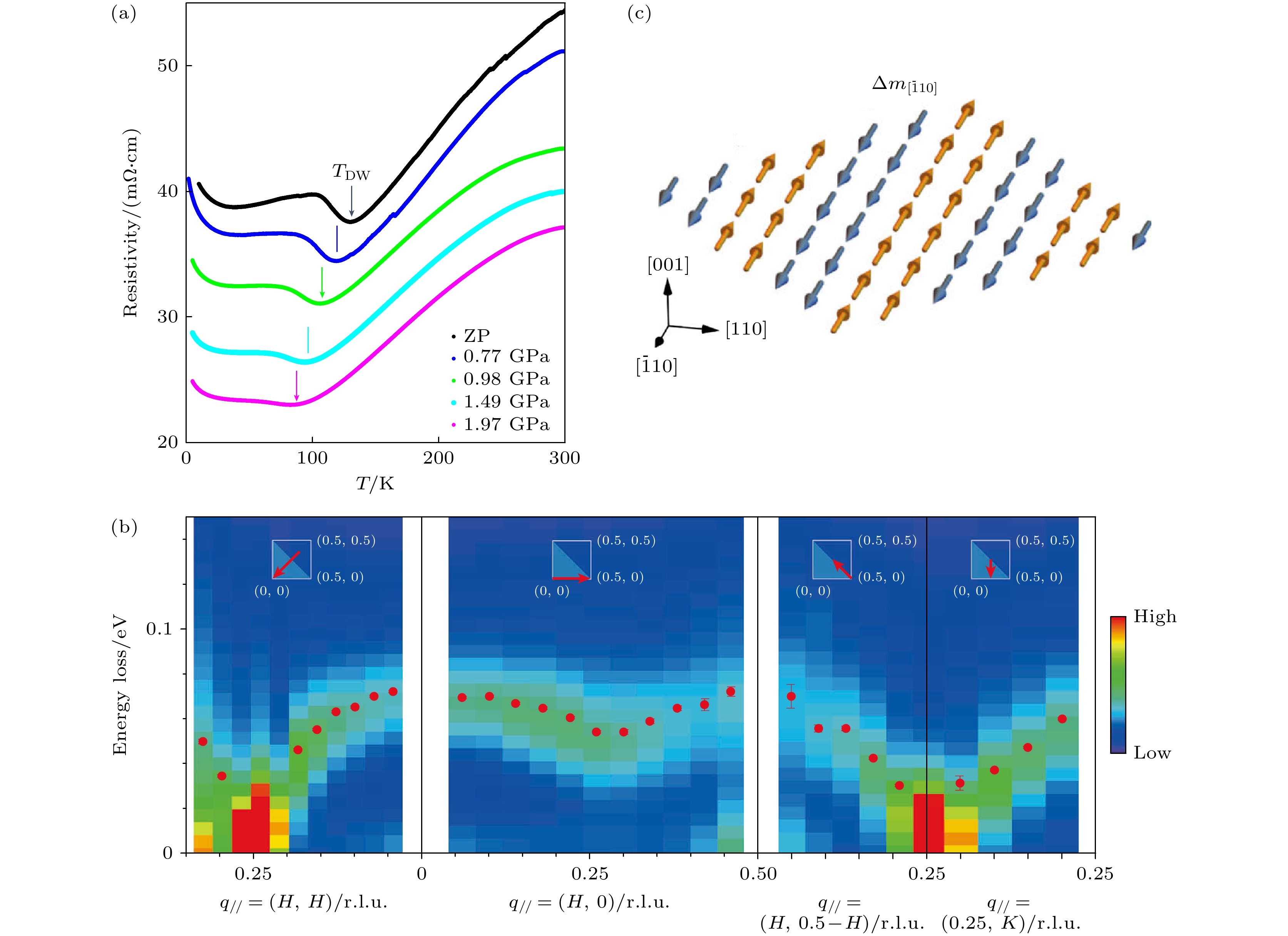 Fig. 2. Experimental probes of density-wave properties in La3Ni2O7: (a) Temperature dependence of resistivity under various pressures, with arrows indicating the density-wave transition temperature[10]; (b) RIXS intensity map along high-symmetry directions[14], where red solid circles mark the peak positions of magnetic excitation intensity; (c) real-space schematic of the spin-density wave (SDW) with wave vector (π/2, π/2)[15].
