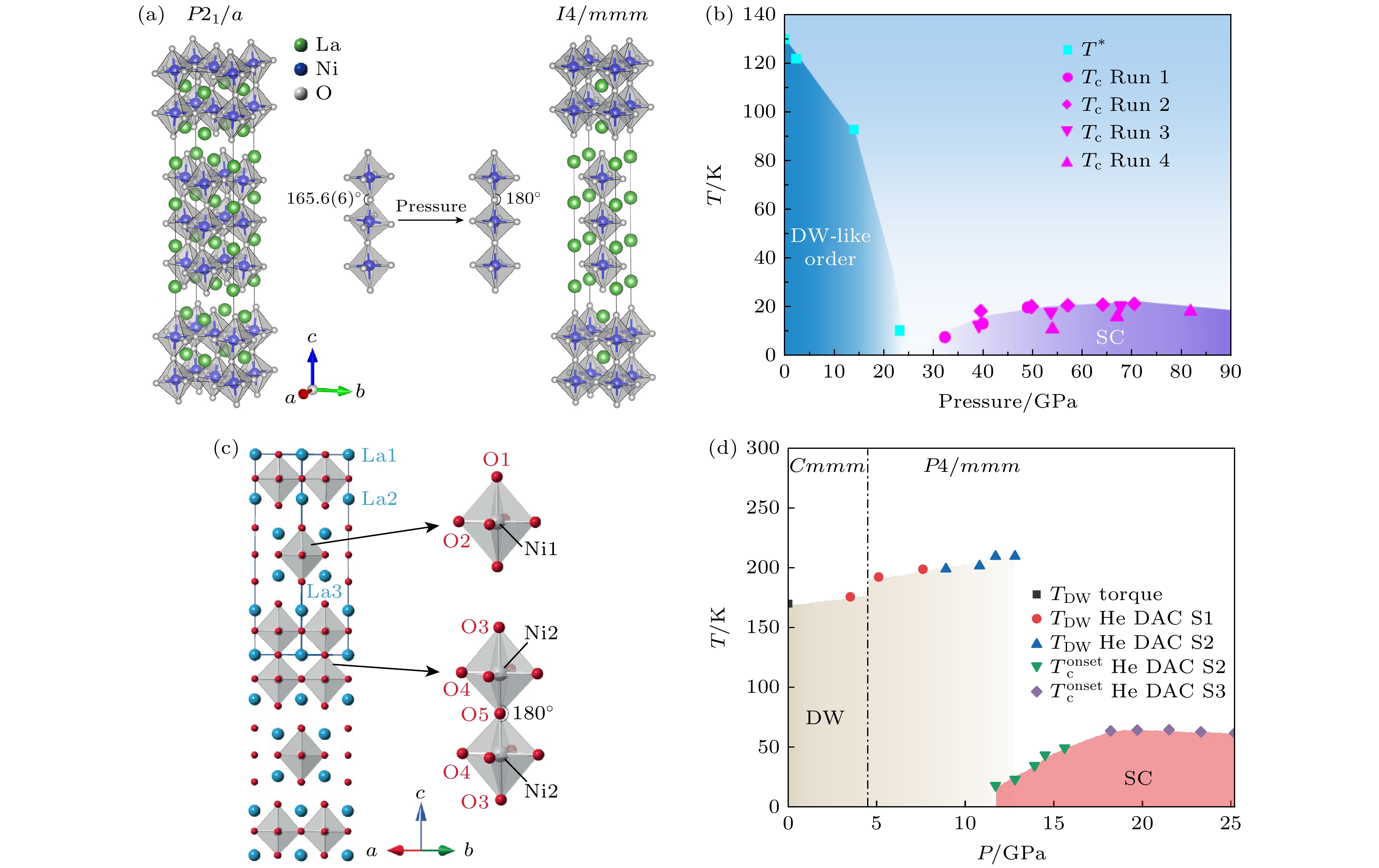Fig. 4. Structural schematics and superconductivity-pressure phase diagrams of La4Ni3O10 and La5Ni3O11: (a) Crystal structures of La4Ni3O10 at ambient pressure (left) and under high pressure (right)[4]; (b) superconductivity–pressure phase diagram of La4Ni3O10[5]; (c) crystal structure of La5Ni3O11 (left) and stacking units of single- and double-layer NiO6 octahedra (right)[8]; (d) superconductivity-pressure phase diagram of La5Ni3O11[8].