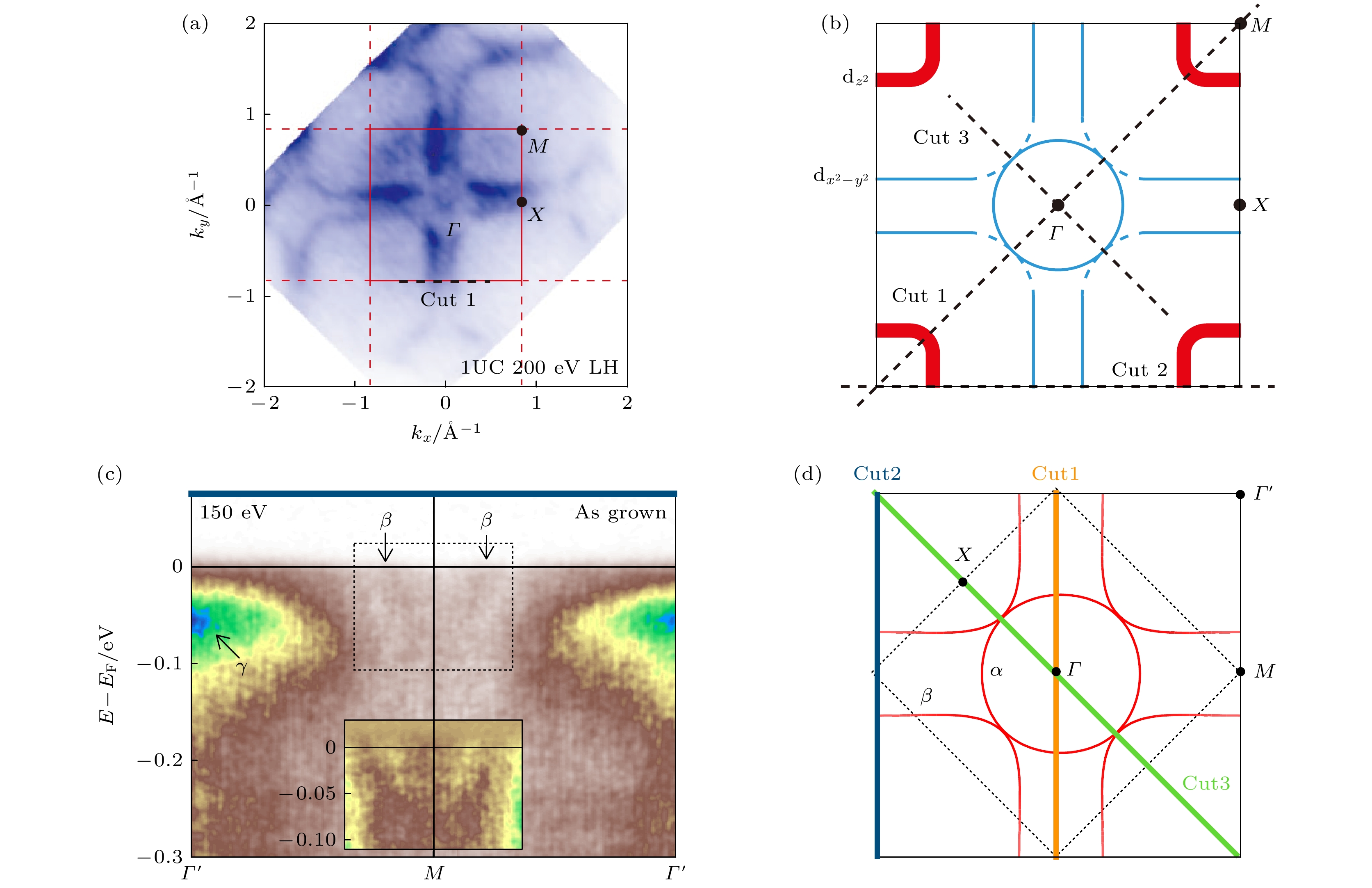 Fig. 8. The angle-resolved photoemission spectrum (ARPES) results of the (La, Pr)3Ni2O7 ultrathin film grown on the SrLaAlO4 substrate. For whether the Ni-$3 {\mathrm{d}}_{z^2} $ antibonding band crosses the Fermi level forming the γ pocket, different experiments give different results: (a) ARPES results, and the Fermi surface corresponds to the darker region[62]; (b) Fermi surface obtained from the ARPES results[62]; (c) band structure along high-symmetric line with the β and γ bands labeled[20]. Top of the γ band is located at the blue region, indicating that the γ band does not cross the Fermi level with the top of this band below the Fermi level[20]. The inset is the zoom in of the rectangular region in the dashed box; (d) Fermi surface obtained from the ARPES results[20].