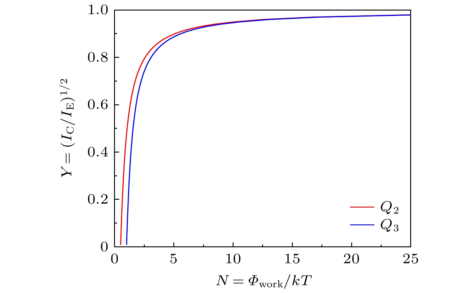 阴极材料 $ {\phi _{{\text{work}}}} $/eV T/K $ N = \dfrac{{{\phi _{{\text{work}}}}}}{{kT}} $ $ {Y_{{Q_3}}} $ $ {Y_{{Q_2}}} $ BaO 1.65 1200—2200 8.7—16.0 0.9384—0.9676 0.9420—0.9686 W 4.56 1800—3650 14.5—29.4 0.9641—0.9827 0.9653—0.9830 Mo 4.24 1700—2890 17.0—28.9 0.9696—0.9823 0.9705—0.9827 -