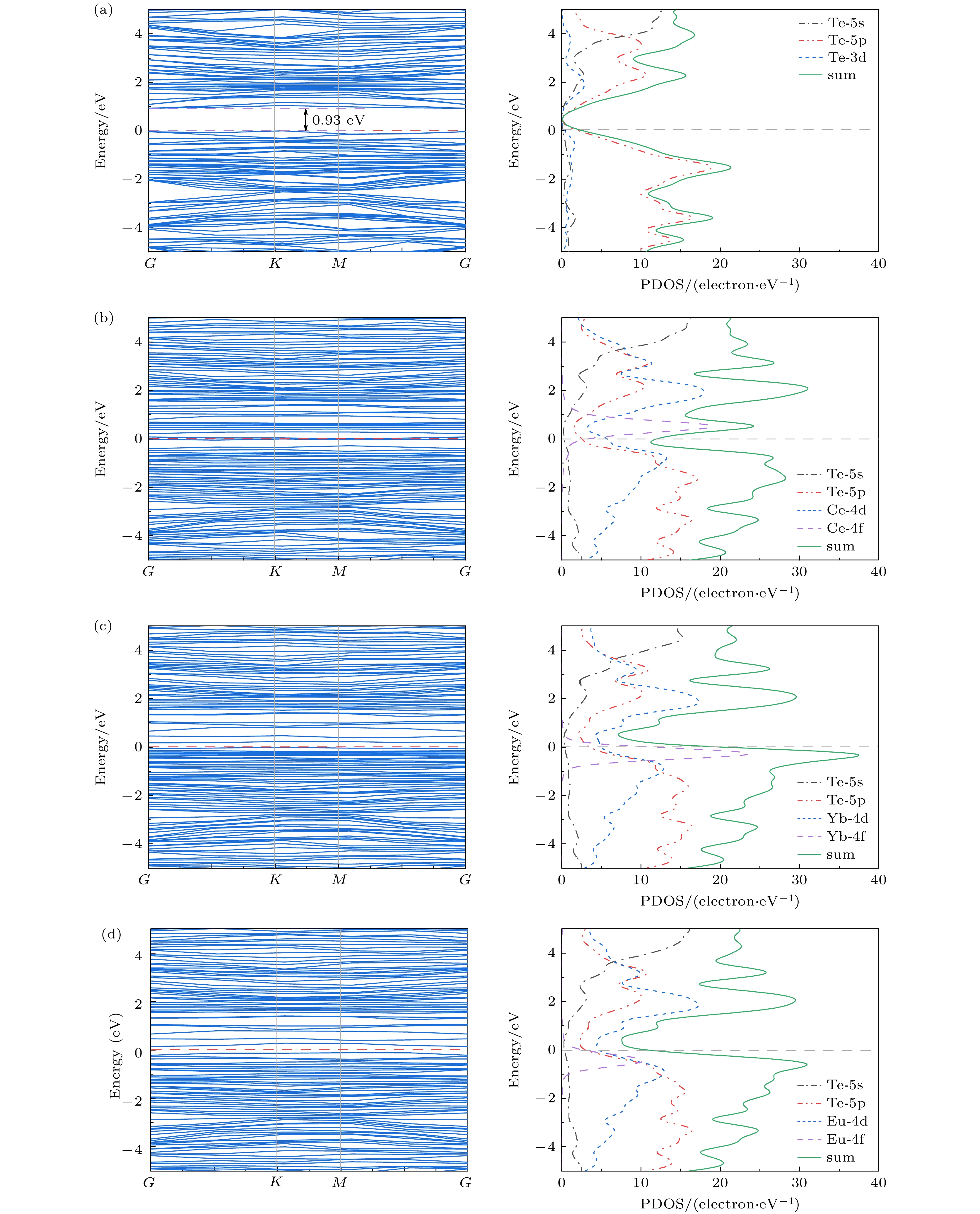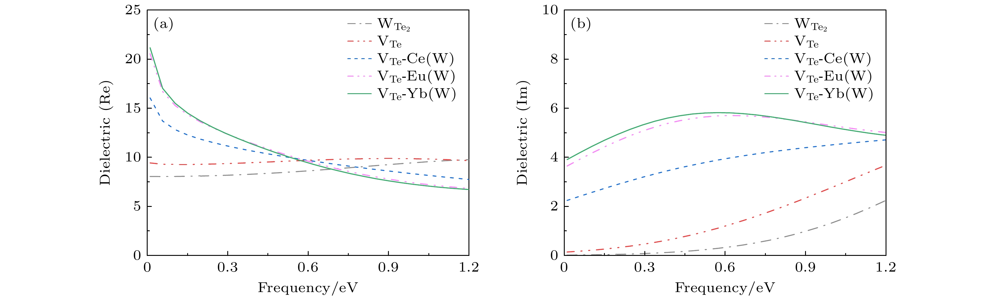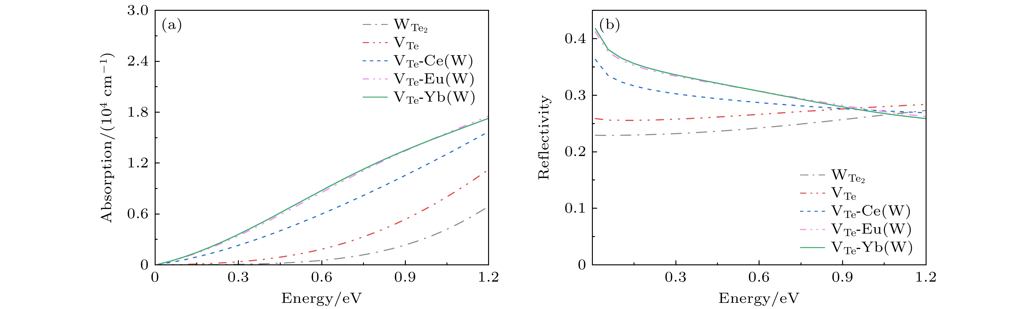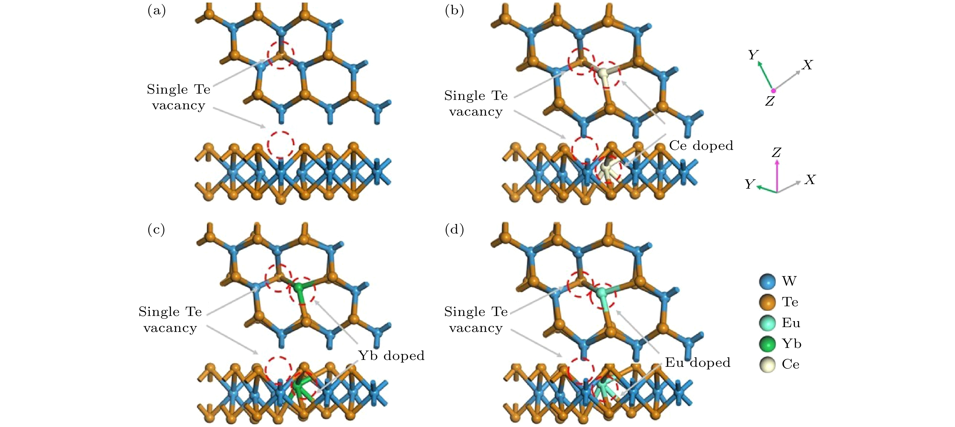 本文采用基于密度泛函理论的第一性原理平面波超软赝势方法, 计算了本征单层二碲化钨 (WTe2)、单碲空位缺陷(VTe)单层WTe2及稀土元素X (X = Ce, Yb, Eu)掺杂含VTe的单层WTe2 (VTe-X)的能带结构、电子态密度及光学性质, 以探究稀土掺杂与单碲空位缺陷的共同作用对单层WTe2光学性质的提升效果. 相较于VTe缺陷类型, VTe-X缺陷类型对单层WTe2材料在红外波段(0—1.2 eV)的光学性能提升更佳. 所有VTe-X缺陷类型均表现出金属性, 费米能级附近的电子态密度峰值显著增强. 其中VTe-Yb缺陷类型在红外范围内的吸收系数、反射率、静介电常数和介电函数虚部峰值较单层WTe2分别提升了3.76倍、1.83倍、2.63倍和24.20倍. 该研究为基于单层WTe2衬底的红外光传感器设计提供了理论依据.Using first-principles calculations based on density functional theory with a plane-wave ultrasoft pseudopotential approach, we conduct computations using the CASTEP (Cambridge Sequential Total Energy Package) module within the Materials Studio software. The electronic band structures, densities of states, and optical properties of intrinsic monolayer WTe2, monolayer WTe2 with a single tellurium vacancy (VTe), and rare-earth-doped VTe-containing monolayer WTe2 (VTe-X, where X = Ce, Yb, Eu) are systematically investigated to explore the synergistic effects of rare-earth doping and tellurium vacancy defects on the optical properties of monolayer WTe2. The results indicate that compared with the VTe model, the VTe-X models lead to a more pronounced enhancement of the optical performance in the infrared region (0–1.2 eV). All of VTe-X structures exhibit metallic characteristics, with a notable increase in the density of states near the Fermi level. In particular, the VTe-Yb model demonstrates significant improvement in the infrared range: the absorption coefficient, reflectivity, static dielectric constant, and peak value of the imaginary part of the dielectric function are enhanced by factors of 3.76, 1.83, 2.63, and 24.20, respectively, compared with those of pristine monolayer WTe2. This study provides a theoretical foundation for designing infrared photodetectors based on monolayer WTe2 substrates.