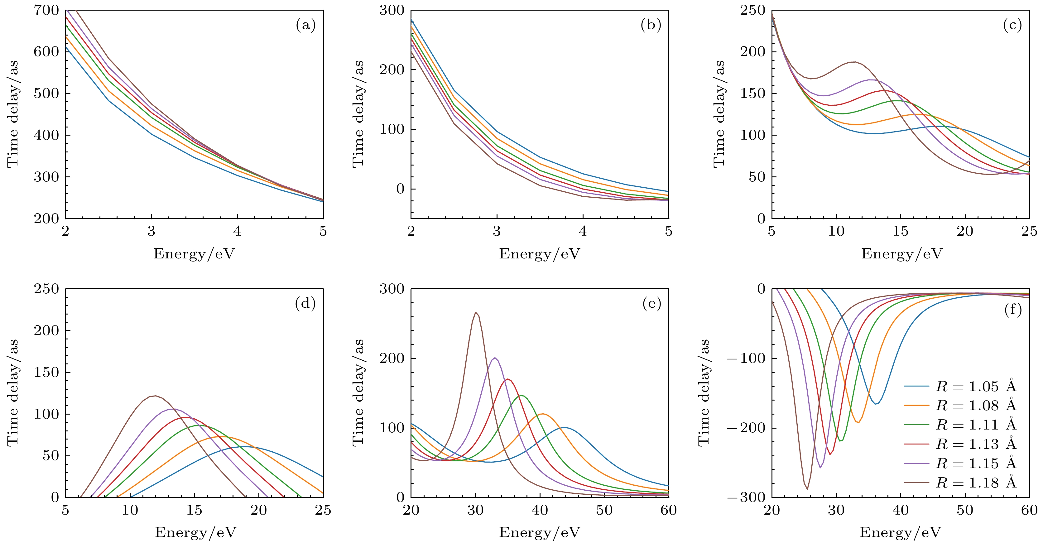 Fig. 3. Photoionization time delays of the CO molecule for electron emission along the oxygen and carbon ends in different energy intervals. Each subfigure shows the energy dependence of the time delay at various internuclear distances ($ R = 1.05 $–$ 1.18 $ Å); (a), (c), (e) correspond to low, shape resonance, and high energy ranges with emission along the oxygen end; (b), (d), (f) are for the same energy intervals with emission along the carbon end.