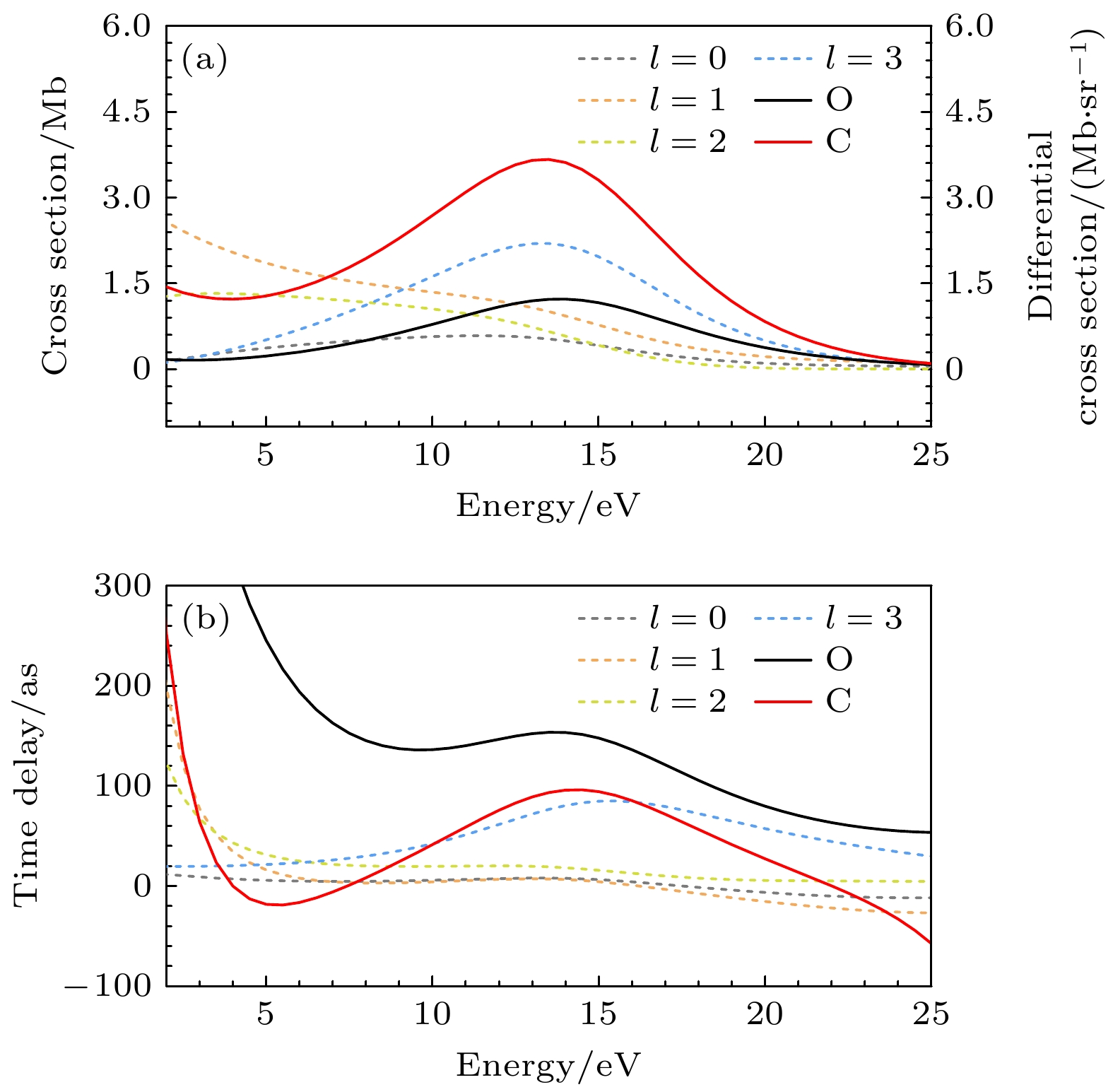 Fig. 4. Partial-wave (a) photoionization cross sections and (b) photoionization time delays for the CO molecule at the equilibrium internuclear distance ($ R = 1.13 $ Å), with orbital angular momentum quantum numbers $ l = 0-3 $, as functions of photoelectron energy. In panel (a), the red and black curves correspond to the differential cross sections for photoelectrons emitted along the C and O ends, respectively; in panel (b), the red and black curves correspond to the photoionization time delays for emission along the C and O ends, respectively.
