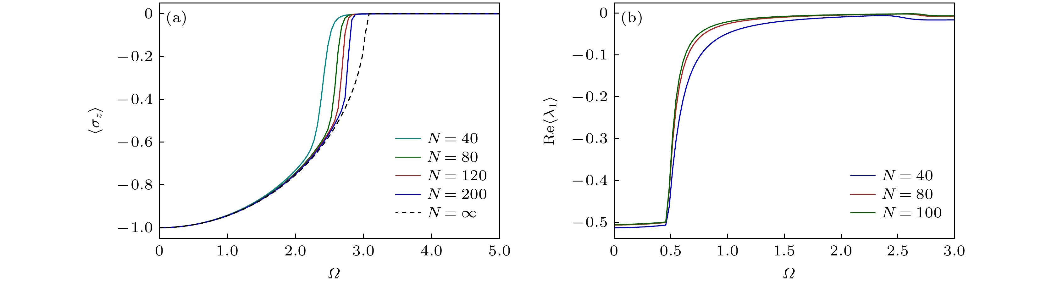 图 5 (a) 对有限维量子系统, 刘维尔能谱方法求解的$ \langle\sigma_z\rangle $稳态结果, 虚线为平均场近似的结果; (b) 刘维尔能谱的最慢模式本征值实部$ {\mathrm{Re}}(\lambda_{1}) $随Ω的变化; 两图对应$ V=3\varGamma $