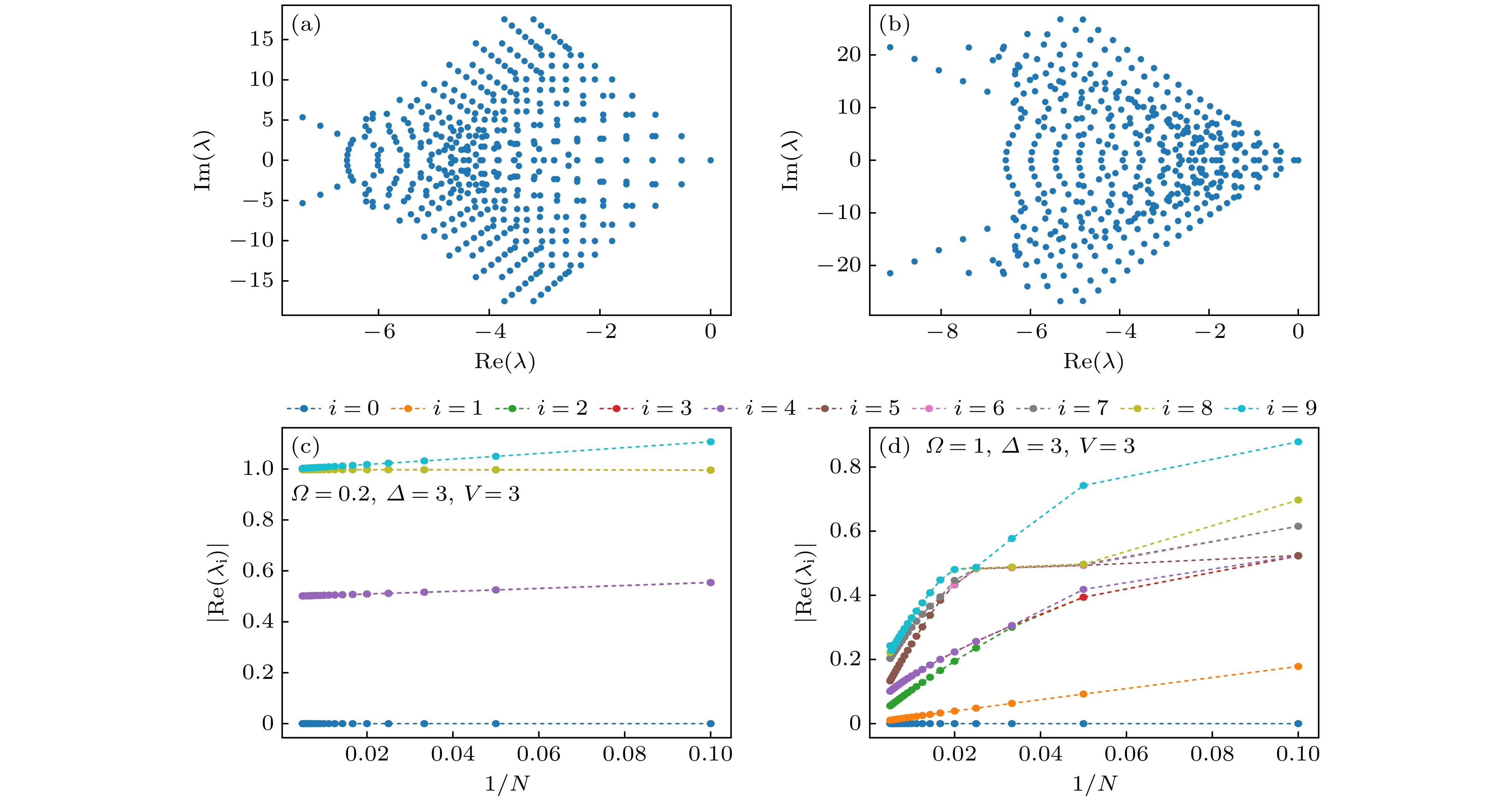 Fig. 7. (a), (b) Liouville spectra for $ \varOmega=0.2\varGamma $ and $ \varOmega=1\varGamma $, respectively, in a system with $ N=20 $, the spectral gap in (b) is significantly smaller than that in (a); (c), (d) finite size scaling for the real part of the Liouvillian eigenvalues in the SP phase (c) and SP/OSC phase (d), the index i labels the eigenvalues, the Liouvillian eigenvalues $ \lambda_i $ are ordered as a function of their real part ($ |{\mathrm{Re}}(\lambda_i)|\le |{\mathrm{Re}}(\lambda_{i+1})| $ and $ i=0 $ has zero real part), in SP phase, convergence of the Liouvillian gap to zero does not occur with increasing N, while in OSC phase they scale to zero as system size increase.
