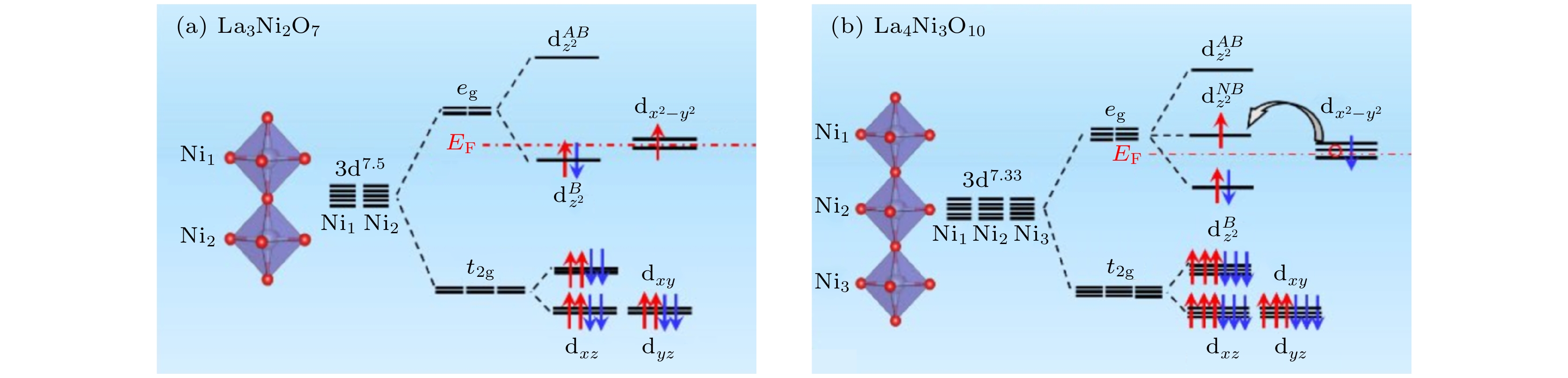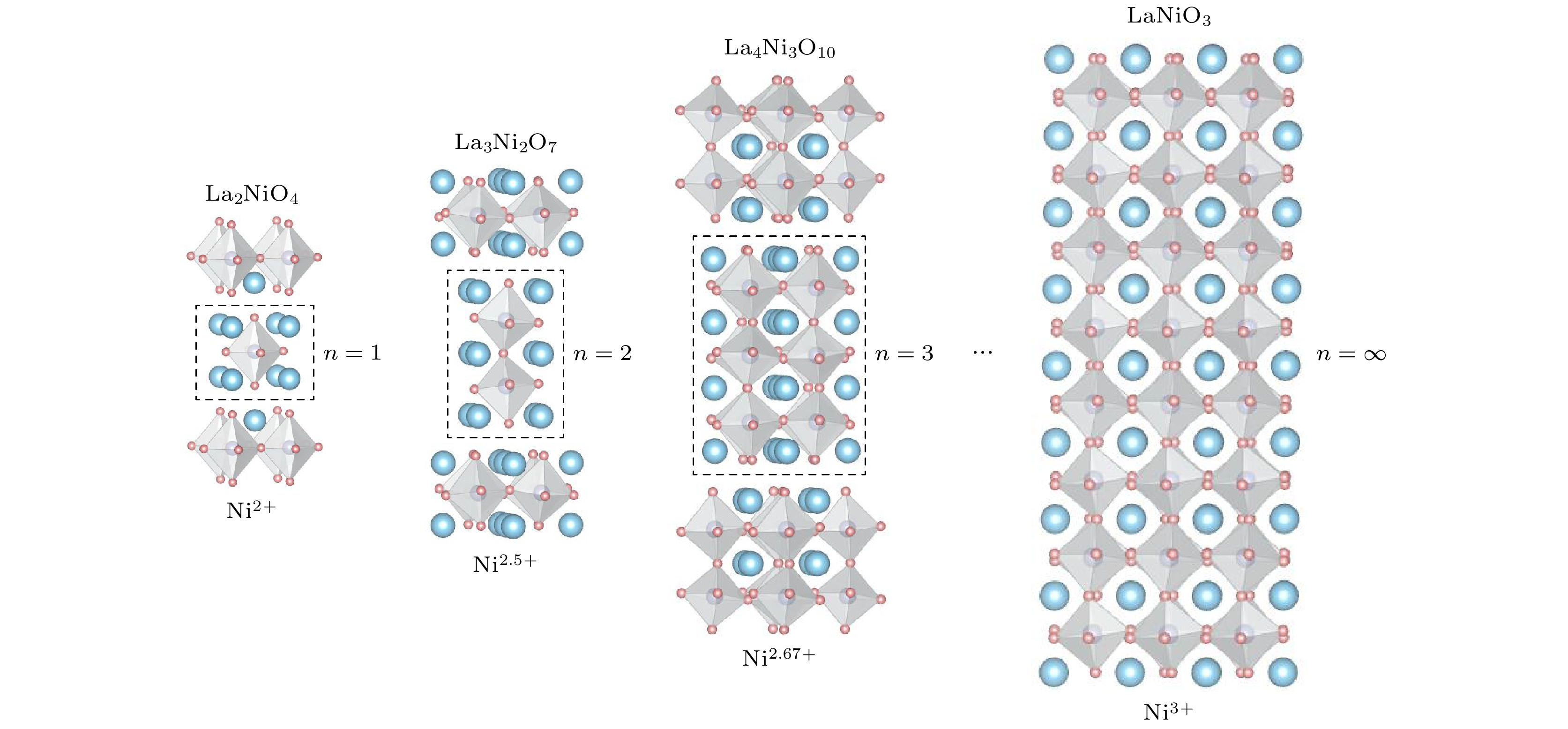 图 1 Ruddlesden-Popper相Lan+1NinO3n+1. 从左至右分别为La2NiO4, La3Ni2O7, La4Ni3O10和LaNiO3; 蓝色、紫色、红色小球分别代表La, Ni和O原子, 虚线框内结构代表不同n值下的层数变化