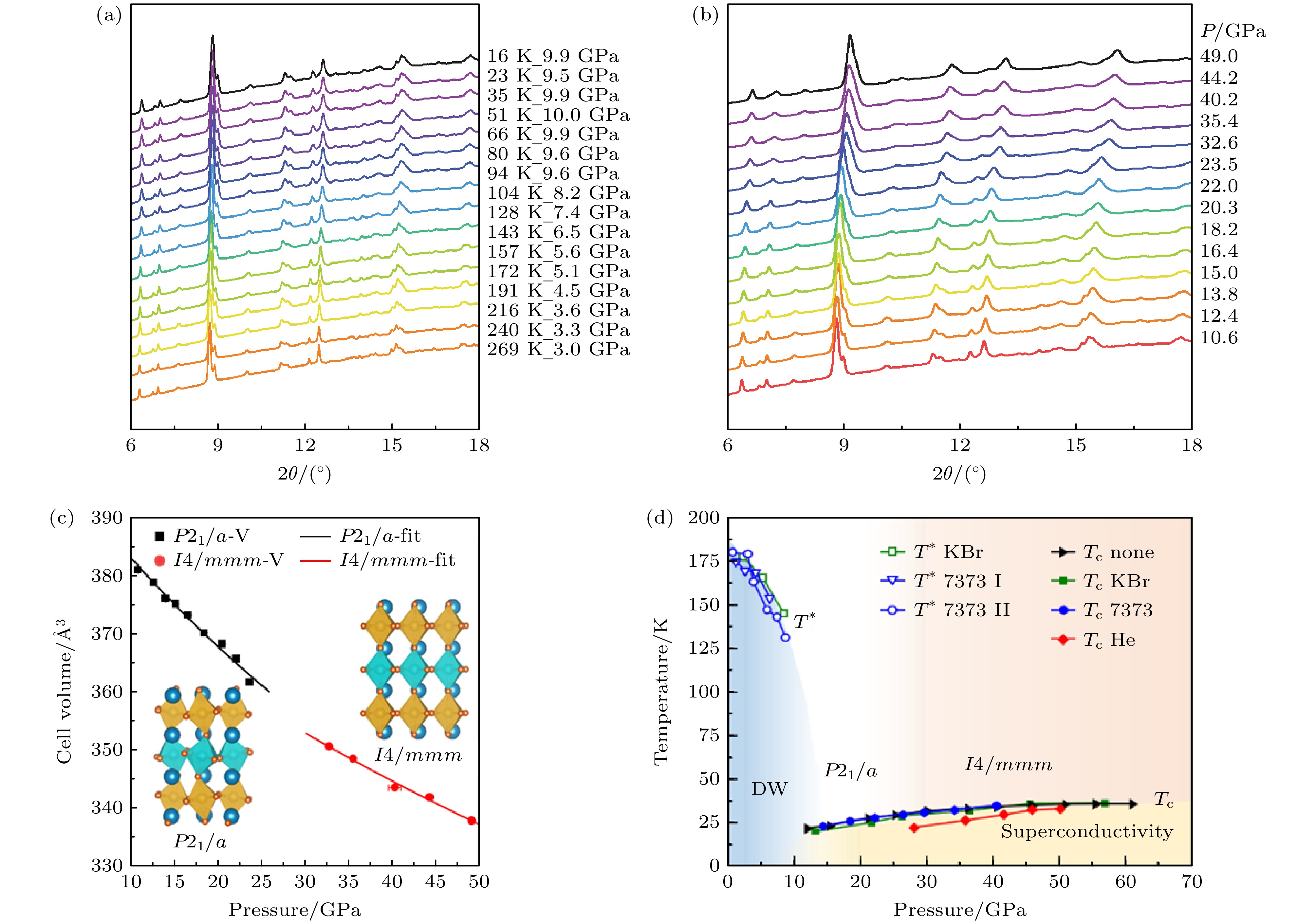 图 10 压力下Pr4Ni3O10单晶的结构相变 (a), (b) 降温与加压过程中Pr4Ni3O10的同步辐射X射线衍射图谱; (c) 压力下Pr4Ni3O10的晶胞体积变化; (d) 压力下Pr4Ni3O10的超导相图
