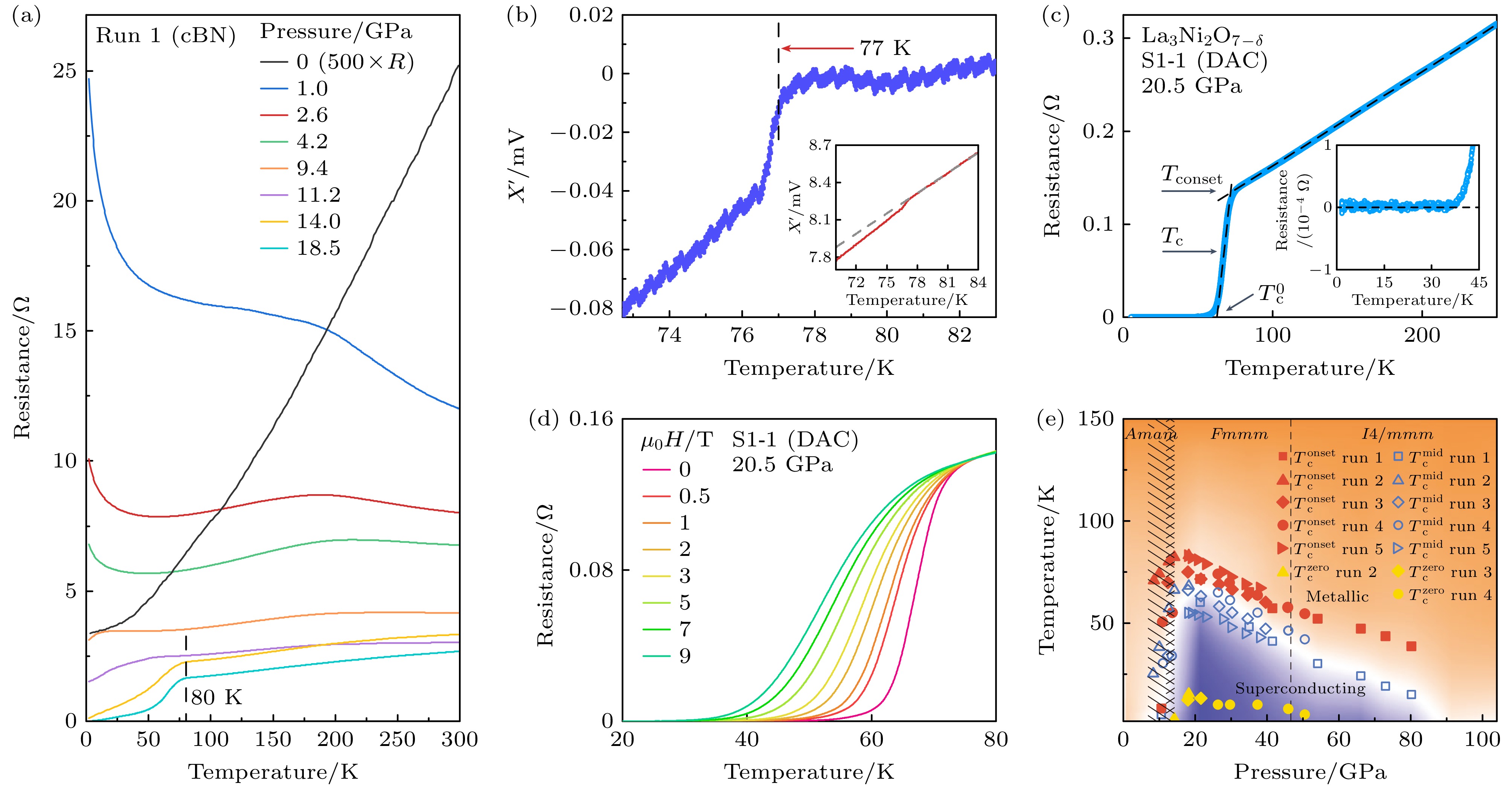 Fig. 2. Superconductivity of La3Ni2O7 single crystal under pressure: (a) Resistance curves of La3Ni2O7 measured with solid as pressure-transmitting medium (cubic boron nitride)[2]; (b) the a.c. susceptibility of La3Ni2O7 under pressure[2]; (c) the zero resistance and strange metal behavior of La3Ni2O7 with liquid as pressure-transmitting medium (Daphne 7373)[19]; (d) resistance curves of La3Ni2O7 under various magnetic fields[19]; (e) superconductivity phase diagram of La3Ni2O7 under pressure[21].