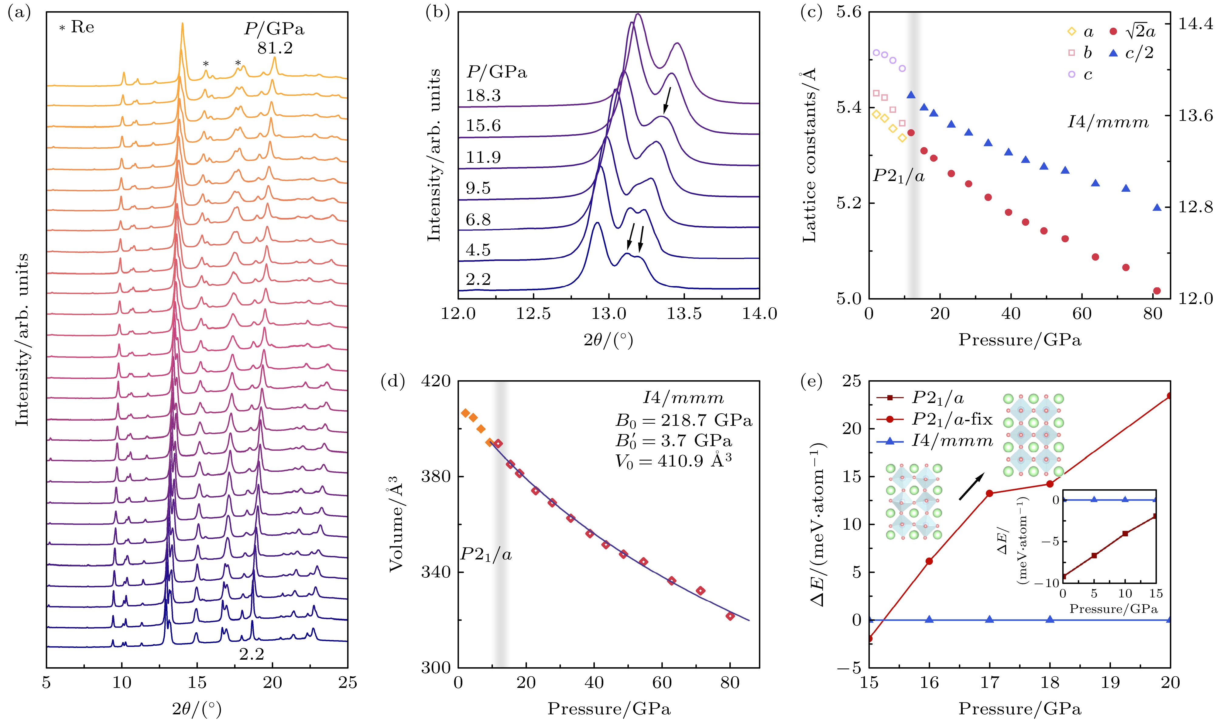 图 6 压力下La4Ni3O10单晶的结构相变[3] (a), (b) 压力下La4Ni3O10的同步辐射X射线衍射; 压力下La4Ni3O10的晶胞参数(c)和体积(d)变化; (e) P21/a和I4/mmm空间群的焓差随压力的变化