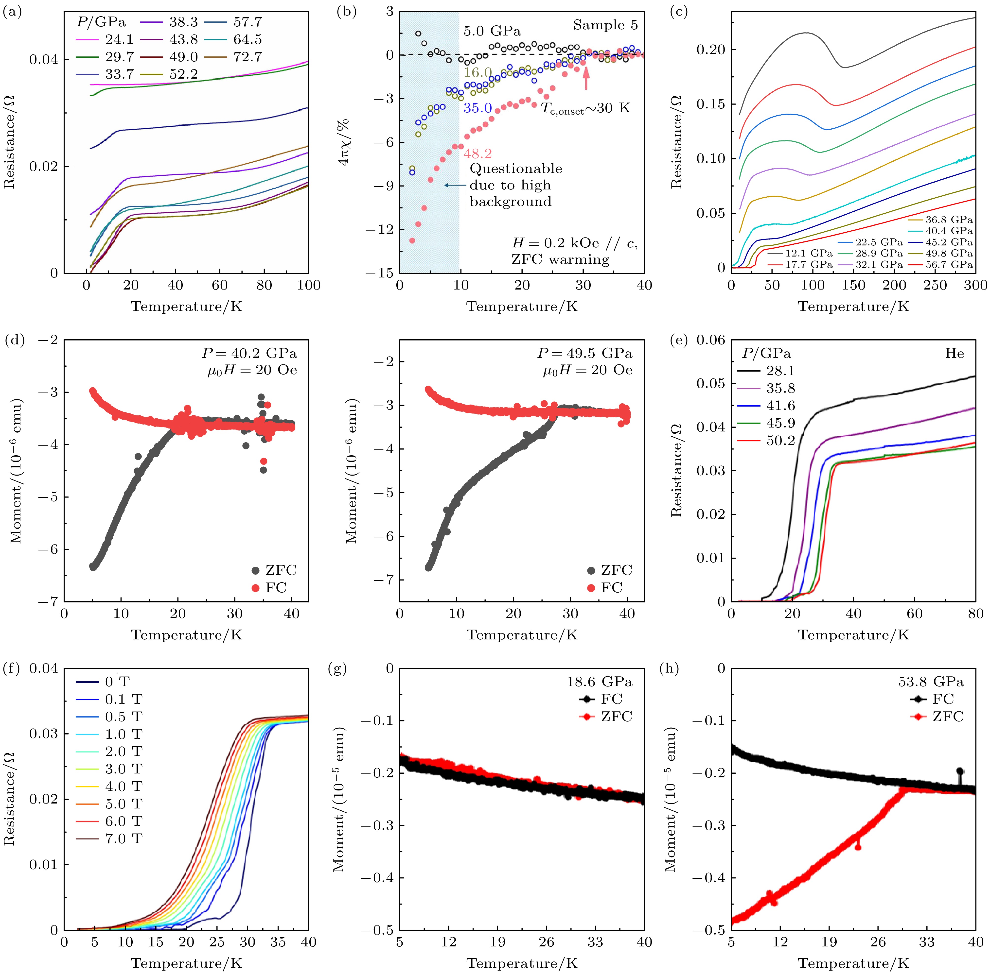 图 9 压力下Pr4Ni3O10单晶的超导电性[6,53] (a), (b) 液体传压介质(矿物油)下单晶的电阻曲线和直流磁化率[53]; (c), (d) 气体传压介质下单晶的电阻曲线(氦气)[6]和直流磁化率(氖气)[6]; (e), (f) 气体传压介质(氦气)下的零电阻及其在不同磁场下的电阻曲线[5]; (g), (h) 气体传压介质(氖气)下的直流磁化率[5]