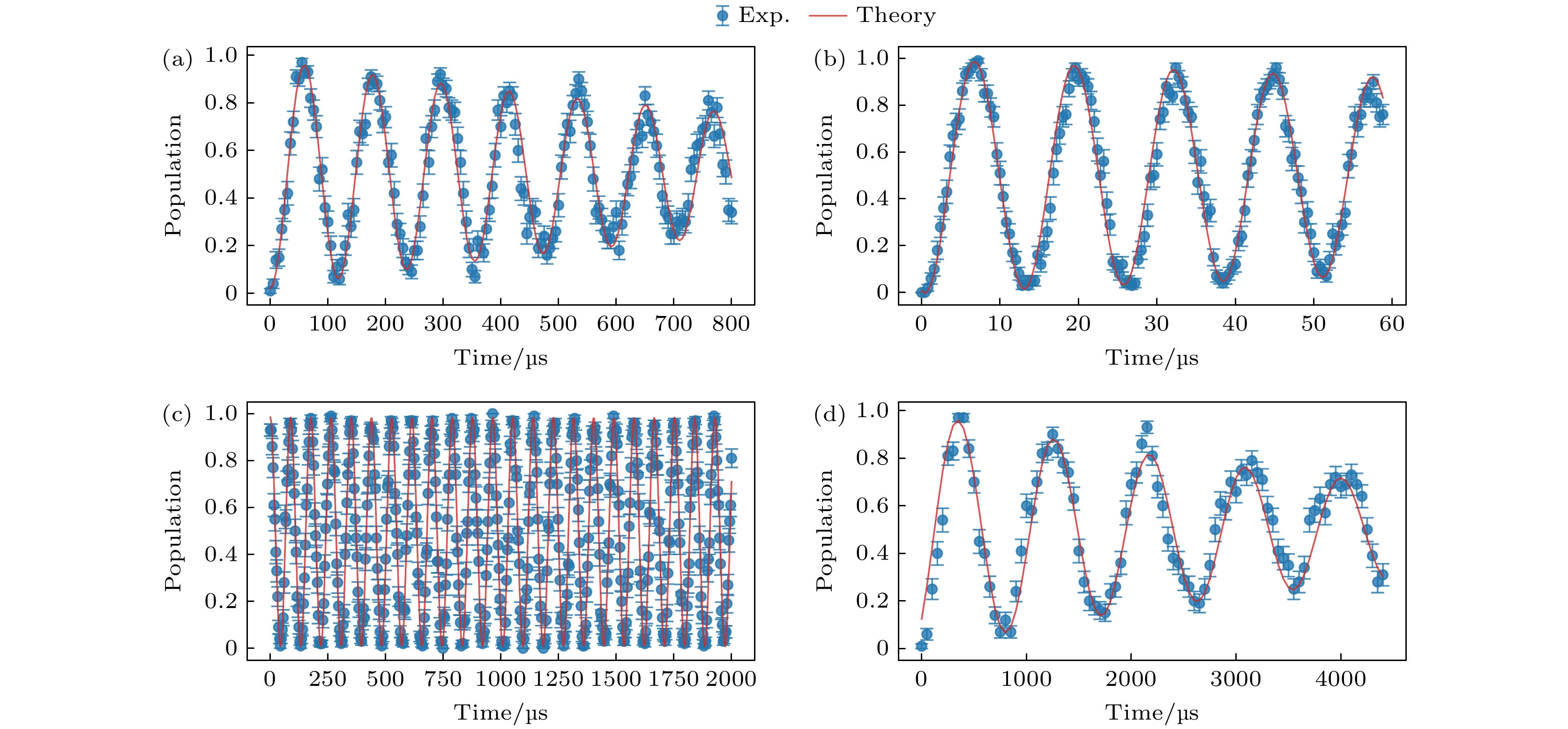 图 5 离子可分辨的多离子蓝边带Rabi振荡曲线. 实验数据由点表示, 理论曲线由线条表示, 离子序号按照从左到右的顺序标记为1-5(6). 实验误差棒表示估计的投影测量不确定度. (a) 5个离子第2个轴向模式的蓝边带振荡曲线. 模式频率约691 kHz, 失谐为0. (b) 5个离子第3个轴向模式的蓝边带振荡曲线. 模式频率约962 kHz, 失谐为$ 0.2 \varOmega_{0, 1} $. (c) 5个离子第5个轴向模式的蓝边带振荡曲线. 模式频率约1219 kHz, 失谐为$ 0.08 \varOmega_{0, 1} $. (d) 6个离子第6个轴向模式的蓝边带振荡曲线. 模式频率约1464 kHz, 失谐为$ 0.06 \varOmega_{0, 1} $.