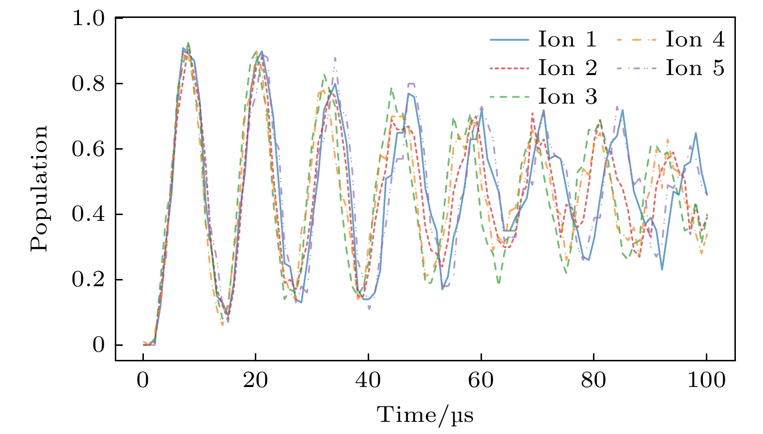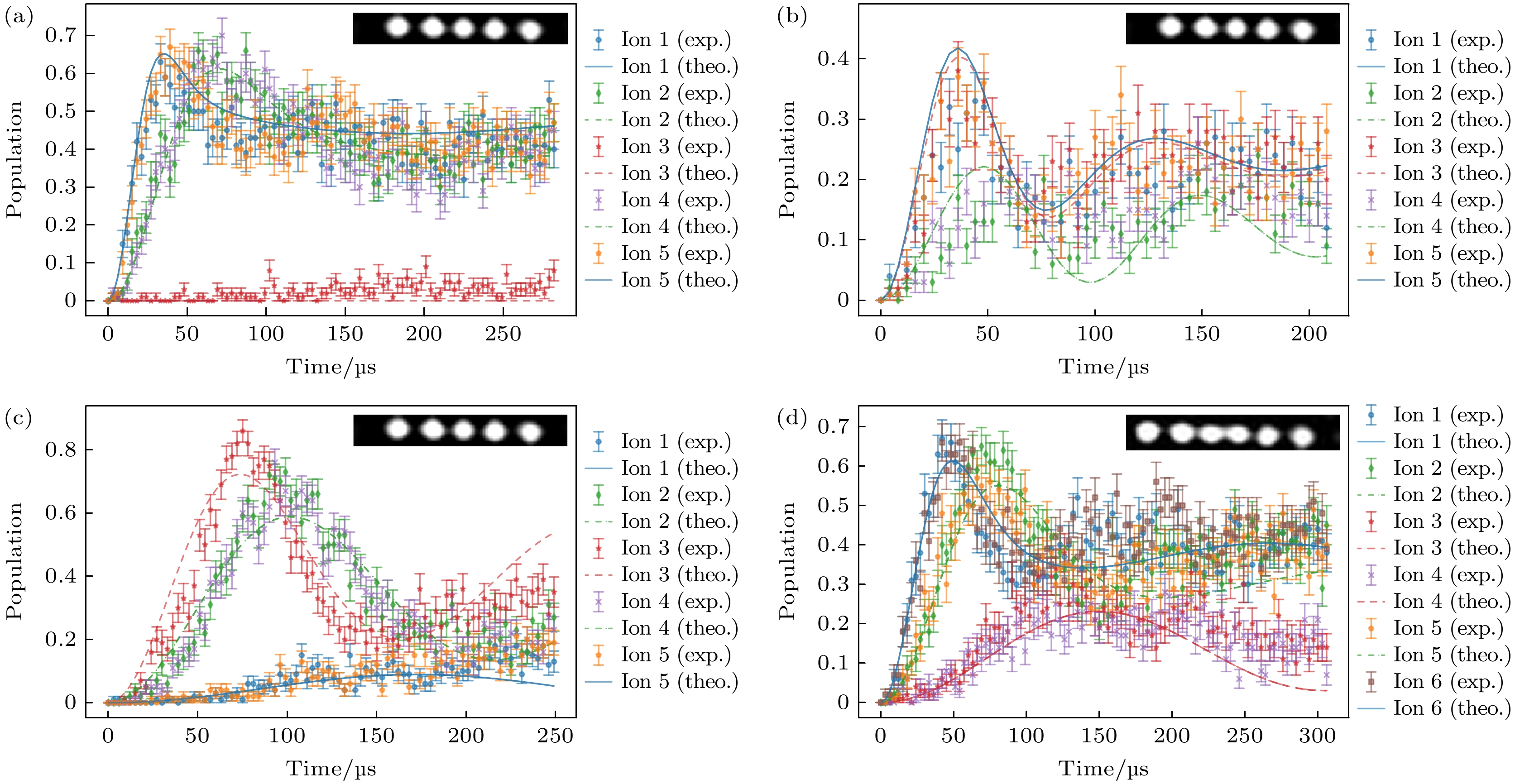 Fig. 5. Site-resolved blue-sideband Rabi oscillations for multiple ions. Experimental data are represented by points, with theoretical curves shown as lines. Ions are labeled 1 to 5 (6) from left to right. Error bars indicate the estimated projection measurement uncertainty. (a) Blue-sideband oscillations on the 2 nd axial mode of a 5-ion chain. Mode frequency: ≈691 kHz; detuning: 0. (b) Blue-sideband oscillations on the 3 rd axial mode of a 5-ion chain. Mode frequency: ≈962 kHz; detuning: $ 0.2 \varOmega_{0, 1} $. (c) Blue-sideband oscillations on the 5 th axial mode of a 5-ion chain. Mode frequency: ≈1219 kHz; detuning: $ 0.08 \varOmega_{0, 1} $. (d) Blue-sideband oscillations on the 6 th axial mode of a 6-ion chain. Mode frequency: ≈1464 kHz; detuning: $ 0.06 \varOmega_{0, 1} $.