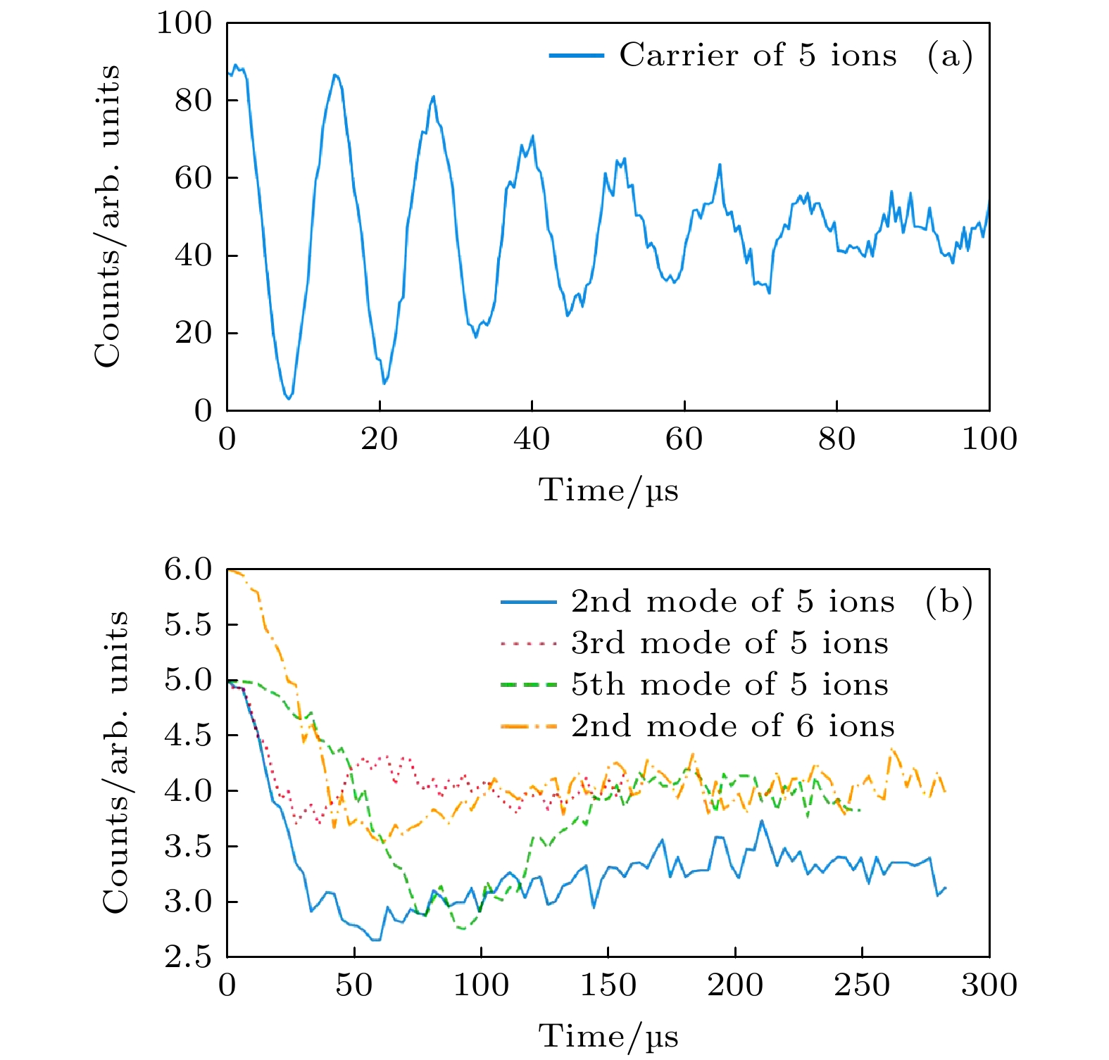 Fig. 7. Collective fluorescence measurement of multi-ion Rabi oscillations. (a) Collective fluorescence signal of the carrier transition for a 5-ion chain. (b) Collective fluorescence signal of the blue-sideband transition for 5- or 6-ion chains.