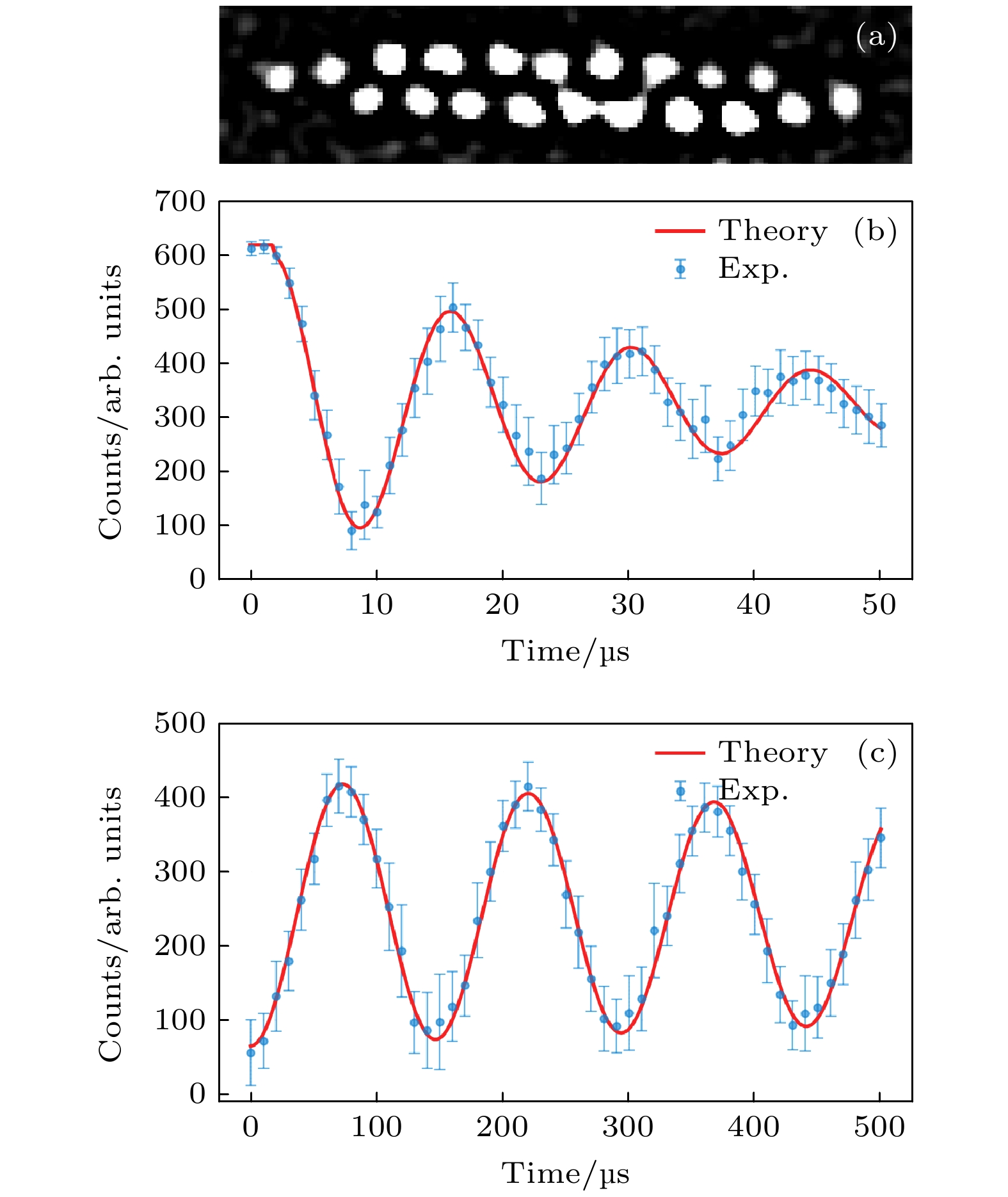 Fig. 8. Global coherent manipulation of 20 ions. (a) Fluorescence image of 20 ions crystallized into a two-dimensional zigzag configuration. (b) Laser-driven carrier transition Rabi oscillations between $ |\text{S}_{1/2}, m_j = -1/2\rangle $ and $ |\text{D}_{5/2}, $$ m_j = +1/2\rangle $. (c) Microwave-driven carrier transition Rabi oscillations between $ |\text{S}_{1/2}, m_j = -1/2\rangle $ and $ |\text{S}_{1/2}, m_j = +1/2\rangle $.