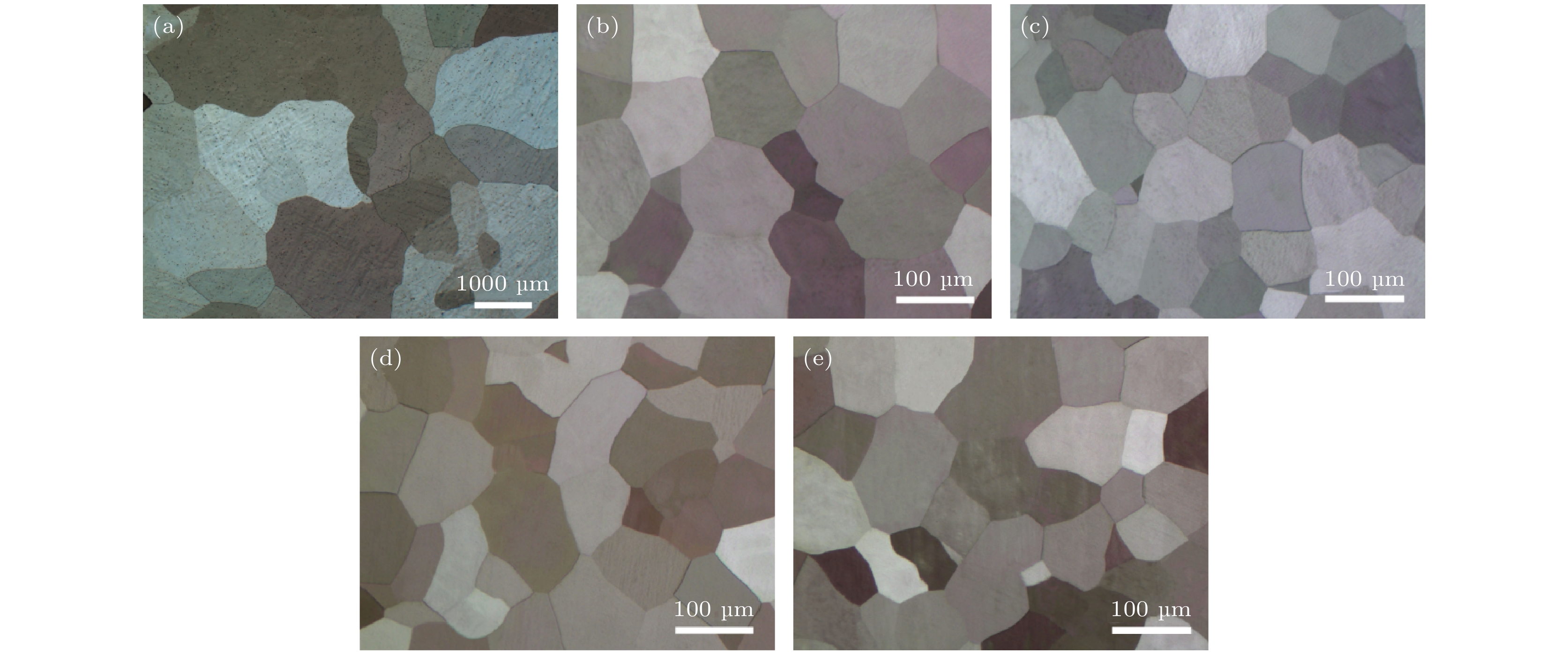 图 1 Al-2.5Mg合金OM图像 (a) 未添加Al-5Ti-1B和La; (b) 添加0.4% Al-5Ti-1B; (c) 添加0.4% Al-5Ti-1B+0.02% La; (d)添加0.4% Al-5Ti-1B+0.04% La; (e)添加0.4% Al-5Ti-1B+0.06%La