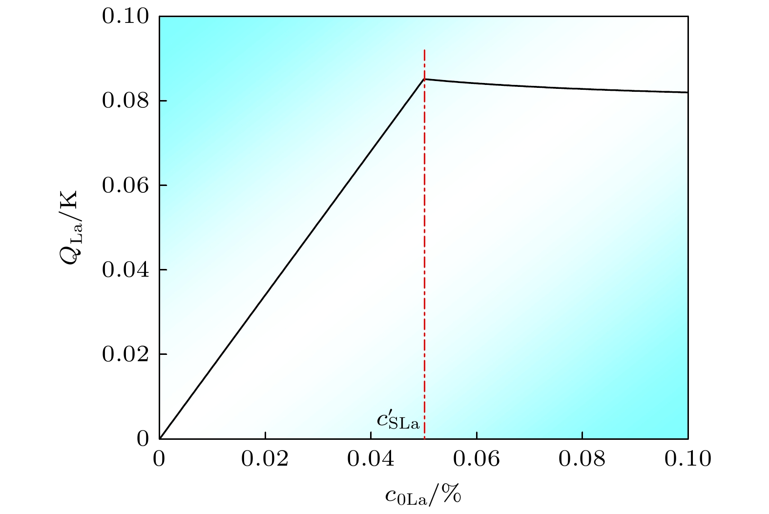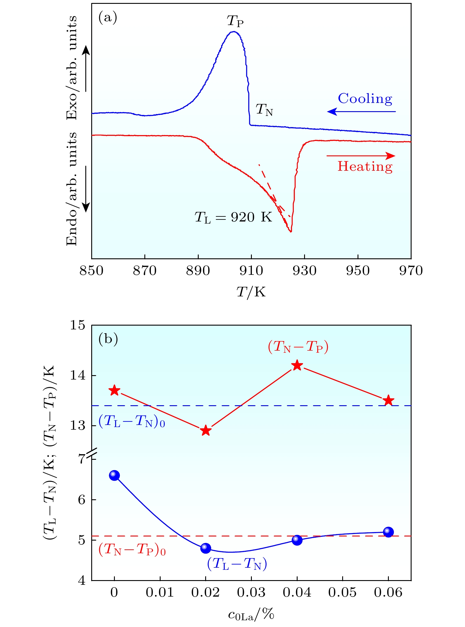 图 3 (a) Al-2.5Mg合金的DTA熔化和冷却曲线; (b) $ \left({T}_{\text{L}}- $$ {T}_{\text{N}}\right) $和$ \left({T}_{\text{N}}-{T}_{\text{P}}\right) $随La添加量($ {c}_{\text{0La}} $)的变化