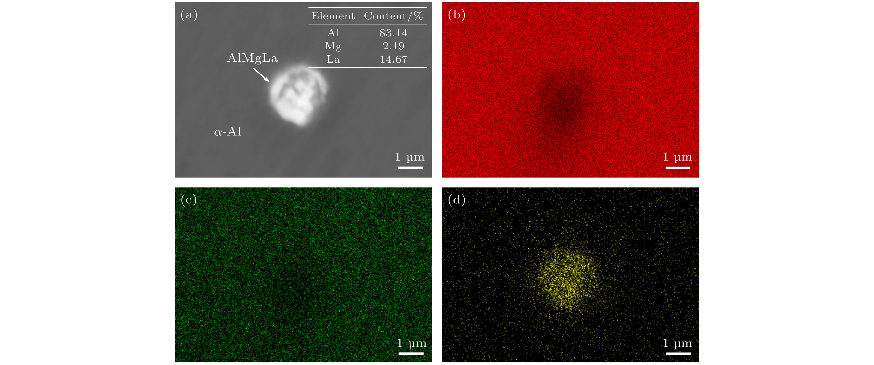 图 4 添加0.06% La的经0.4% Al-5Ti-1B处理的Al-2.5Mg合金 (a) SEM图, 插图为白色相的成分; (b) 元素Al, (c) 元素Mg, (d) La的X射线能量散谱图