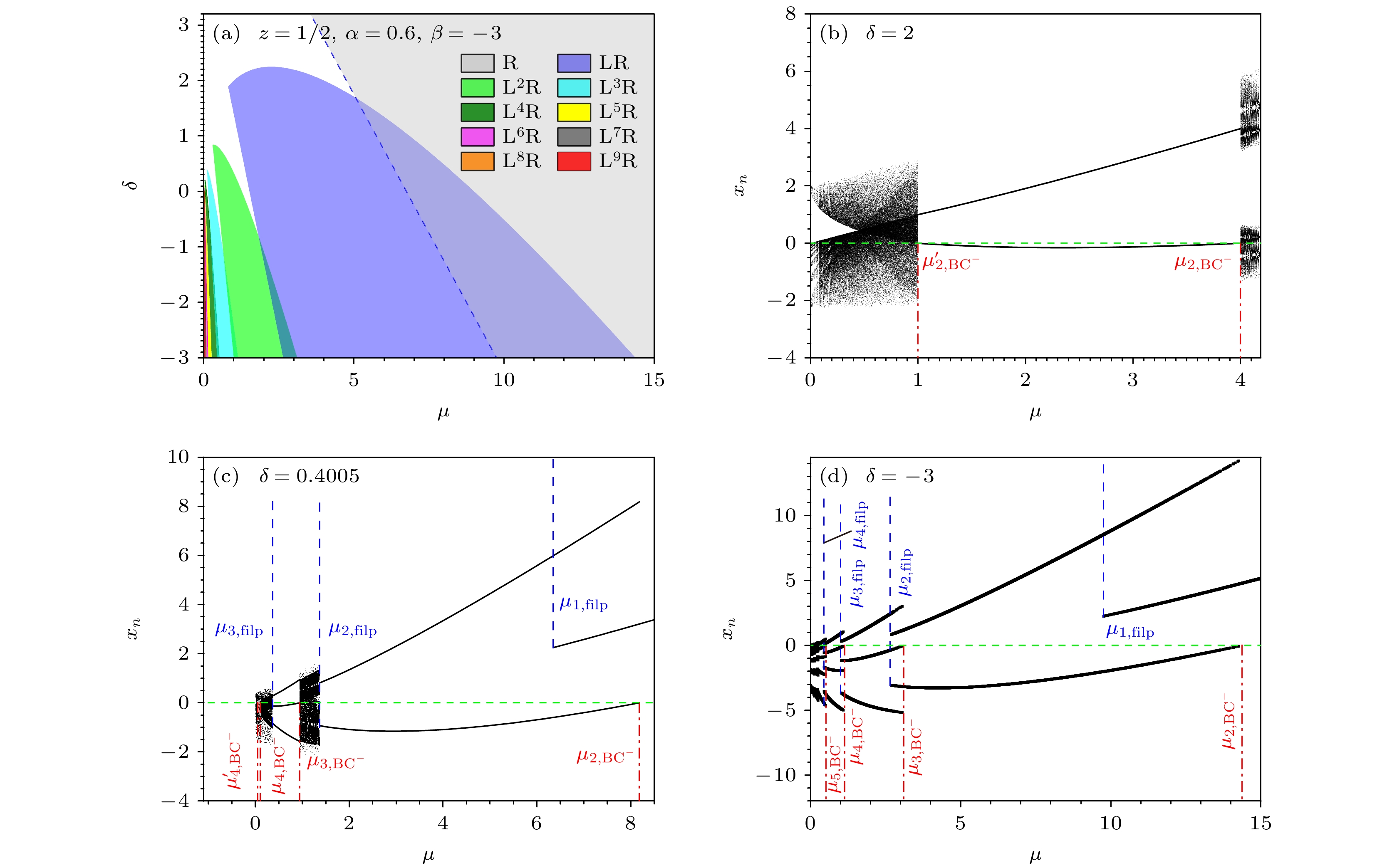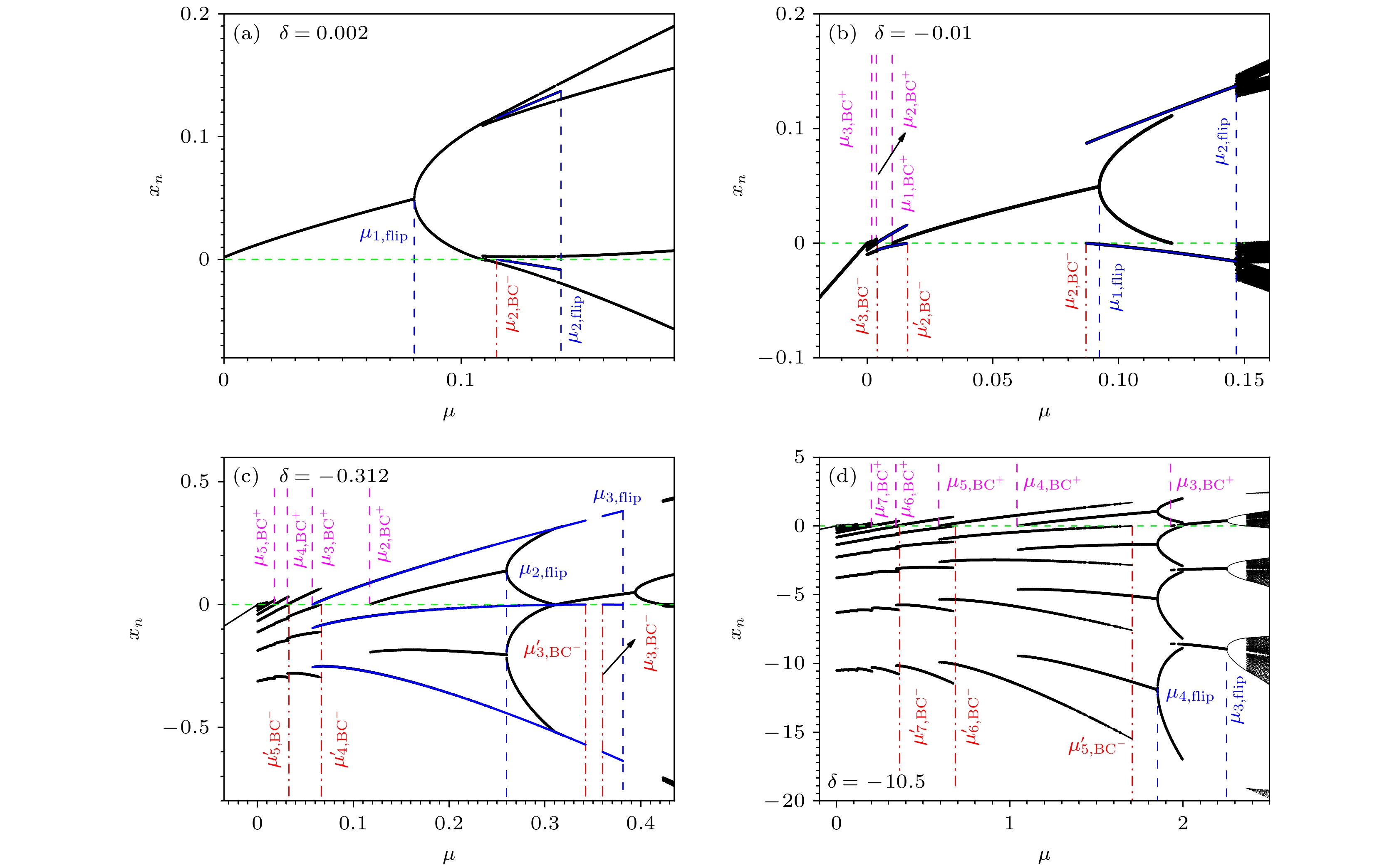 Fig. 5. Bifurcation diagrams when $ z=1.5 $, $ \alpha=0.6 $ and $ \beta=-3 $. (a), (b), (c) and (d) are the bifurcation diagrams for different δ. The green dashed horizontal lines mark the discontinuous border of the map. The vertical dashed-lines of blue, red and magenta colors indicate the analytical values $ \mu_{n, {\rm{flip}}} $, $ \mu_{n, {\rm{BC}}^{-}} $ and $ \mu_{n, {\rm{BC}}^{+}} $ of the critical control parameters for the flip, $ \rm BC^- $ and $ \rm BC^+ $ border collision bifurcations, respectively.