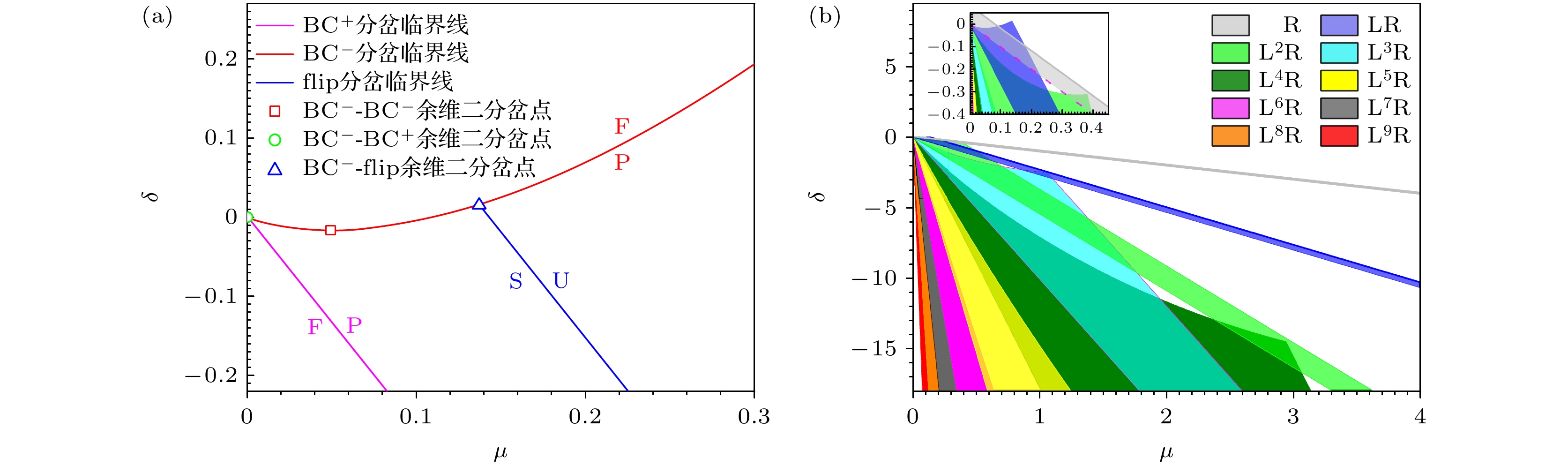 图 4 $ \mu-\delta $相平面中$ L^{n-1}R $周期轨道的分岔临界线($ z=1.5 $, $ \alpha=0.6 $, $ \beta=-3 $) (a) 临界线($ n=2 $), 红线、紫色和蓝色线分别为$ {\rm{BC}}^{-} $边界碰撞分岔、$ {\rm{BC}}^{+} $边界碰撞分岔和flip分岔的临界线; 红方框、绿圆圈和紫三角形分别是$ {\rm{BC}}^{-}-{\rm{BC}}^{-} $、$ {\rm{BC}}^{-}-{\rm{BC}}^{+} $和$ {\rm{BC}}^{-}-{\rm{flip}} $余维2分岔临界点. (b) $ L^{n-1}R $周期轨道稳定存在区域